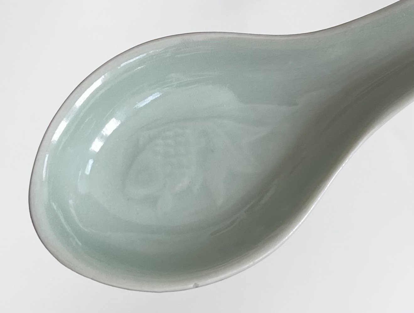 Vintage Celadon Soup Bowl Set Lot of 4 Bowls Matching Soup Spoons Signed Embossed Koi Goldfish Glazed Aqua Blue Green Seafoam Jade Greenware