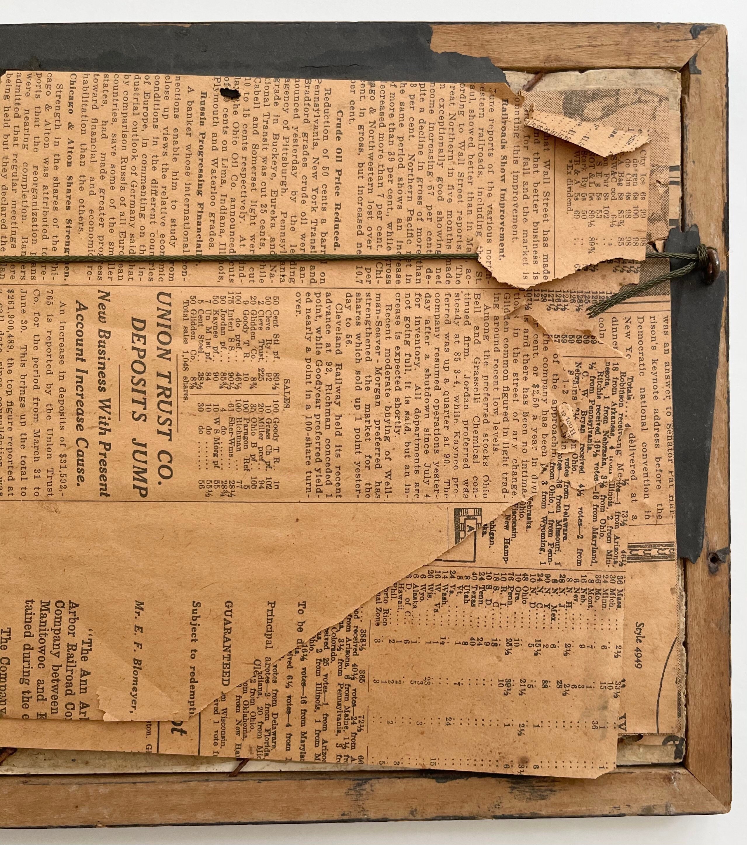 Fair, but charming, vintage condition with overall wear to image, frame and delicate newspaper backing
