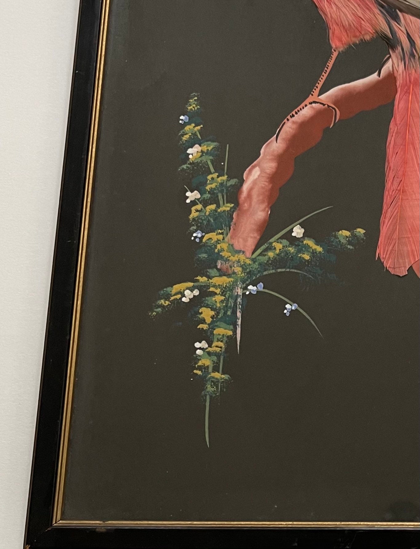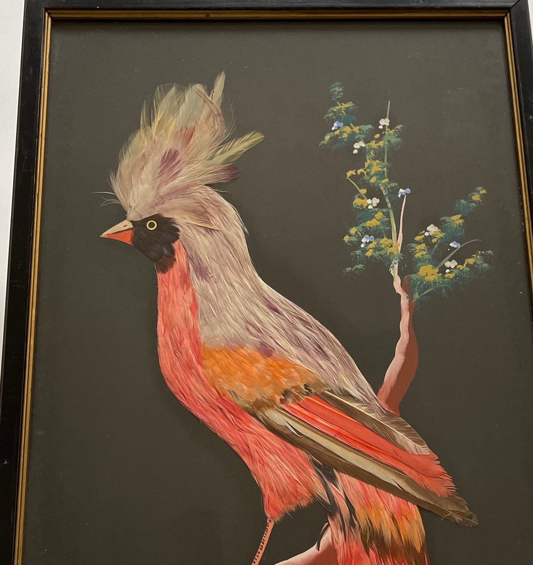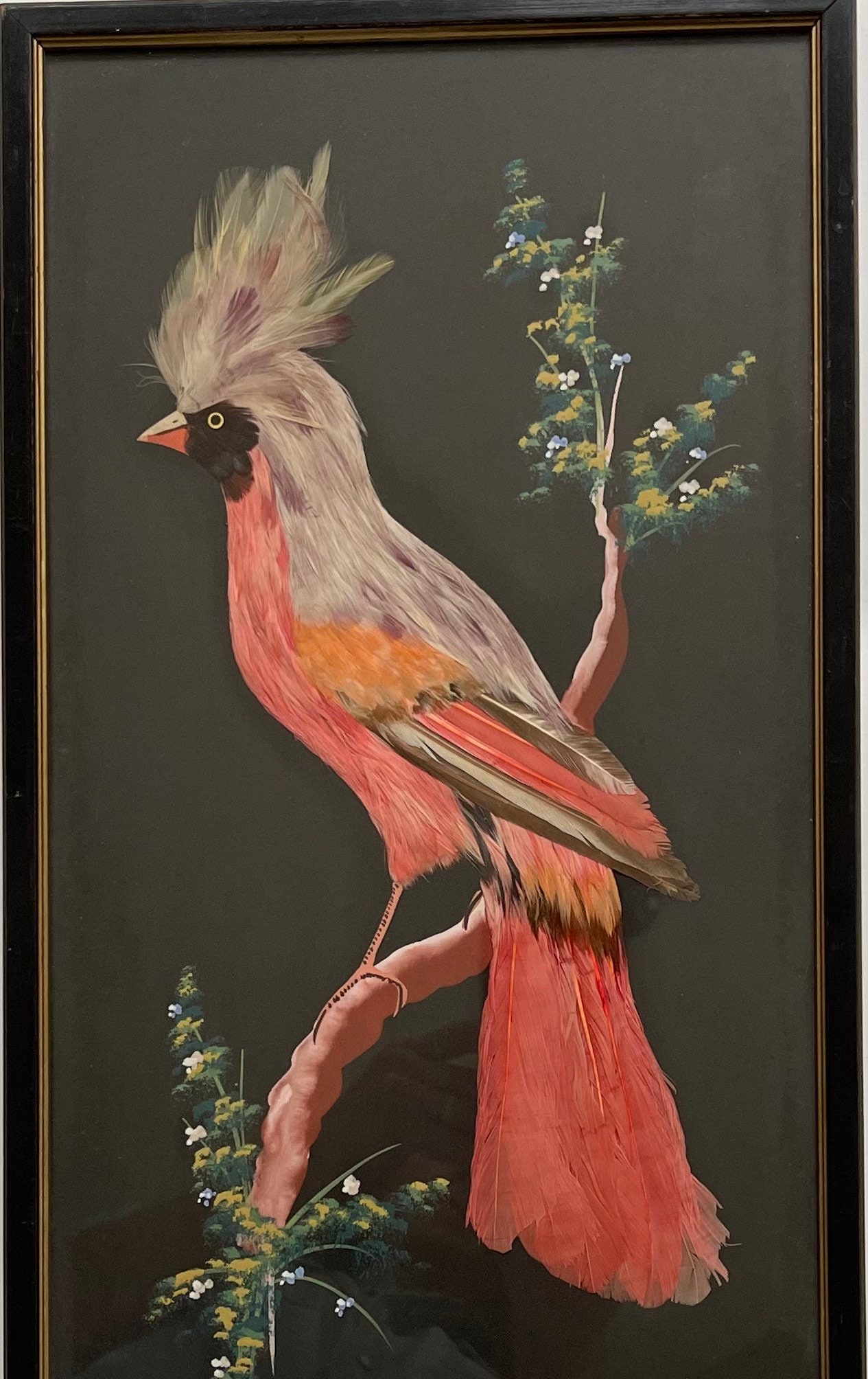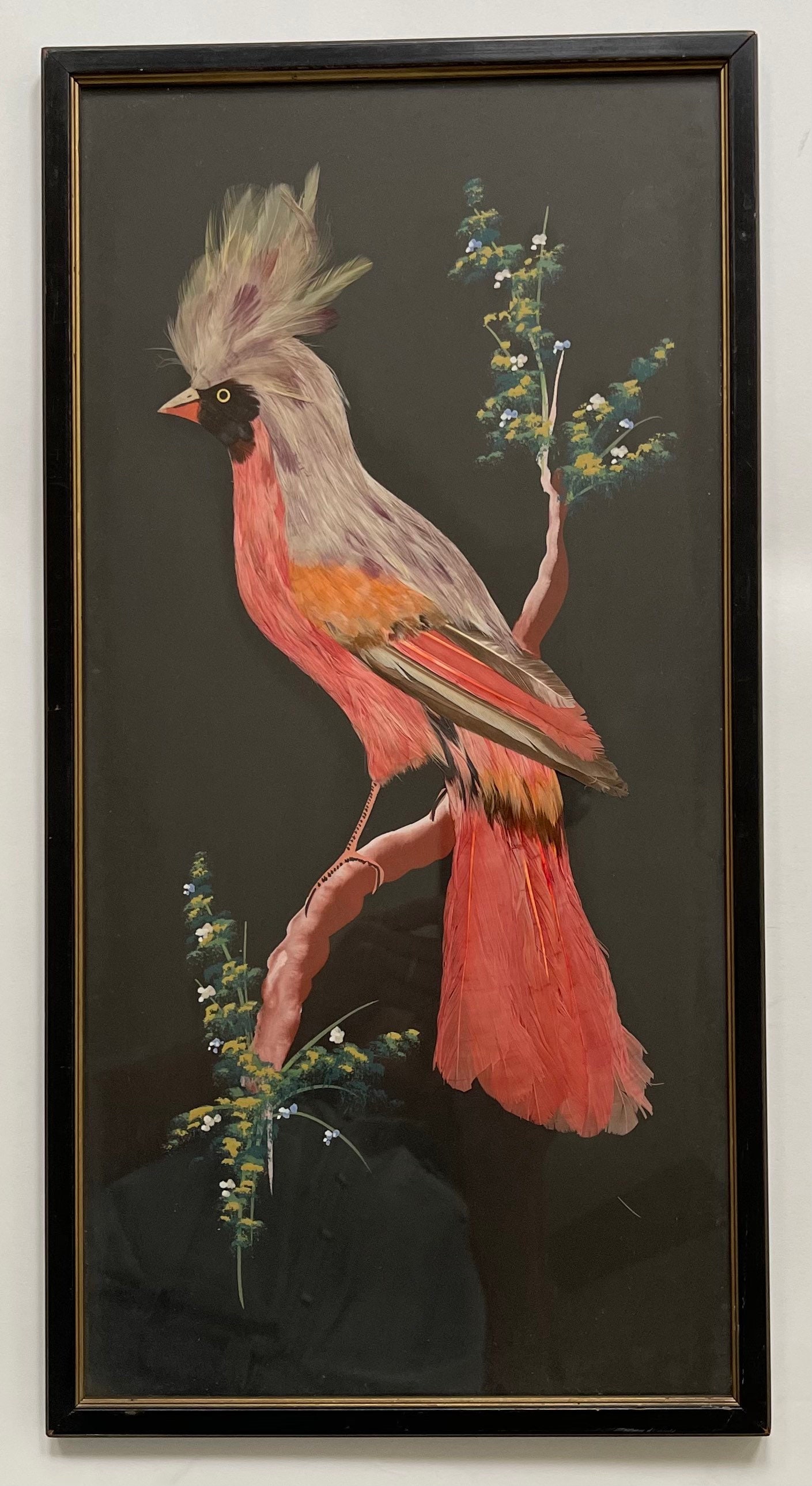 Vintage 30's Mexican feather art bird paintings with rustic black wood frame