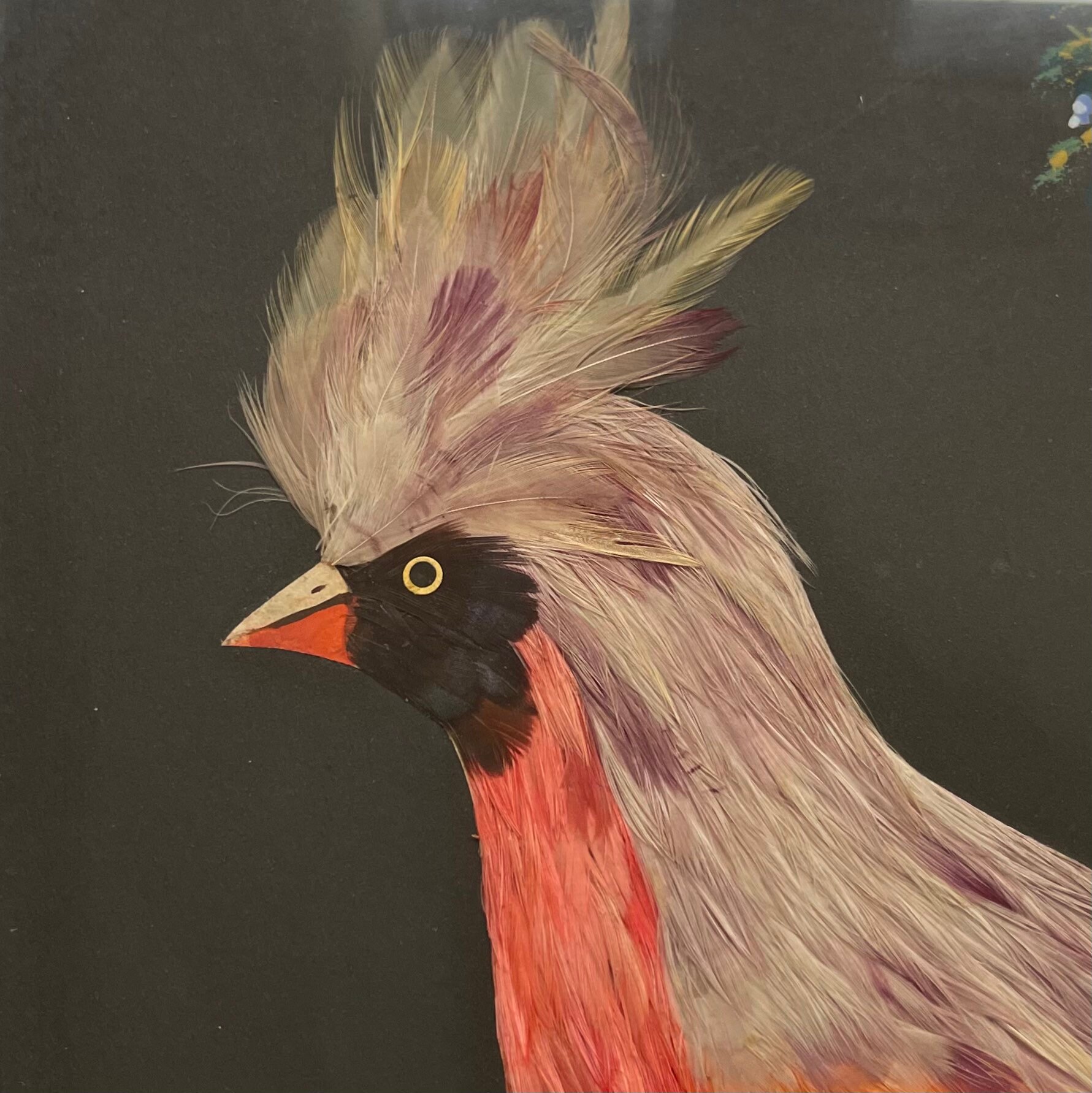 Mexican Bird Feather Art Painting Vintage 30s Made in Mexico Mexican Folk Art Nature Animal Feathers Black Background Vertical Alignment