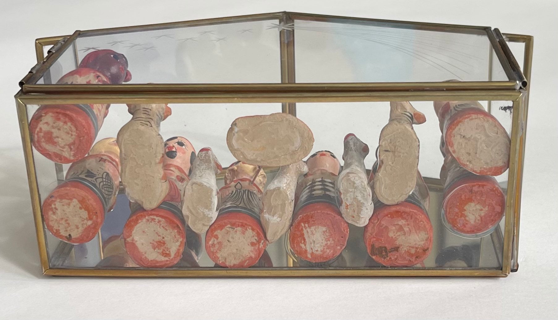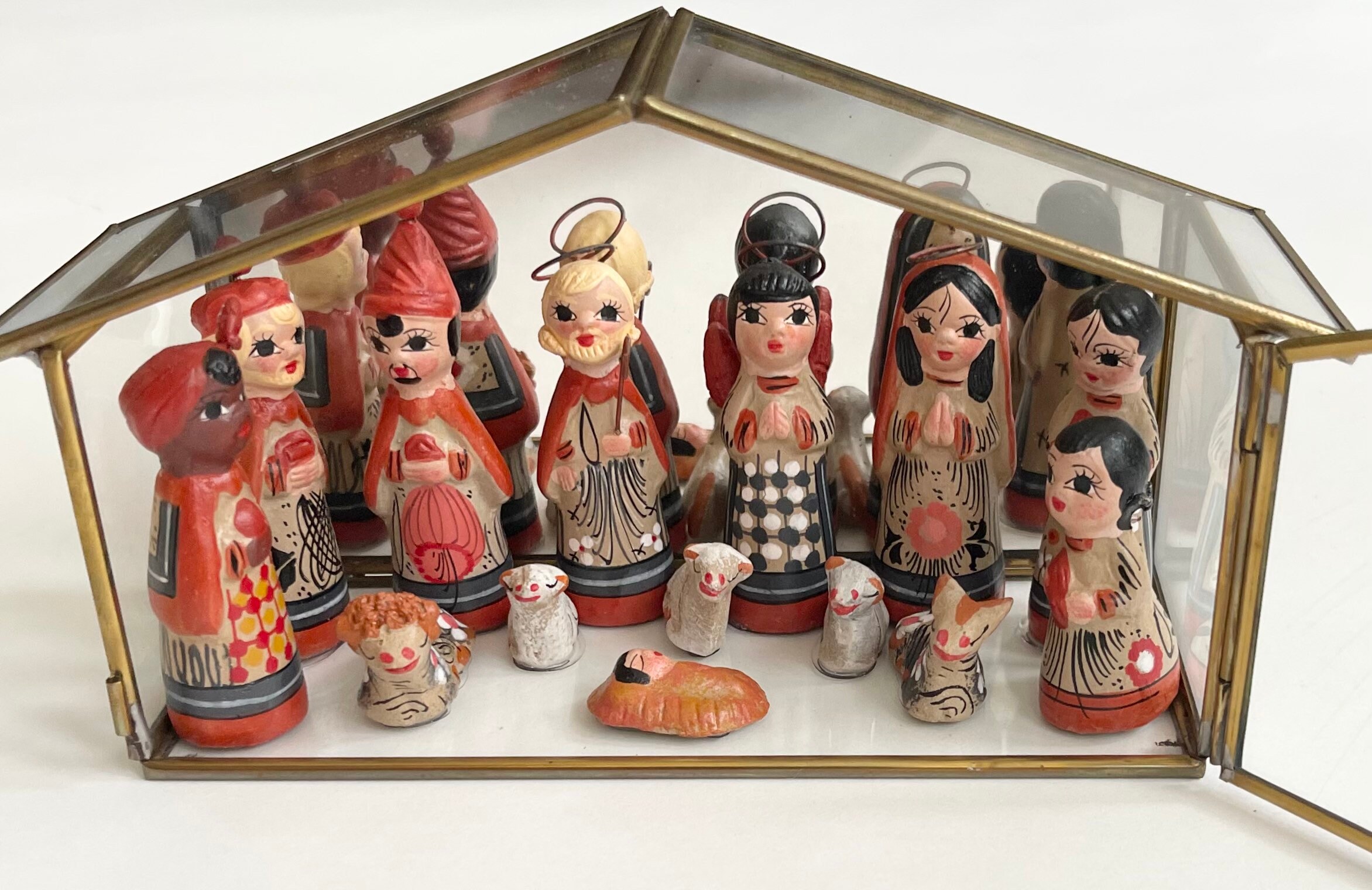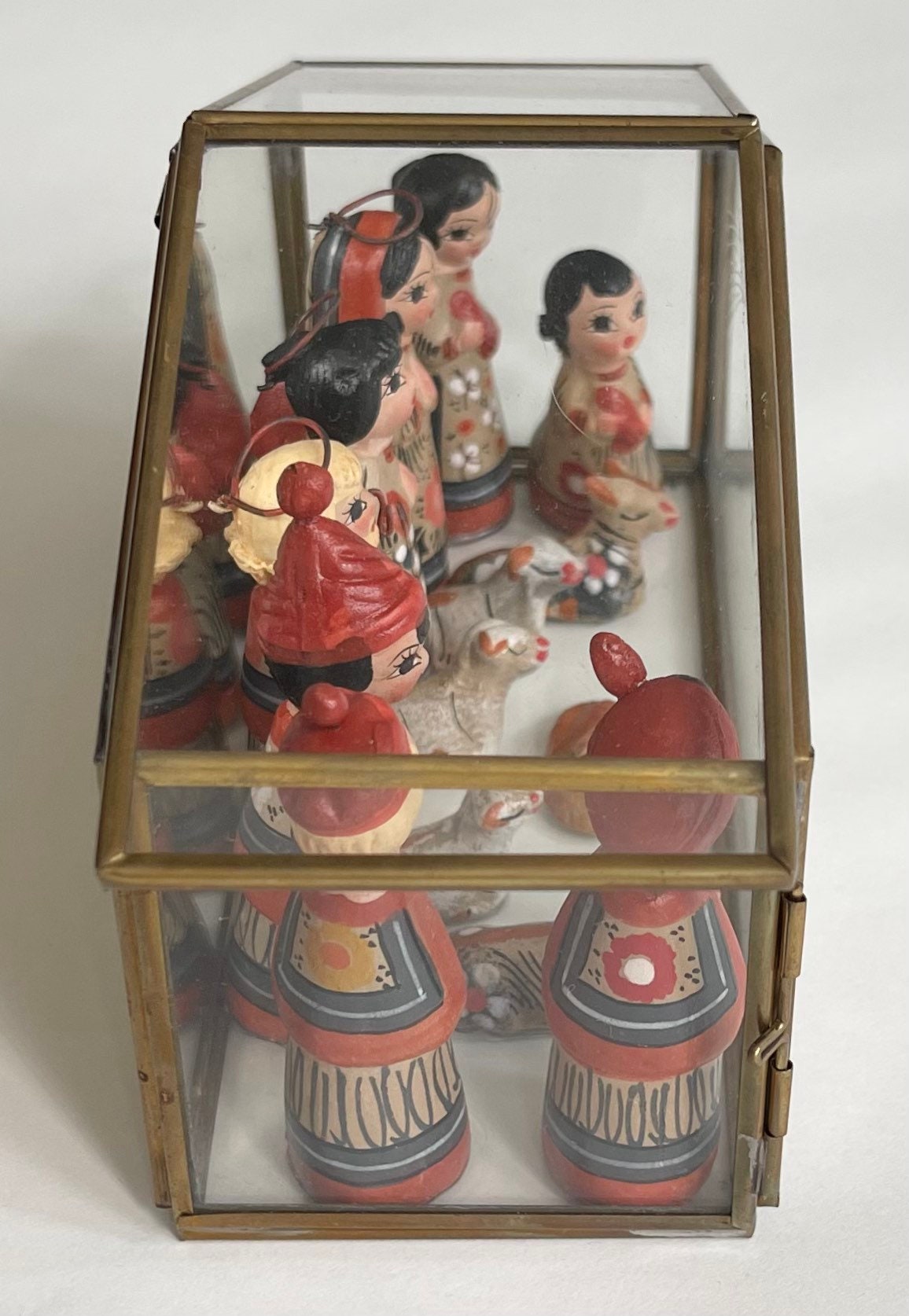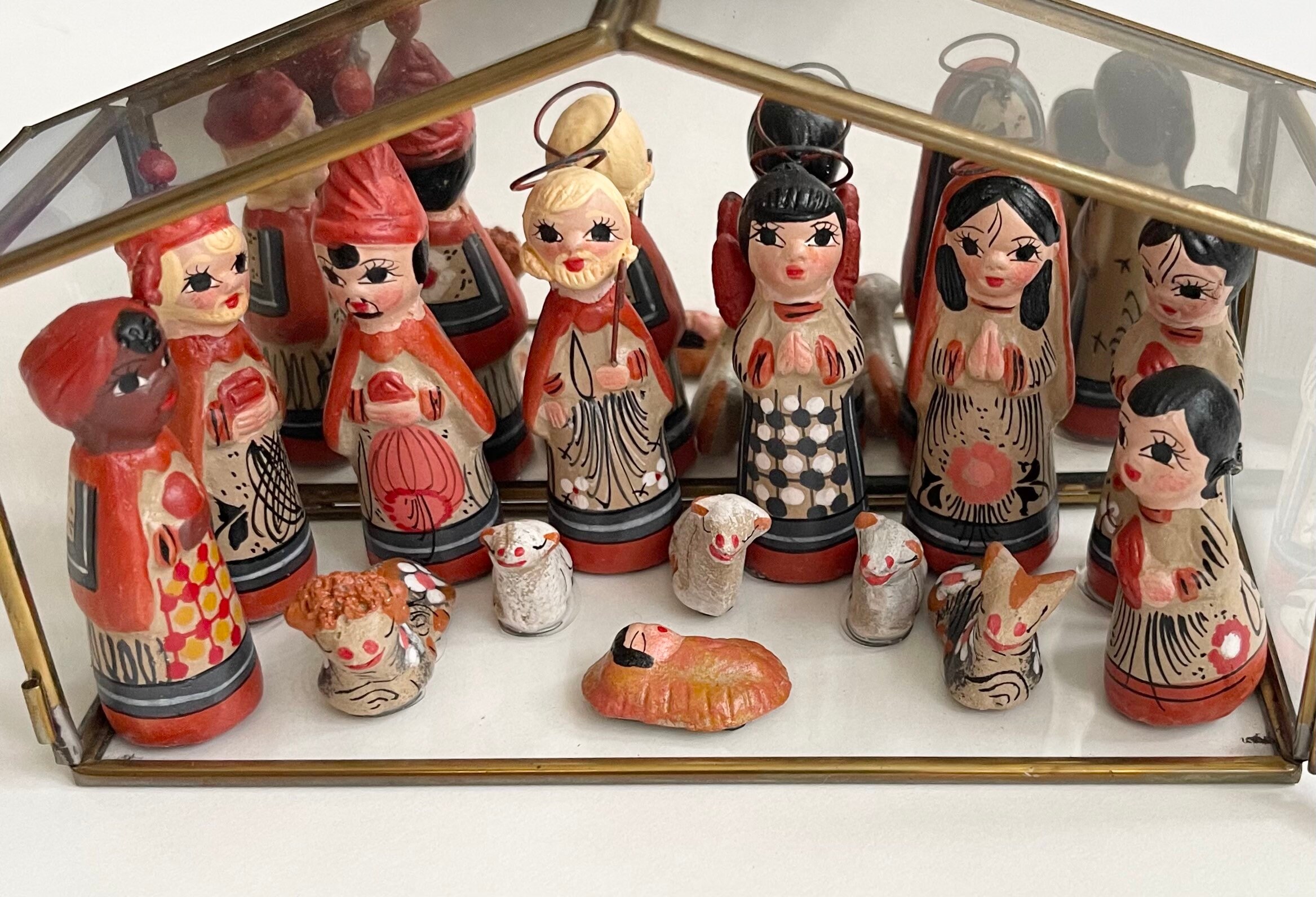 Mexican Nativity Scene Set Diorama Handmade Folk Art Set of 14 Figurines Glass Creche Case Vintage Christmas Decor Baby Jesus Animal