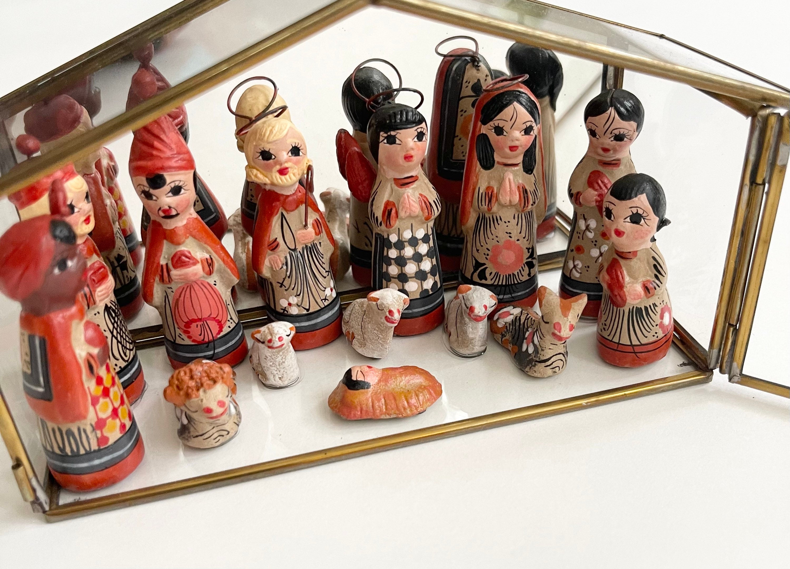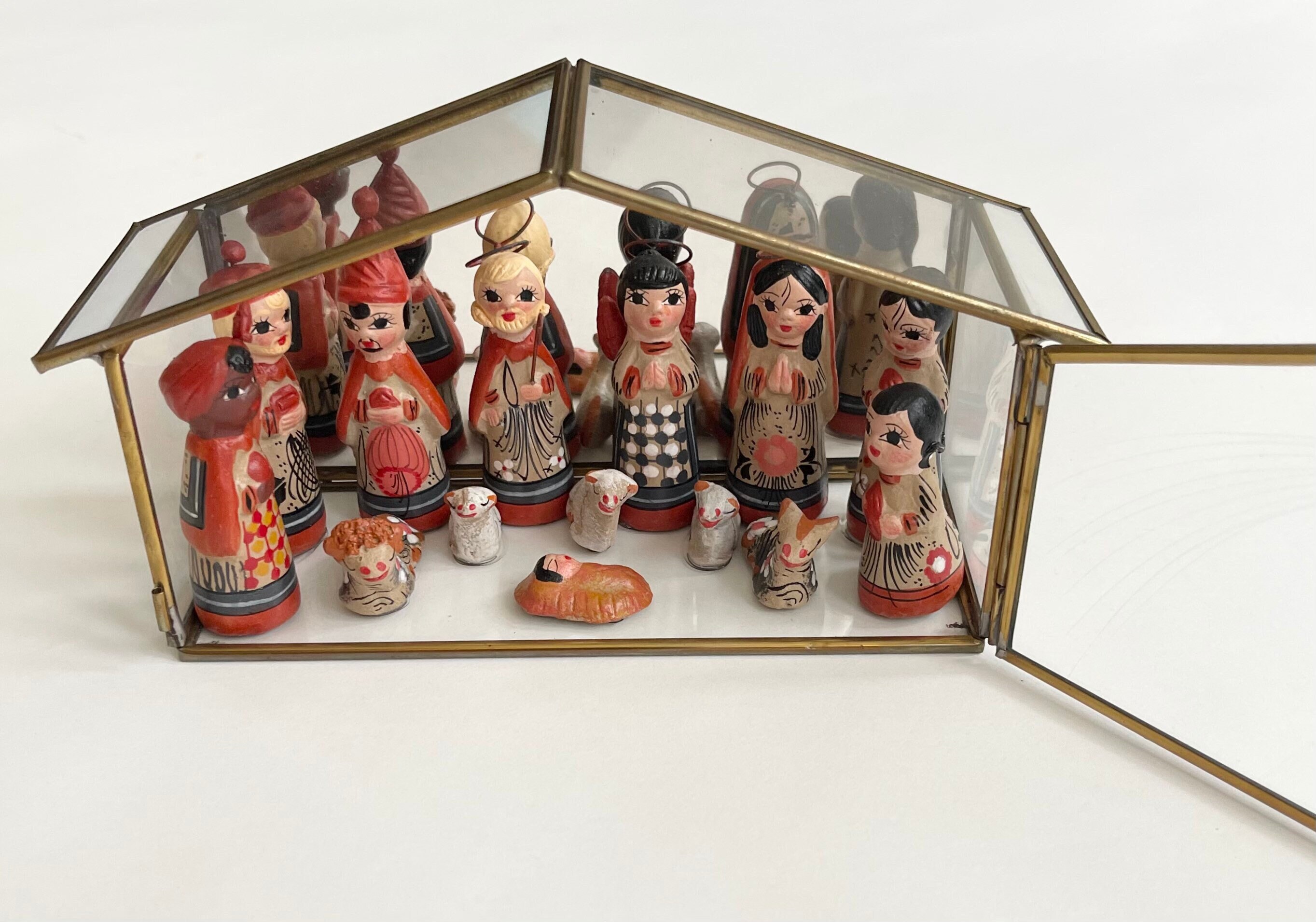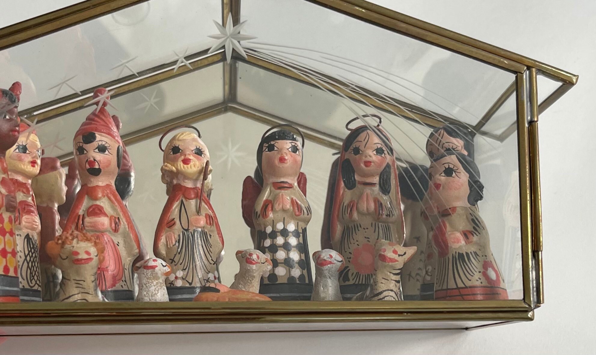 Adorable vintage Mexican folk art nativity scene in a star-etched glass creche