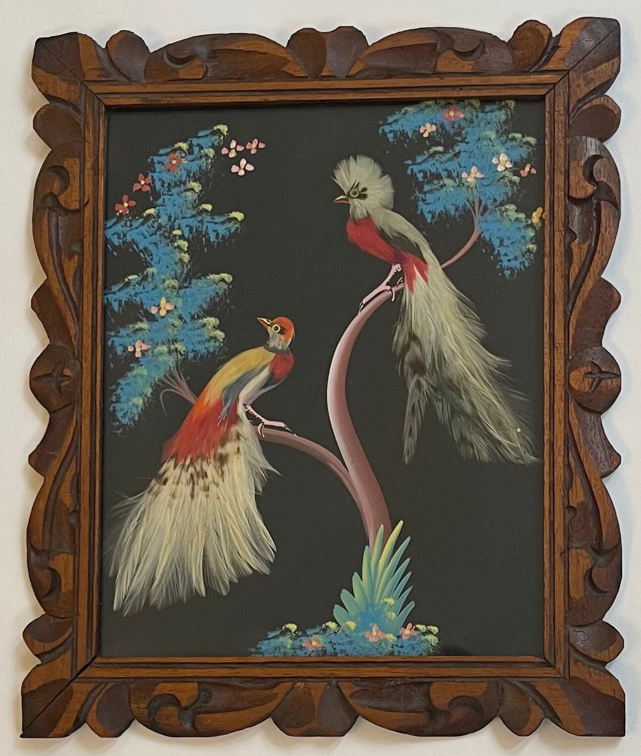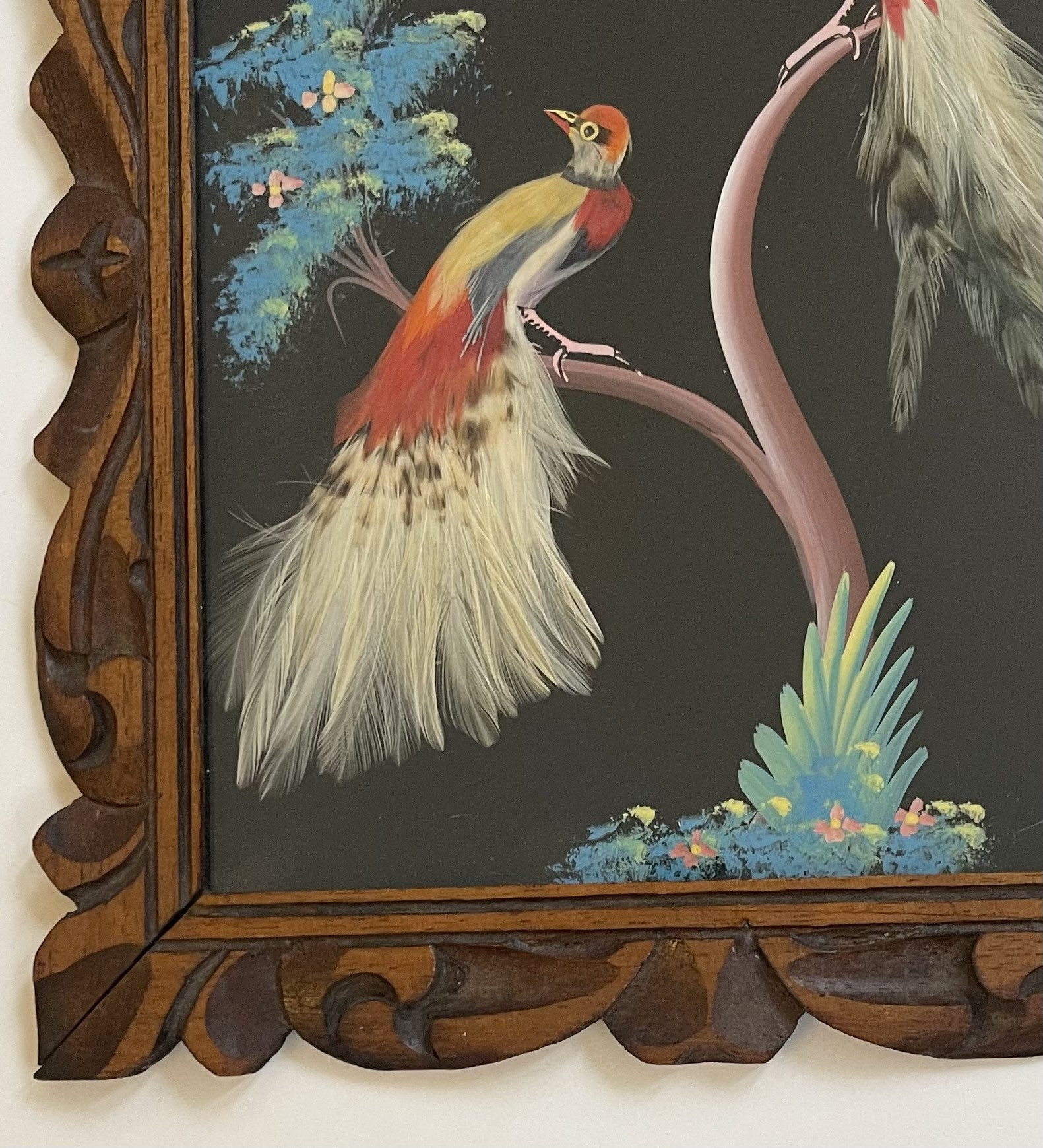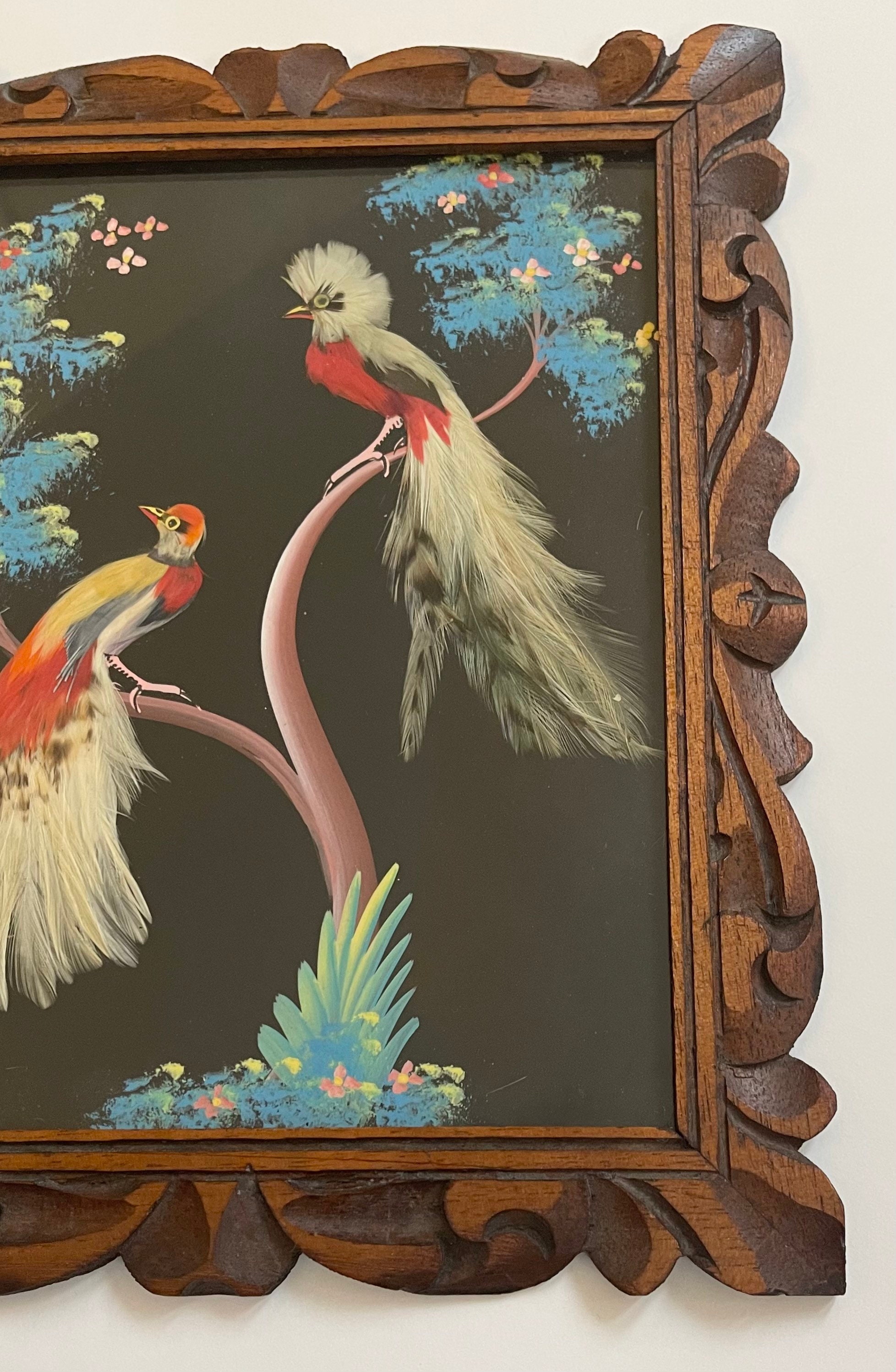 Vintage 30's Mexican feather art bird painting with carved wood frame