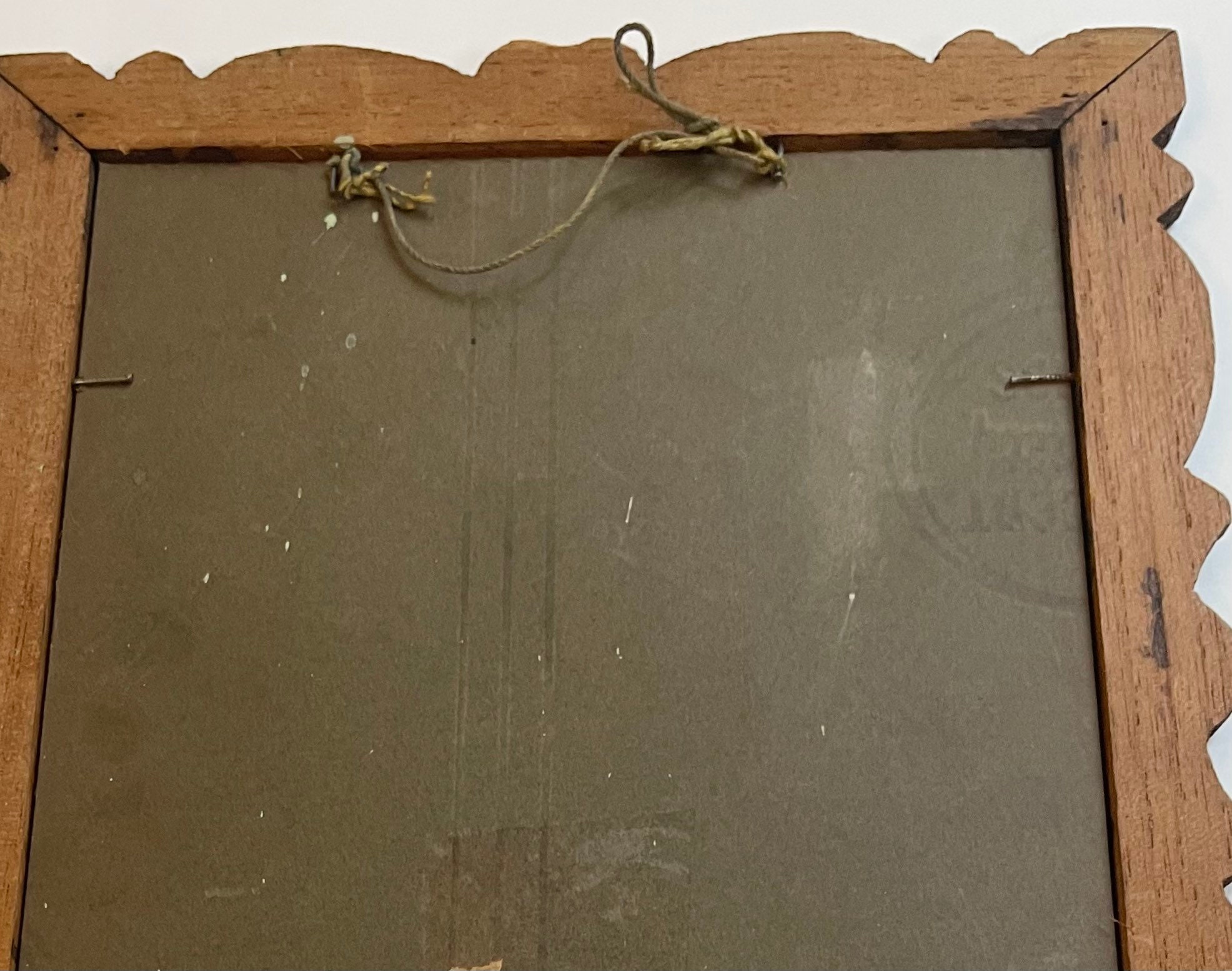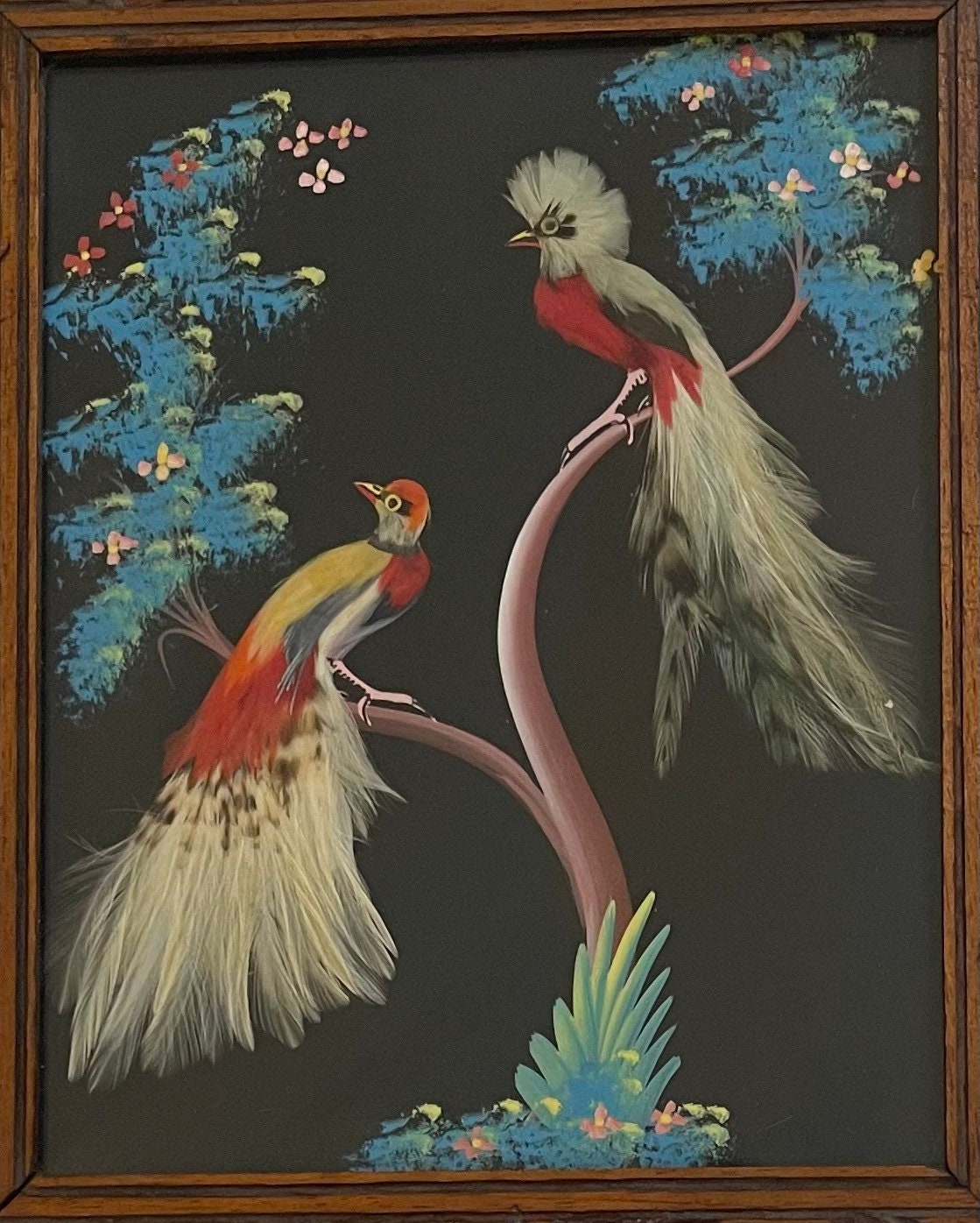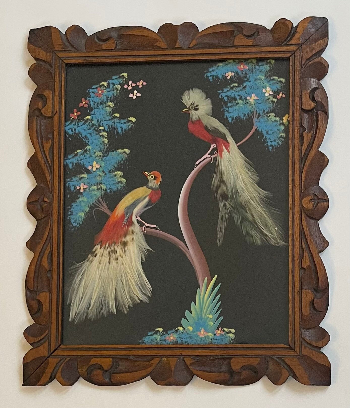 Vintage 30's Mexican feather art bird painting with carved wood frame