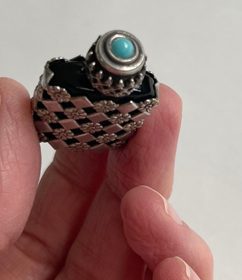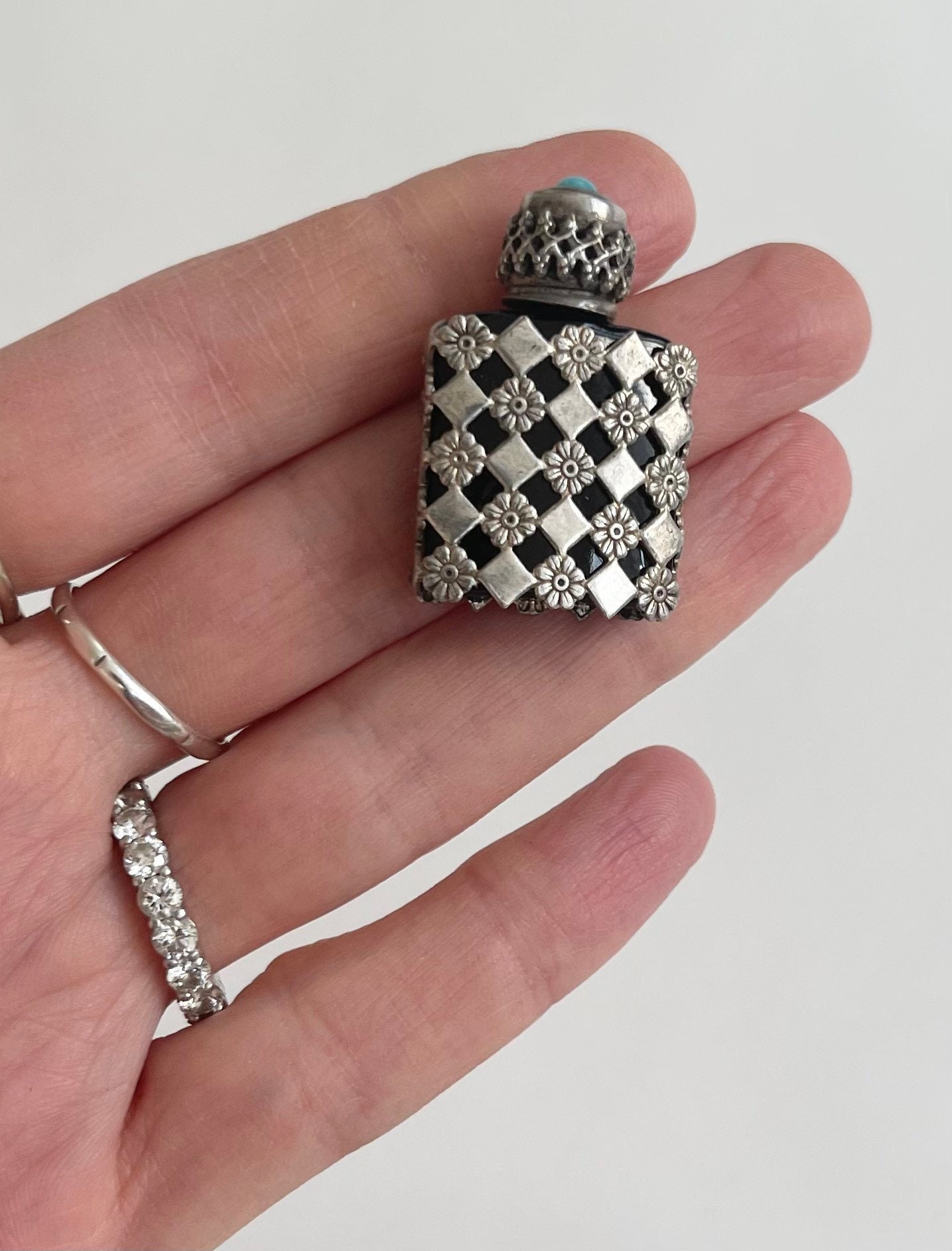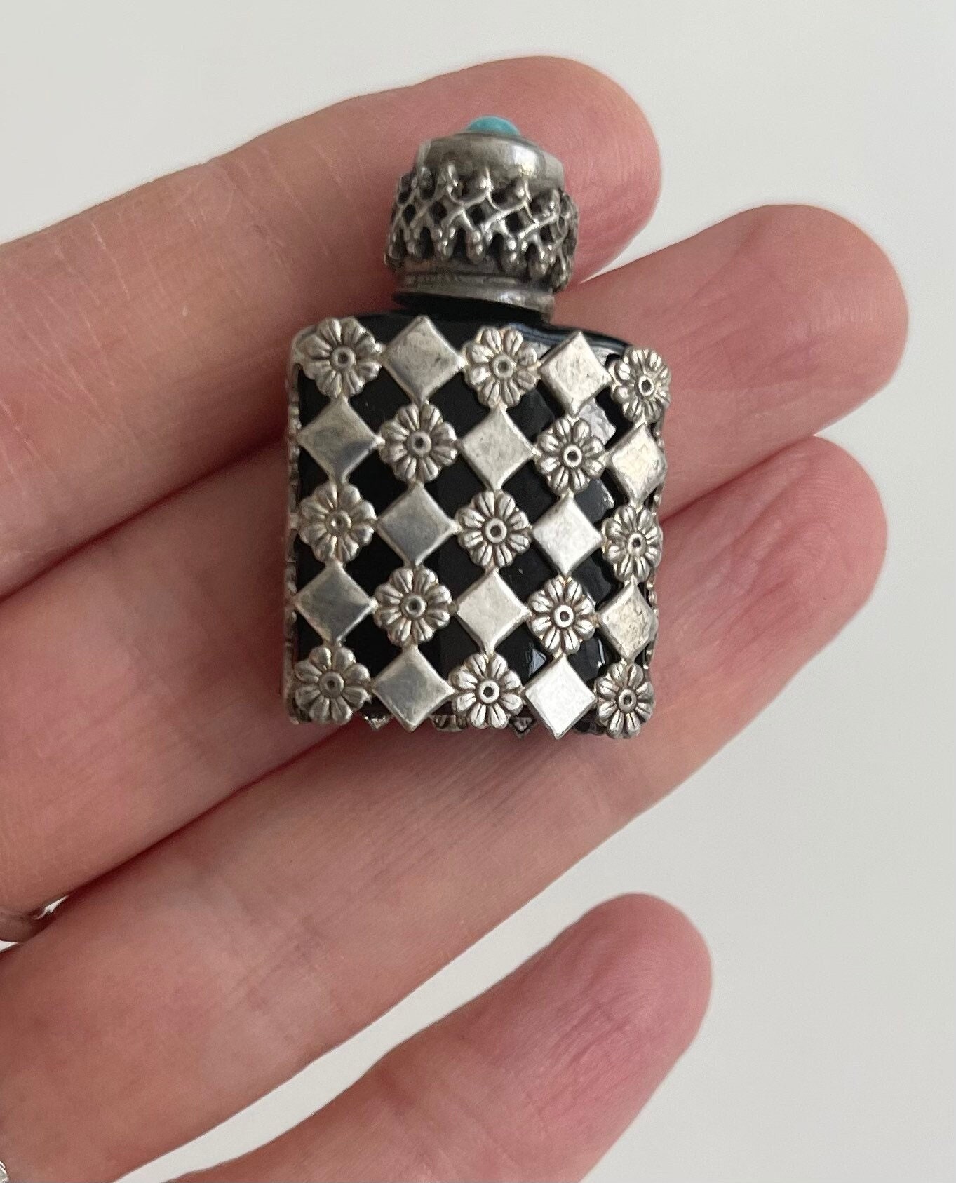 Tiny French Perfume Bottle Made in France Turquoise Colored Detail Ornate Silver Over Glass Very Small Perfume Vial Antique Vintage