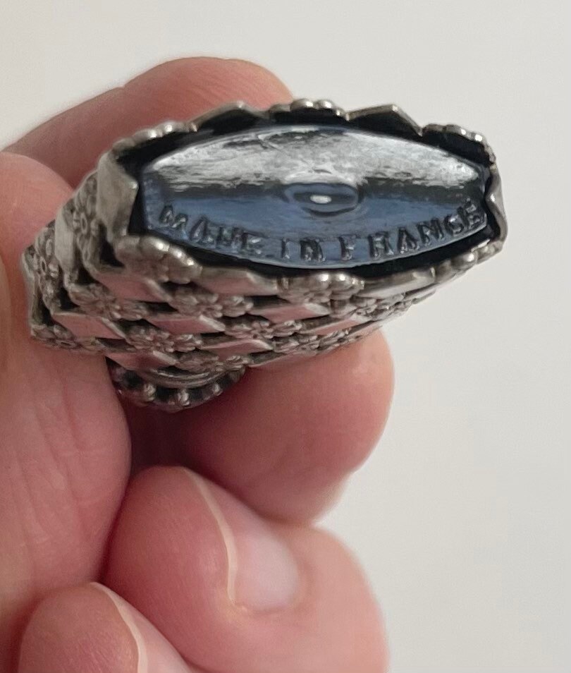 Tiny antique French perfume bottle made of an ornate silver metal over glass