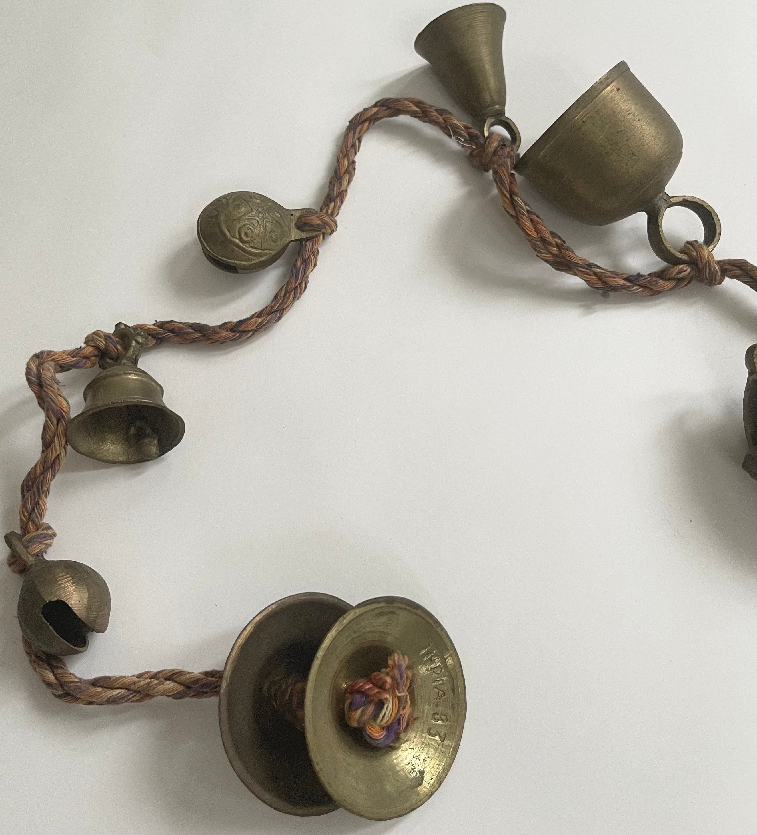 Old Indian Brass Bells Strand String of 7 Solid Brass Bells Peaceful Sound Stamped India Prayer Meditation Religious Altar Bells