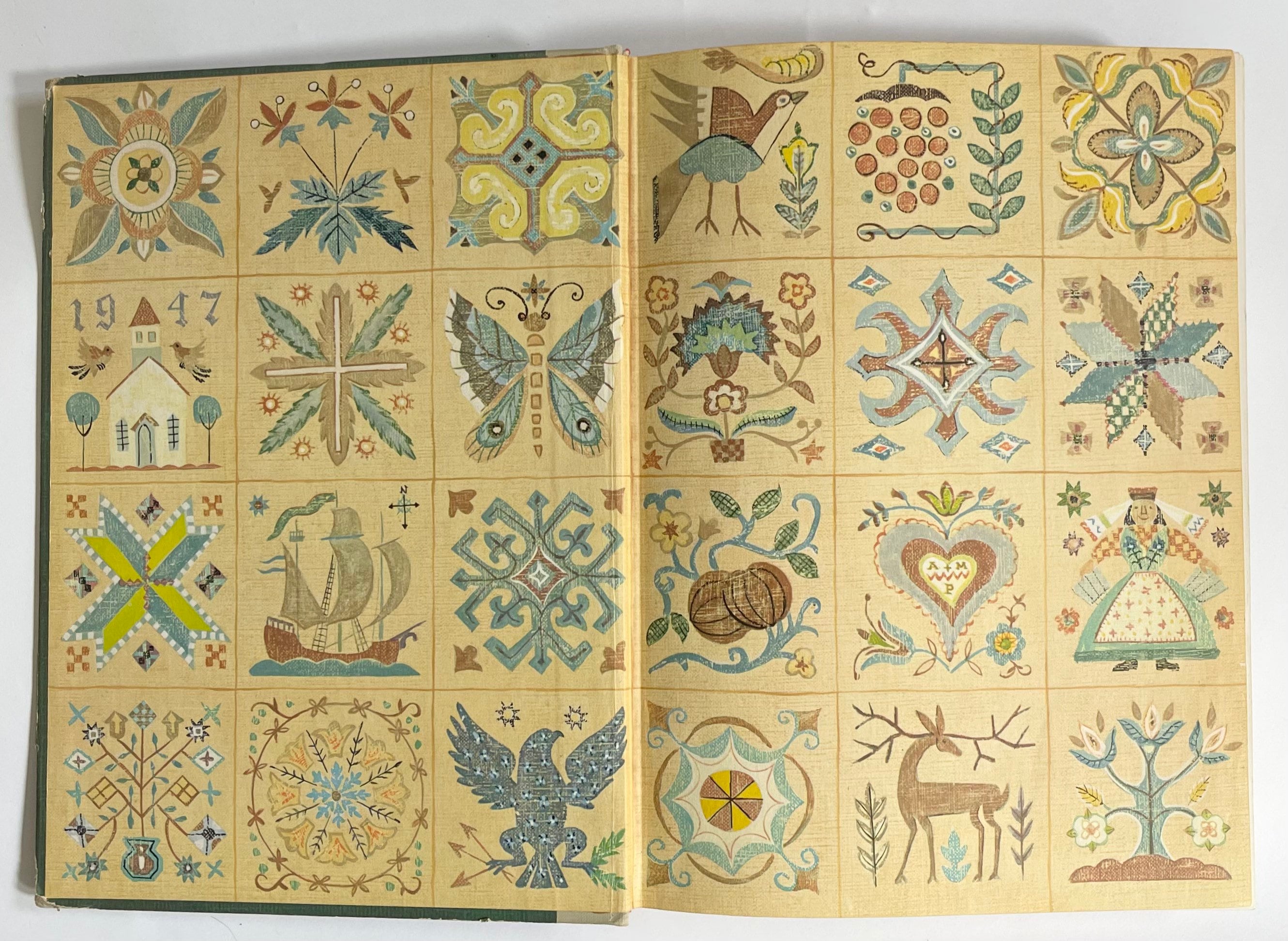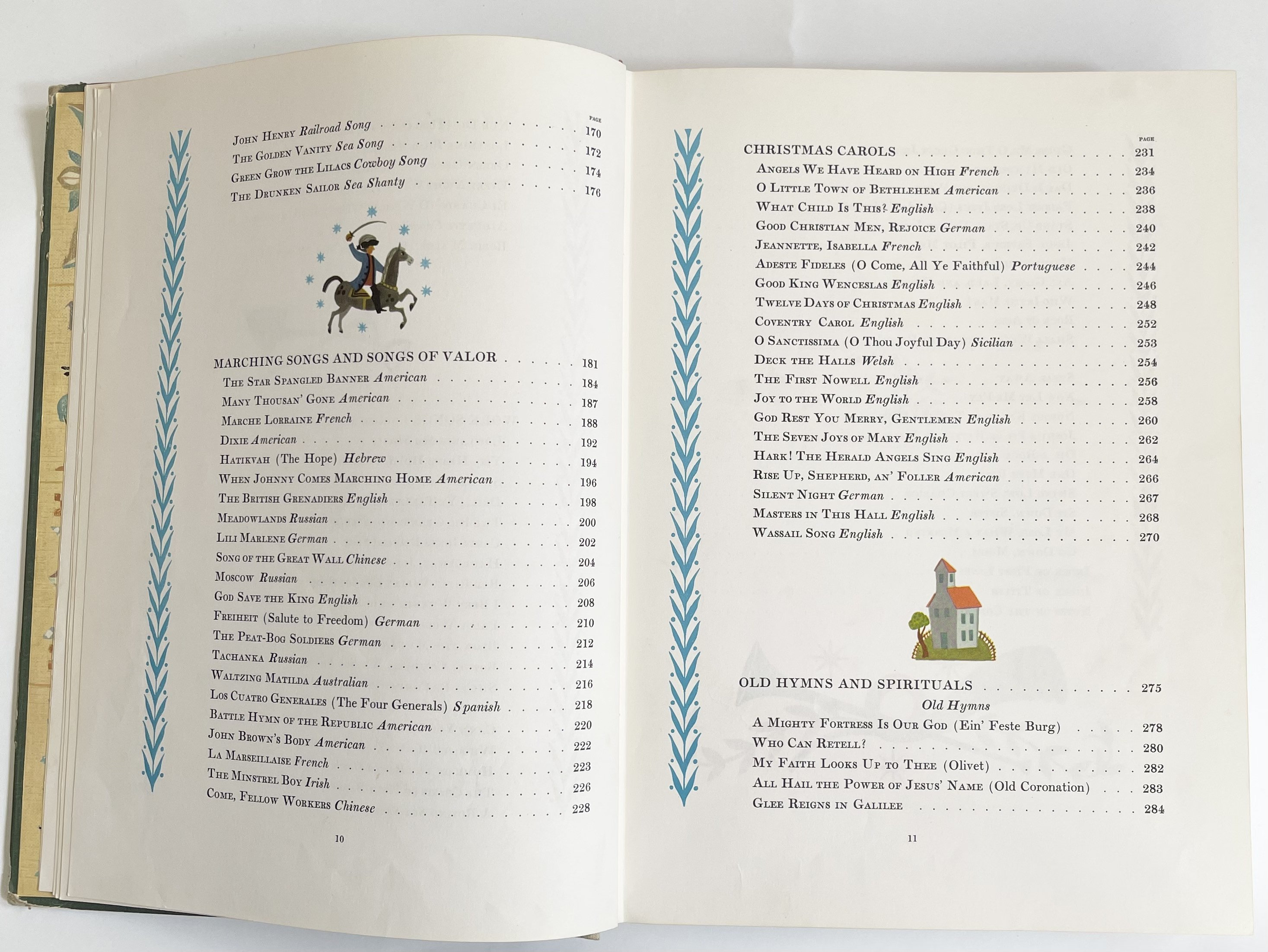 Illustrated vintage 1947 "Fireside Book of Folk Songs" music book divided into five parts: