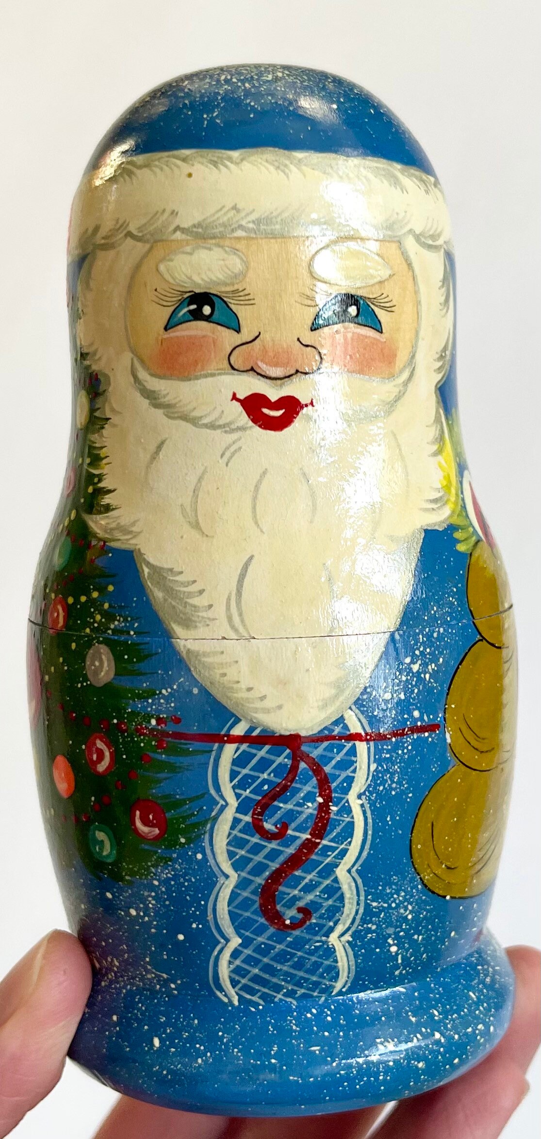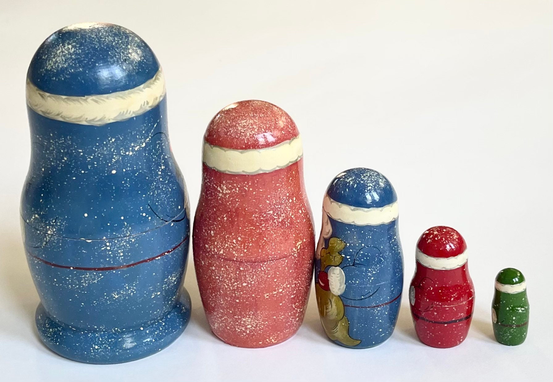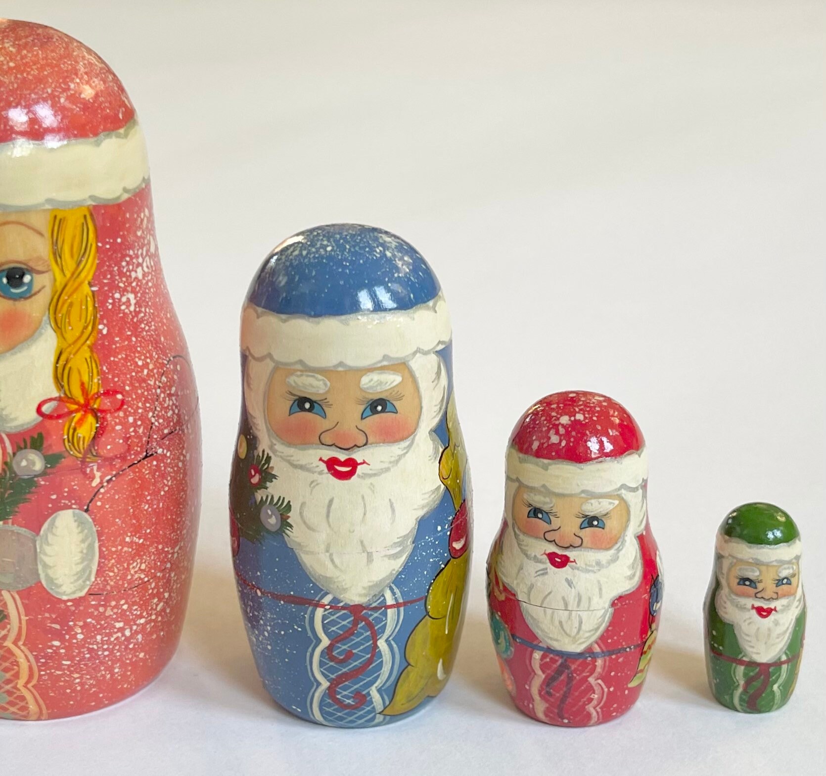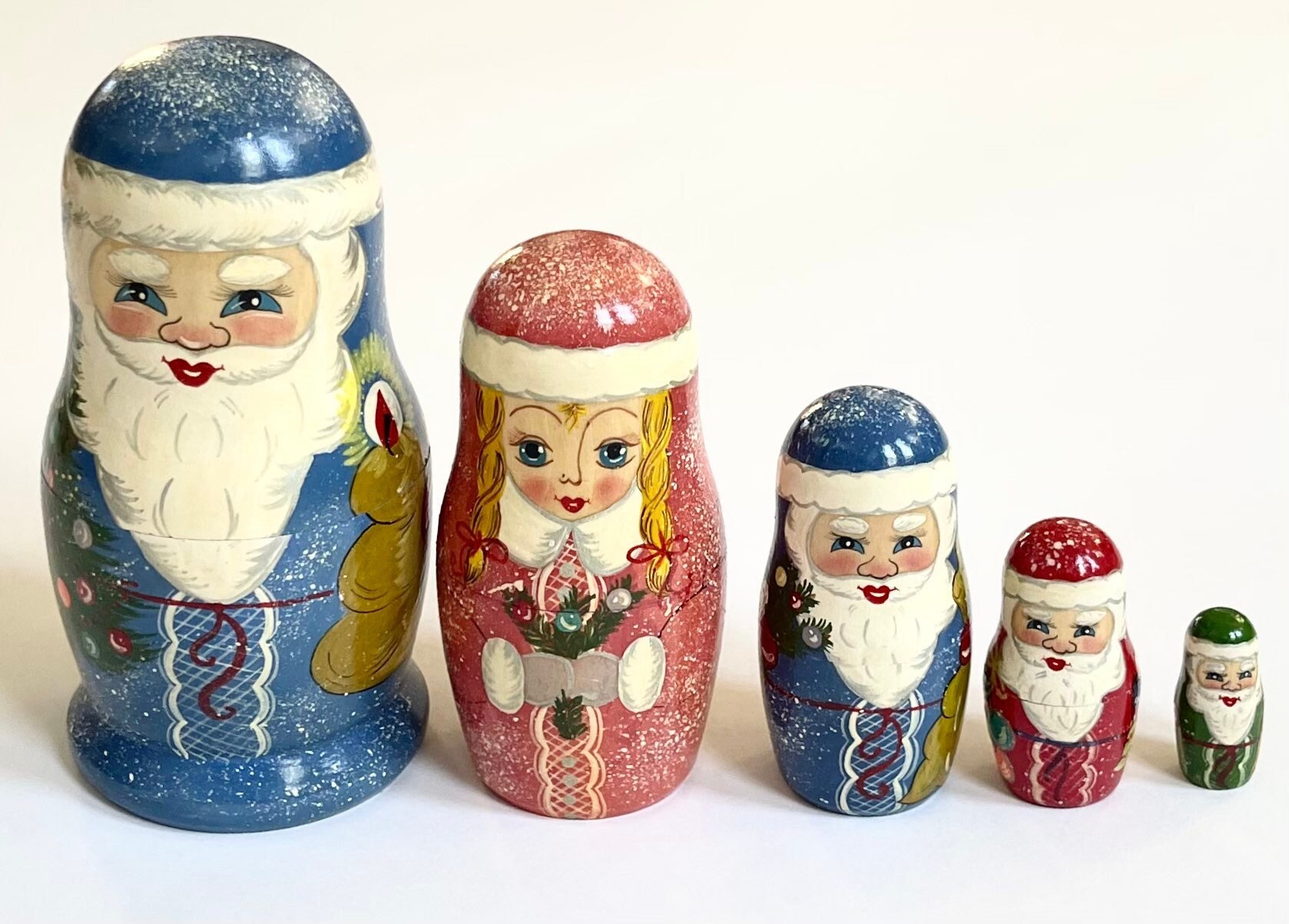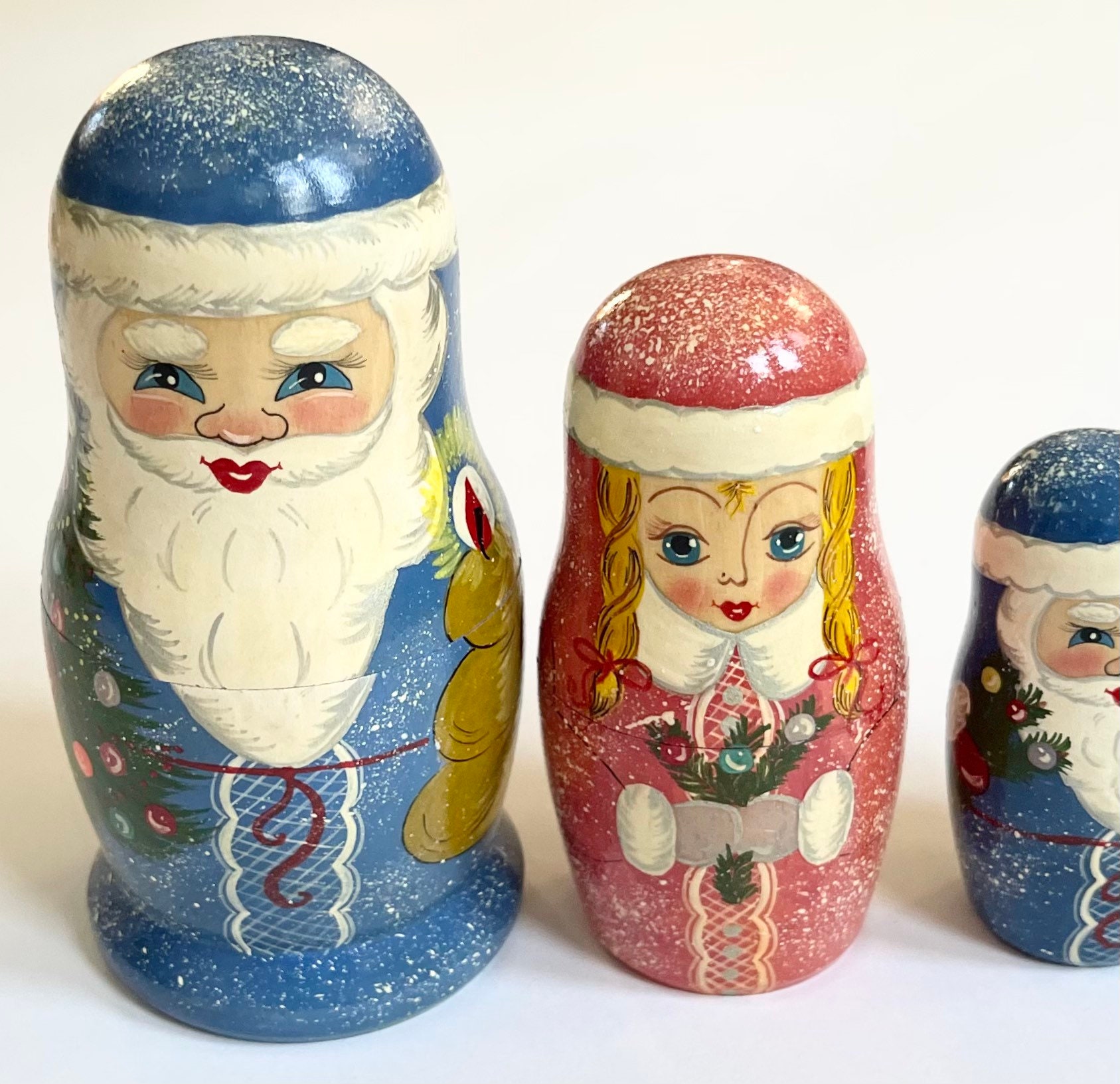 Signed vintage hand painted Christmas-themed wood nesting dolls