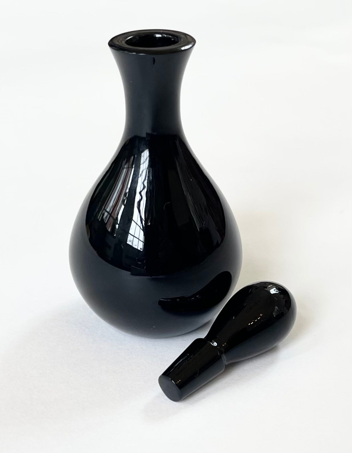 Glossy vintage black glass perfume bottle with removable cap