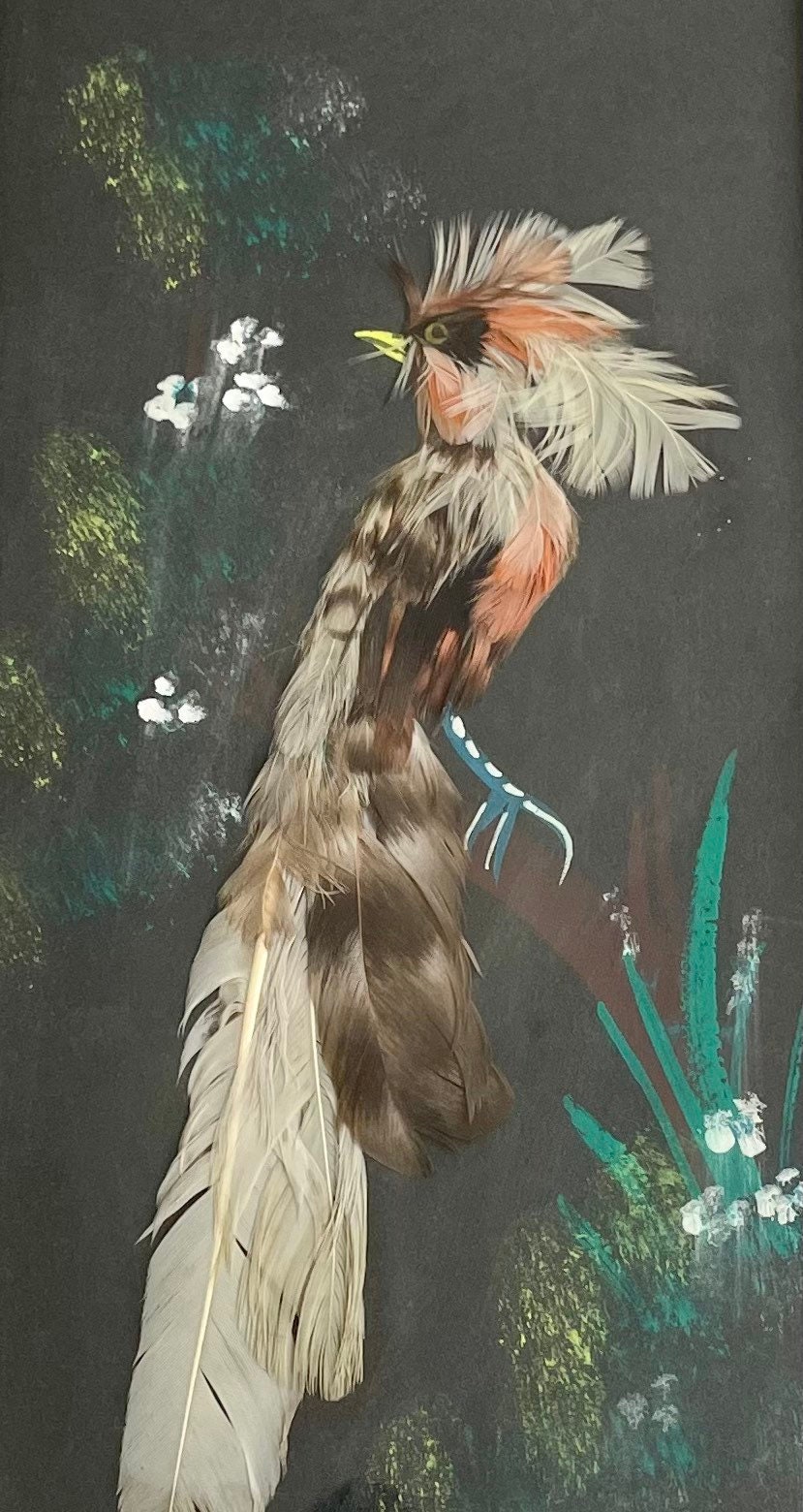 Mexican Bird Feather Art Painting Vintage 30s Made in Mexico Mexican Folk Art Nature Animal Feathers Black Background Vertical Alignment