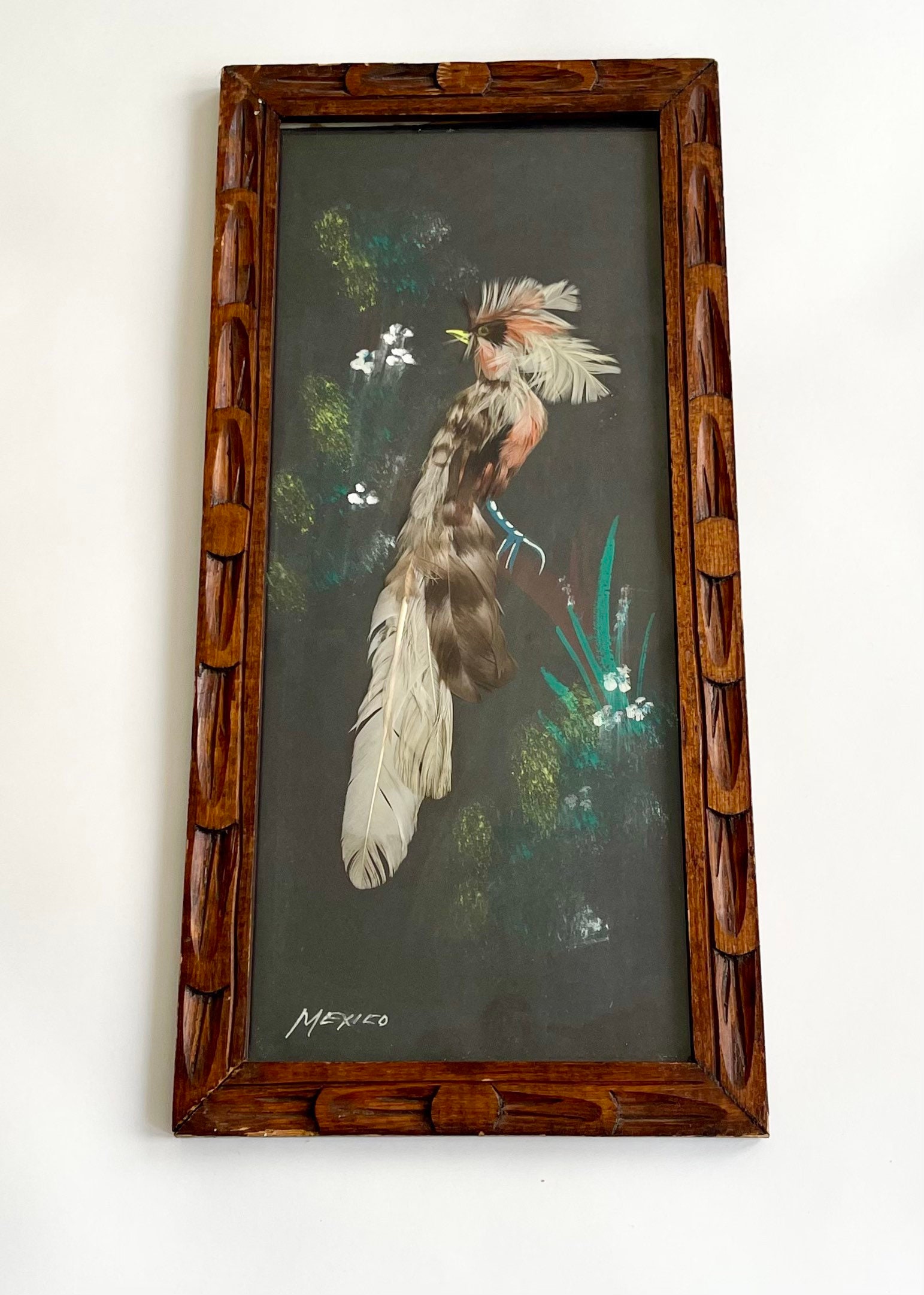 Vintage 30's Mexican feather art bird painting with carved wood frame