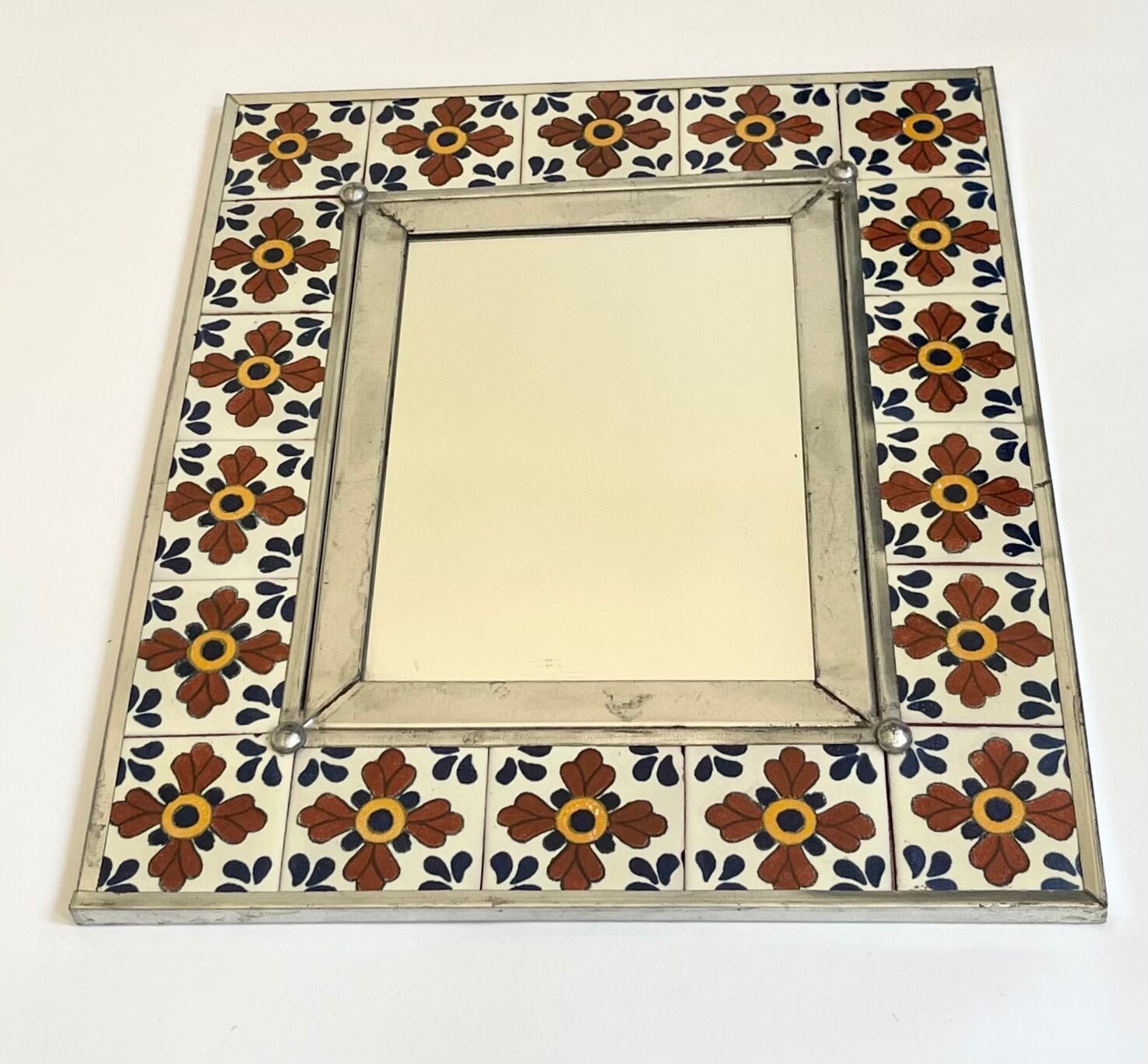 Vintage Mexican floral ceramic tile mirror with tin frame