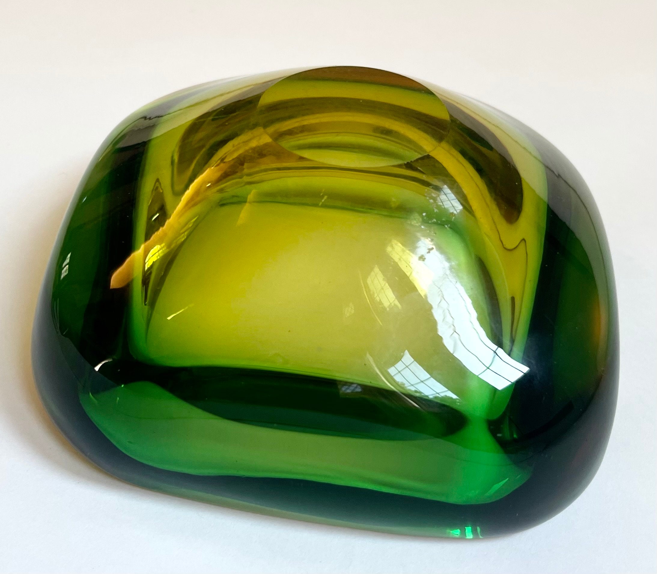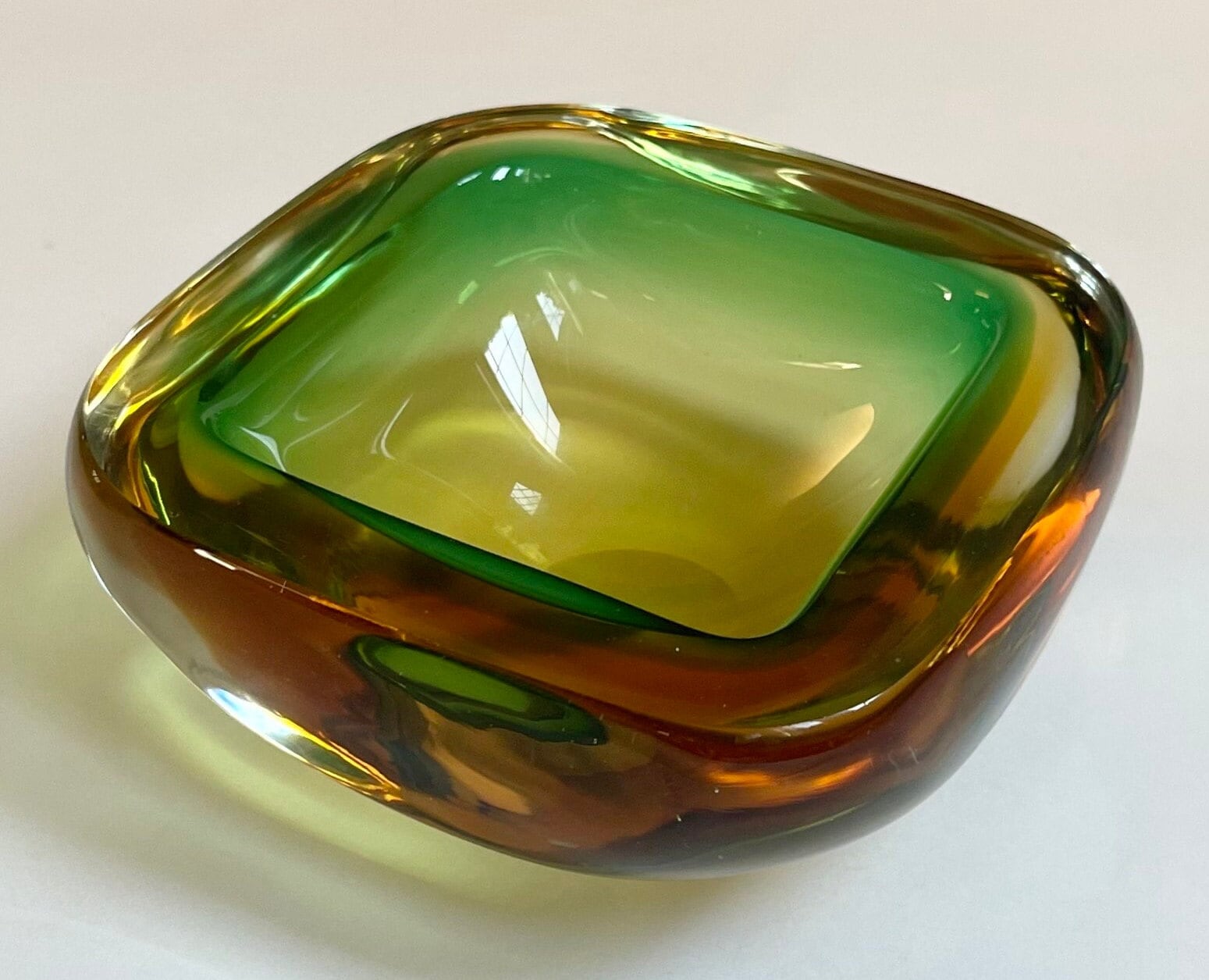 Thick Mid Century glass ashtray in shades of green and brown