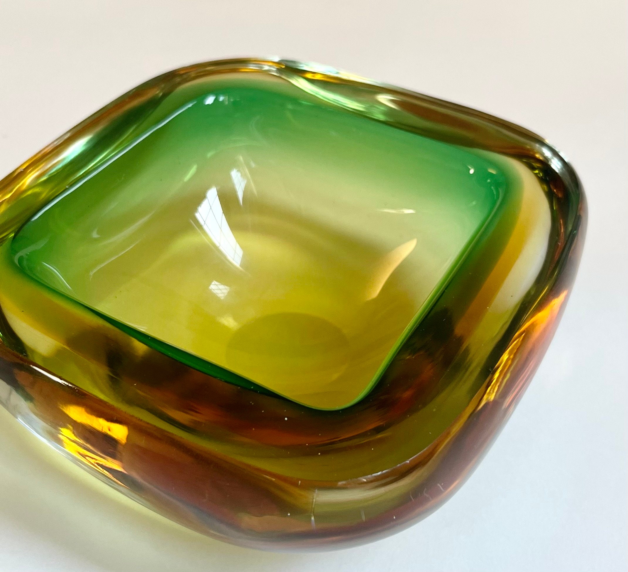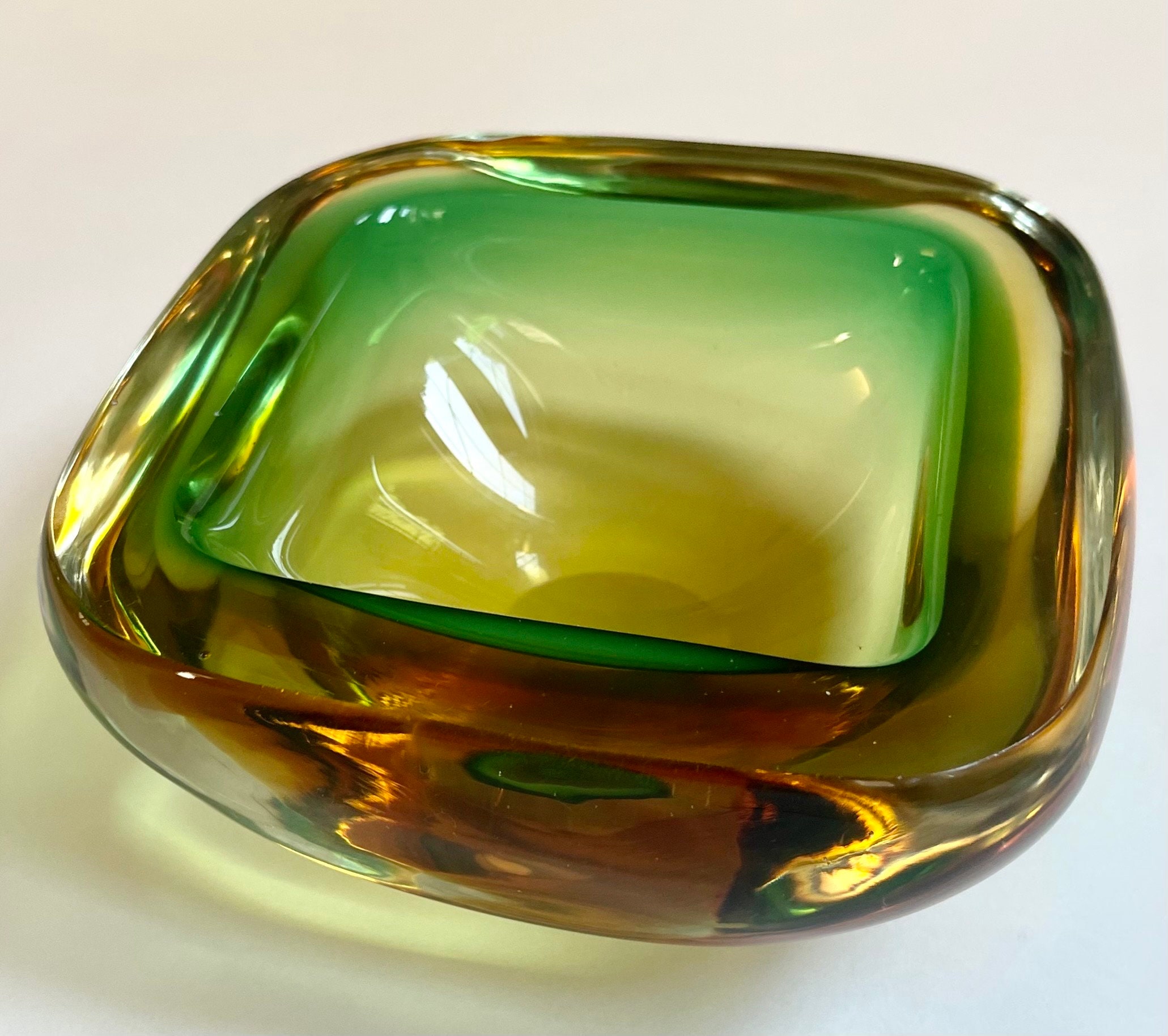 Heavy Thick Glass Ashtray Minimalist Sleek Square Dish Green Brown Glass Vintage Mid Century MCM Retro Atomic Style Home Coffee Table Decor