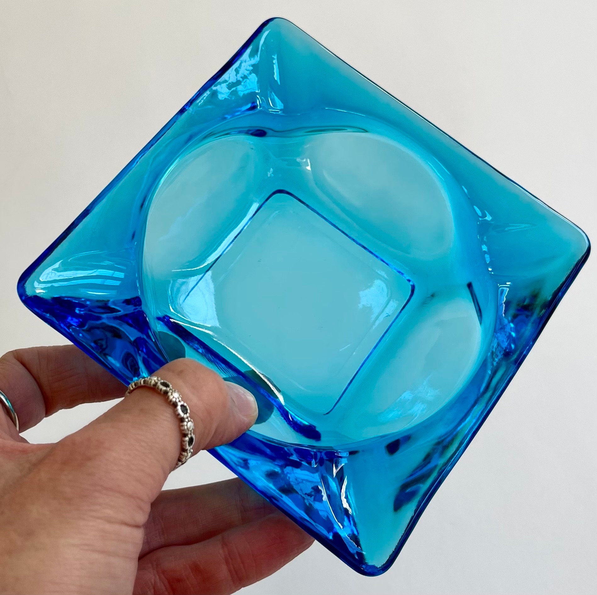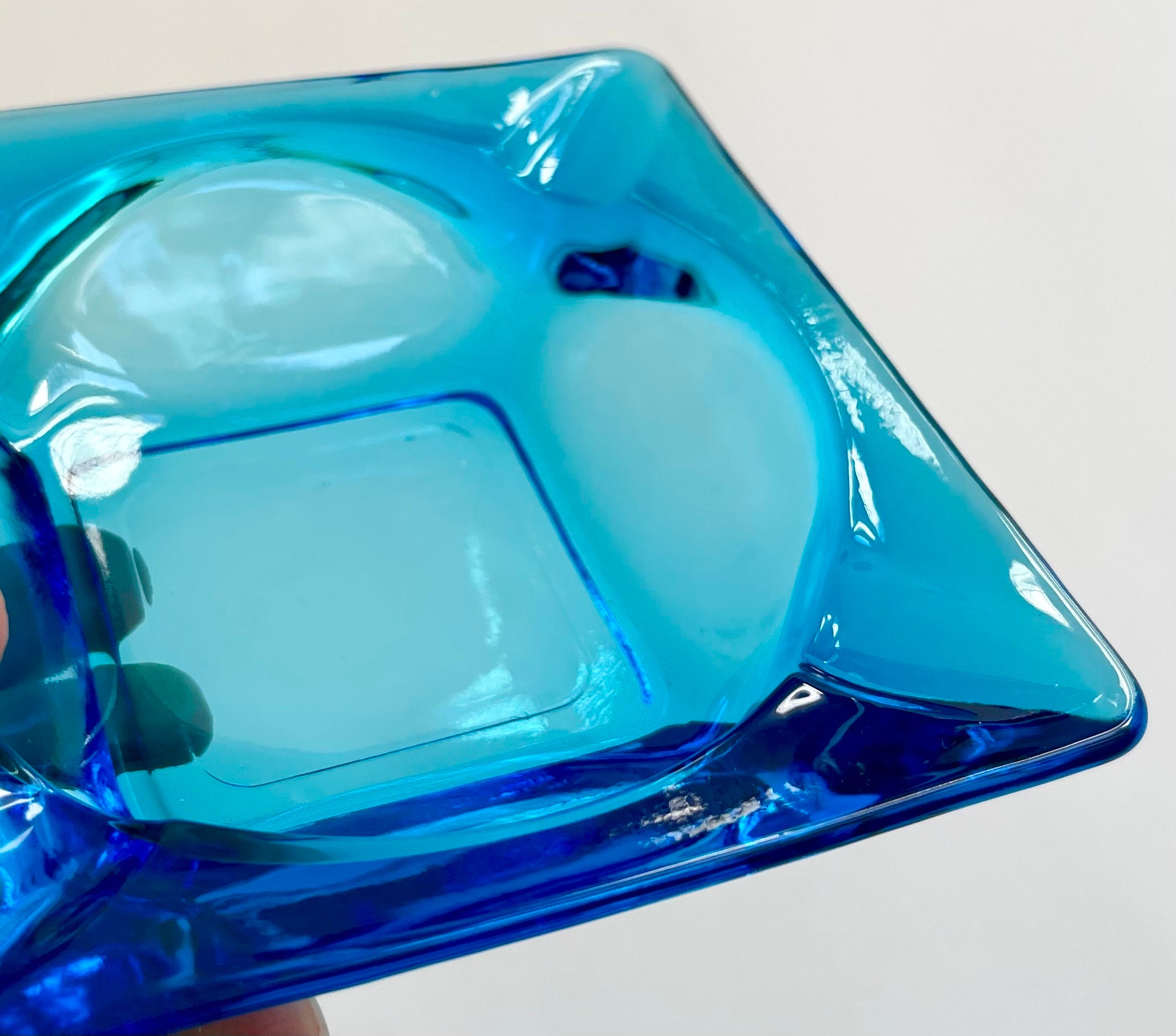 Atomic Blue Glass Ashtray Minimalist Sleek Square Vintage Mid Century MCM Retro Home Coffee Table Decor