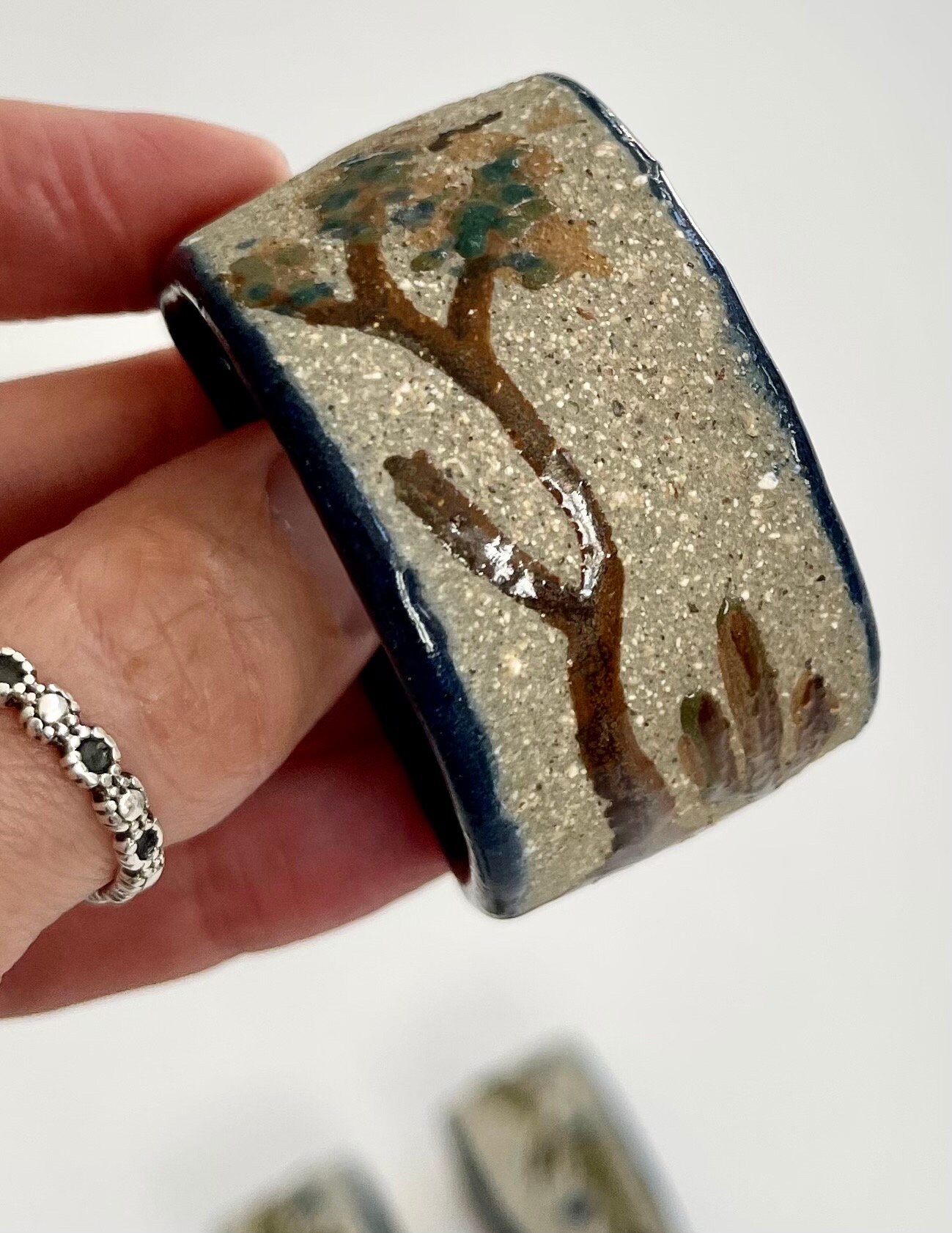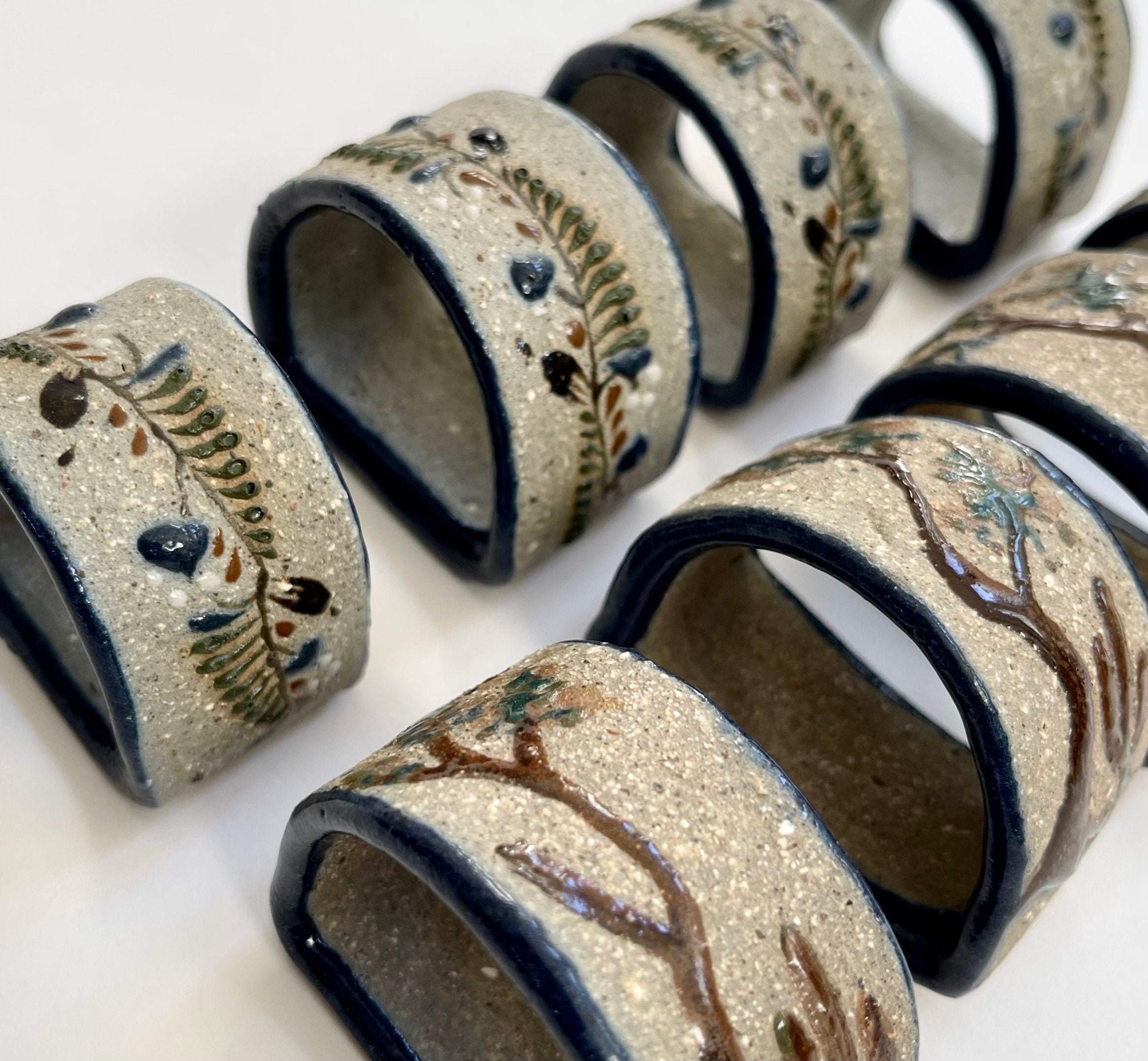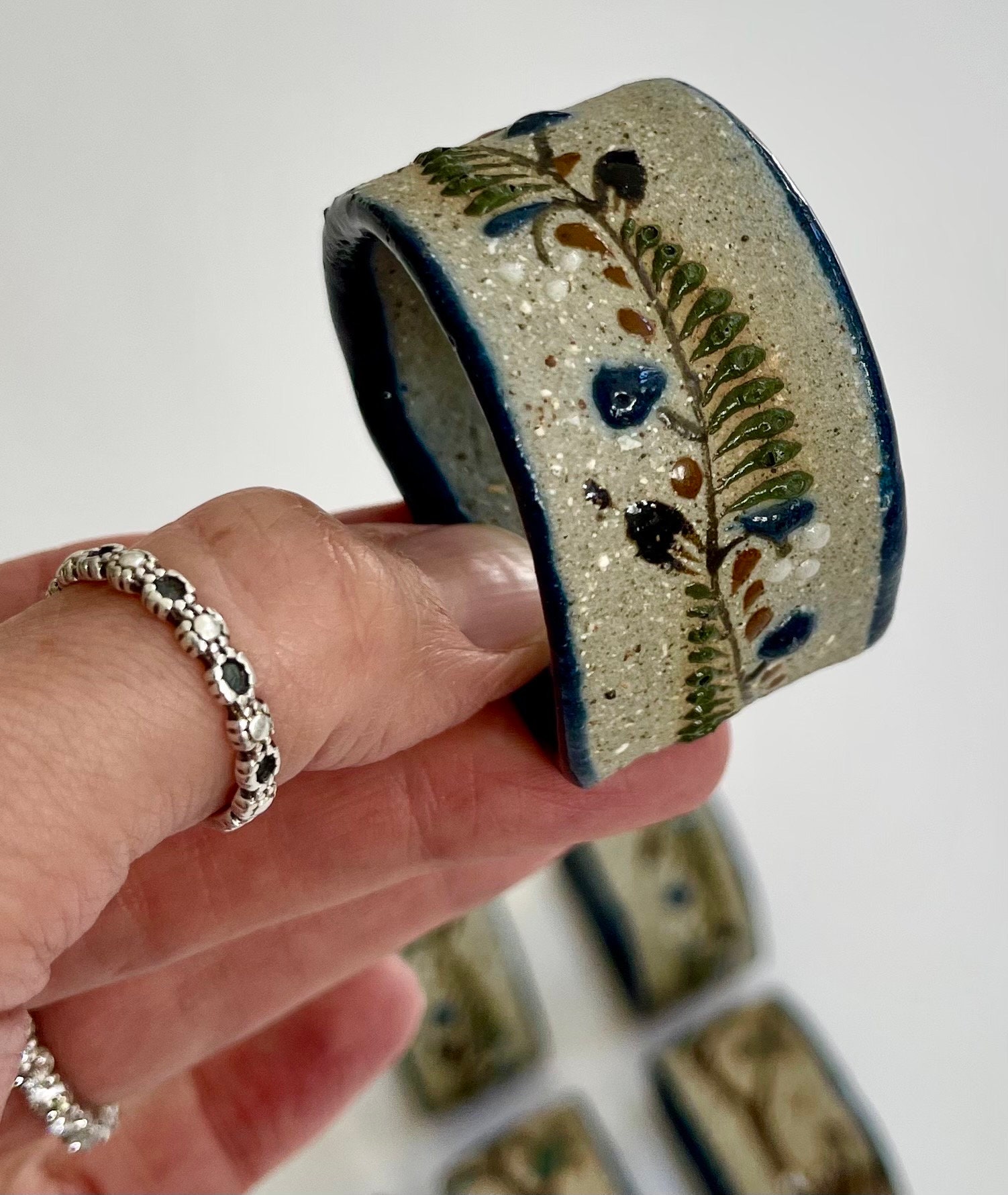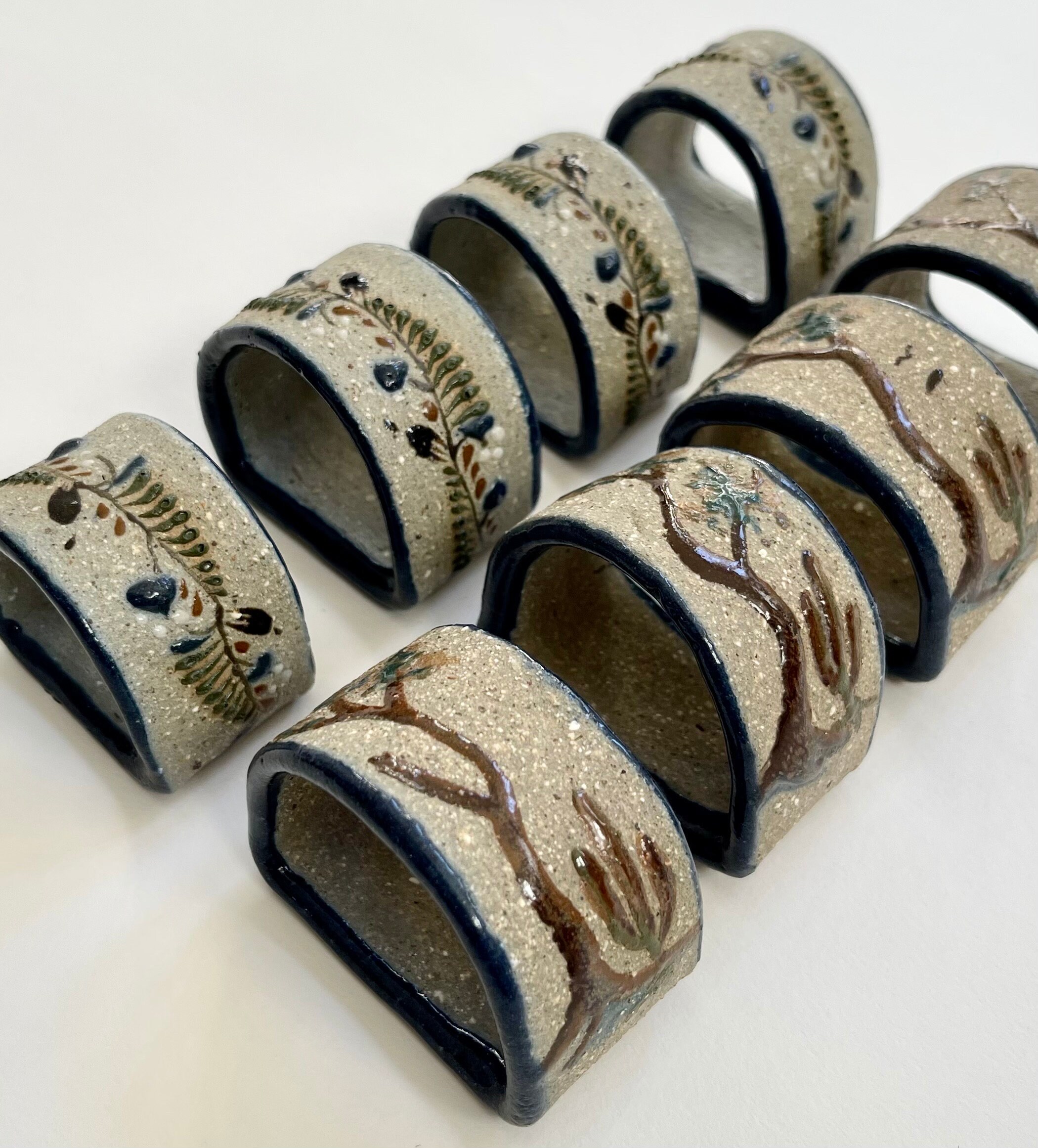 Mexican Stoneware Napkin Rings Napkin Holders Set Lot of 8 Rings Vintage Folk Boho Ethnic Talavera Pottery Botanical Tree Floral Cactus