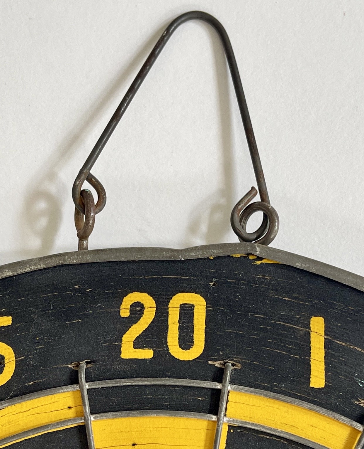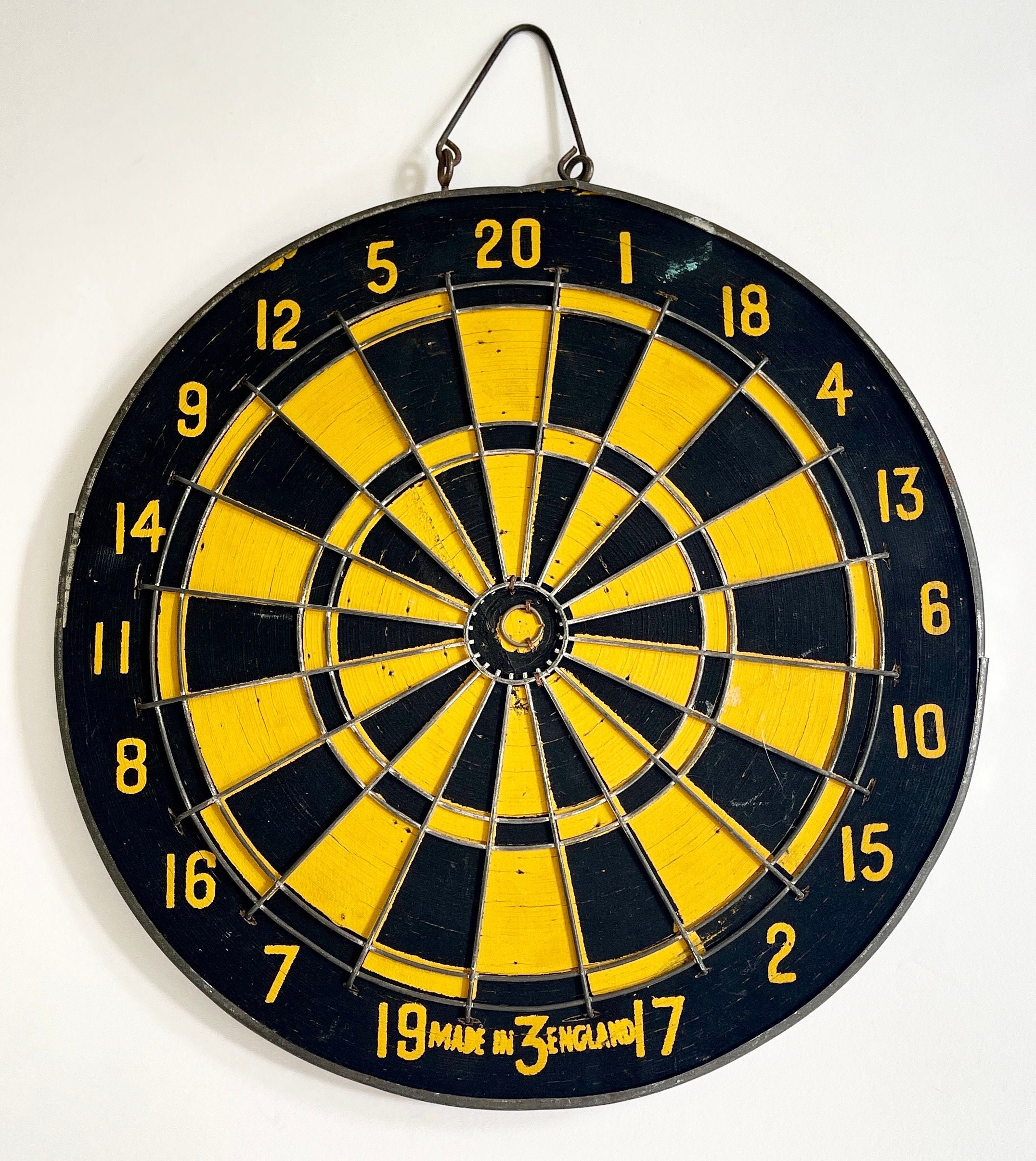 Vintage English Dart Board 40s 50s Made in England 10.5" Black and Yellow Gold Wall Mount Retro Man Cave Game Room Decor