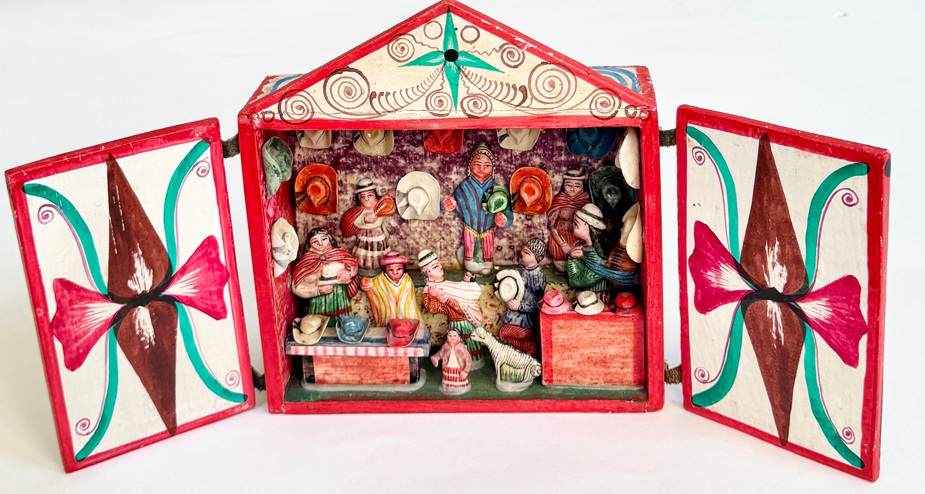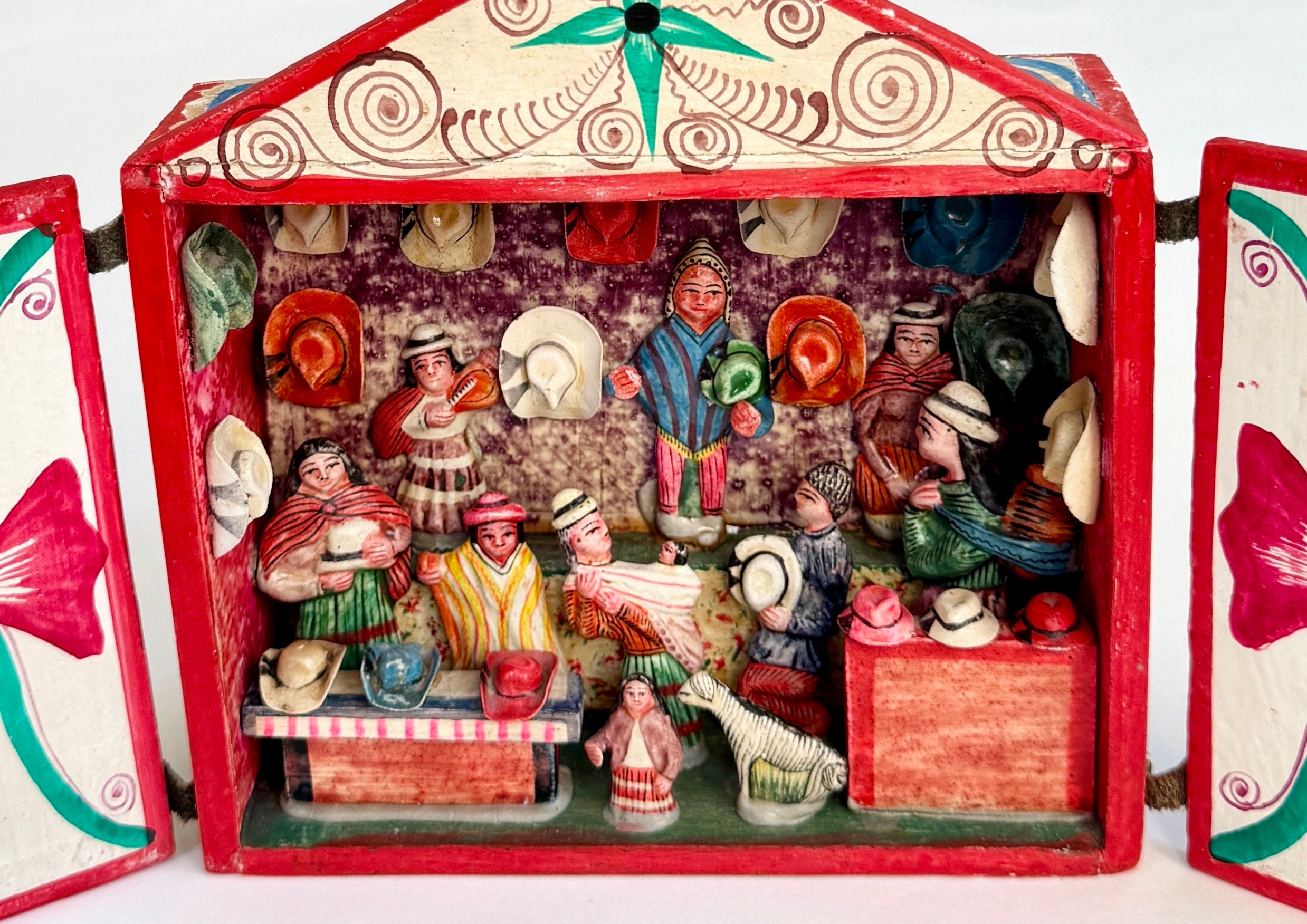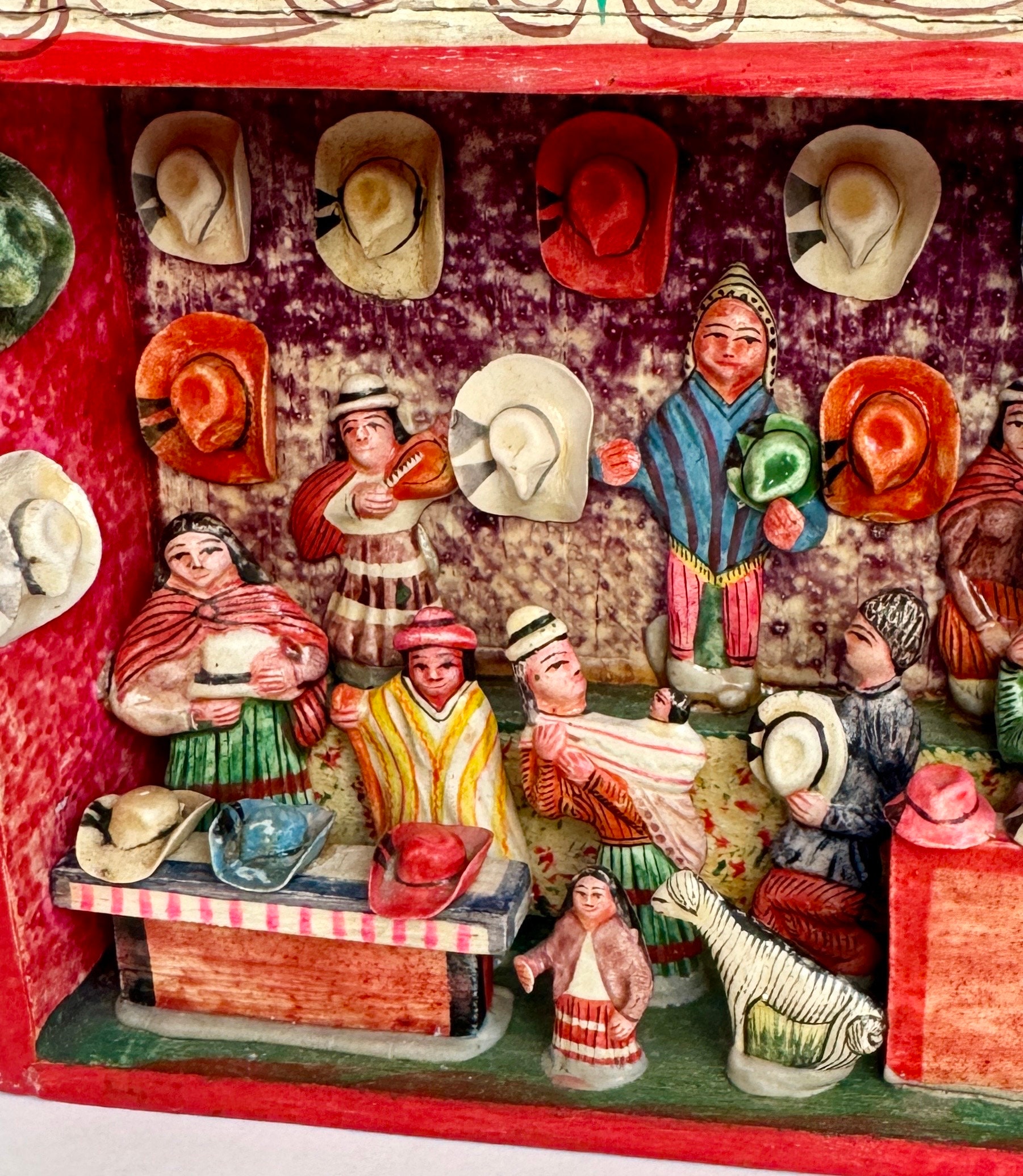 Peruvian Diorama Folk Art Retablo Nicho Hand Carved Wooden Figurines Inside Hand Painted Box with Doors Hat Shop Market Scene Peru