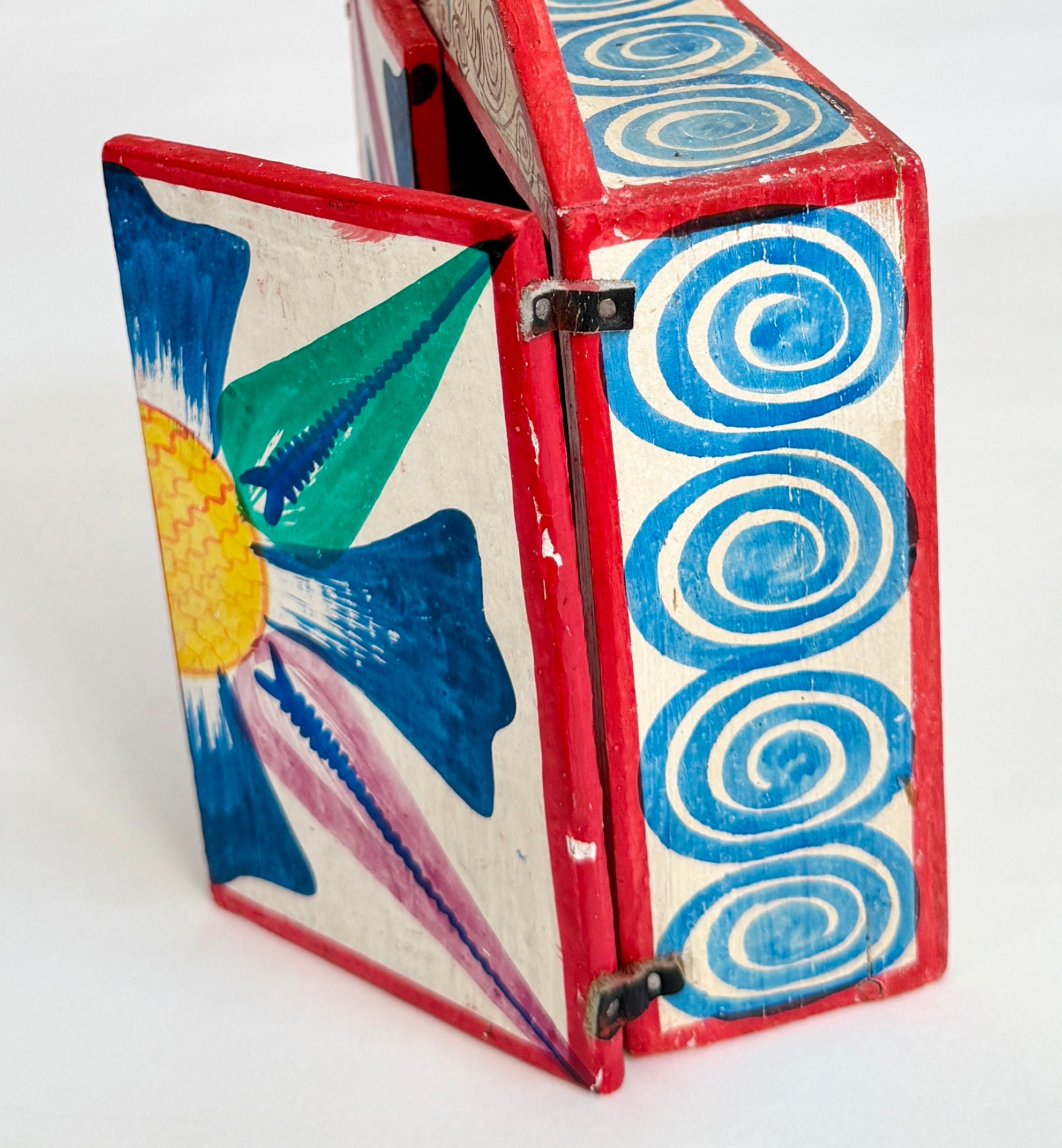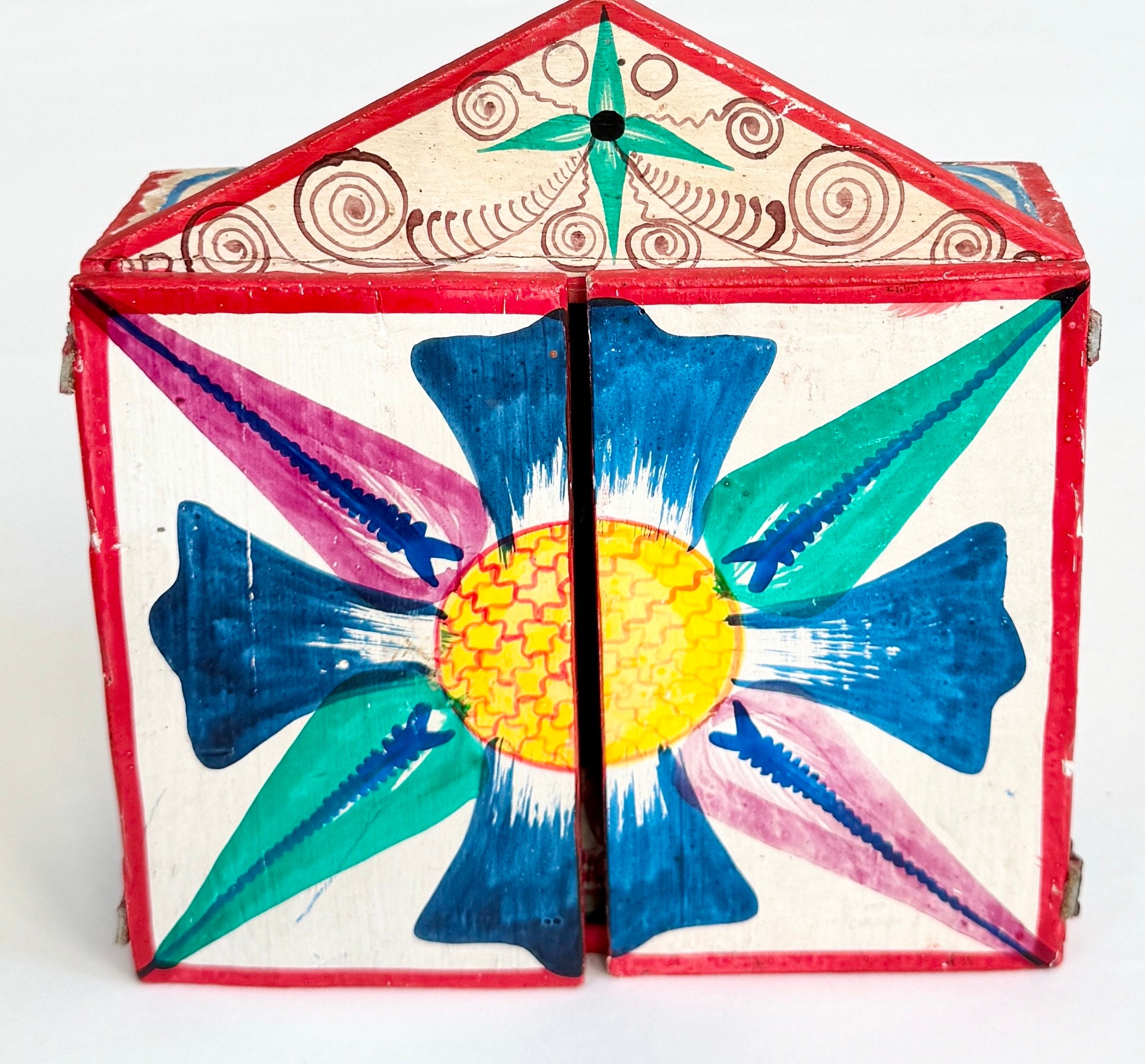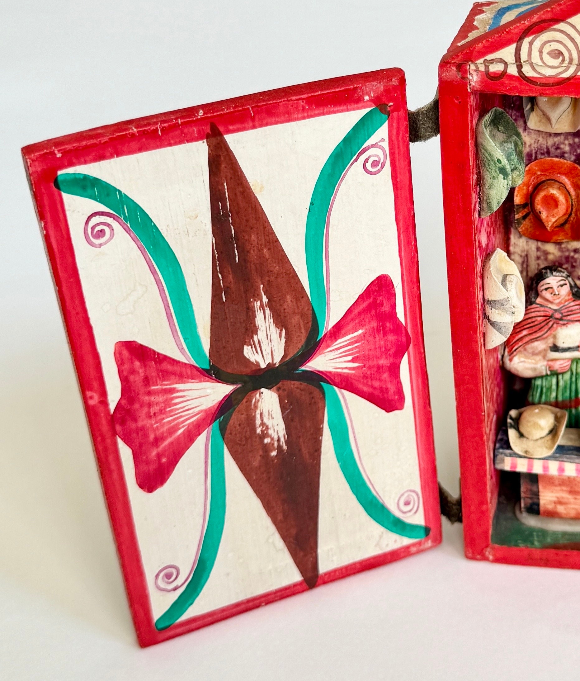 Peruvian Diorama Folk Art Retablo Nicho Hand Carved Wooden Figurines Inside Hand Painted Box with Doors Hat Shop Market Scene Peru