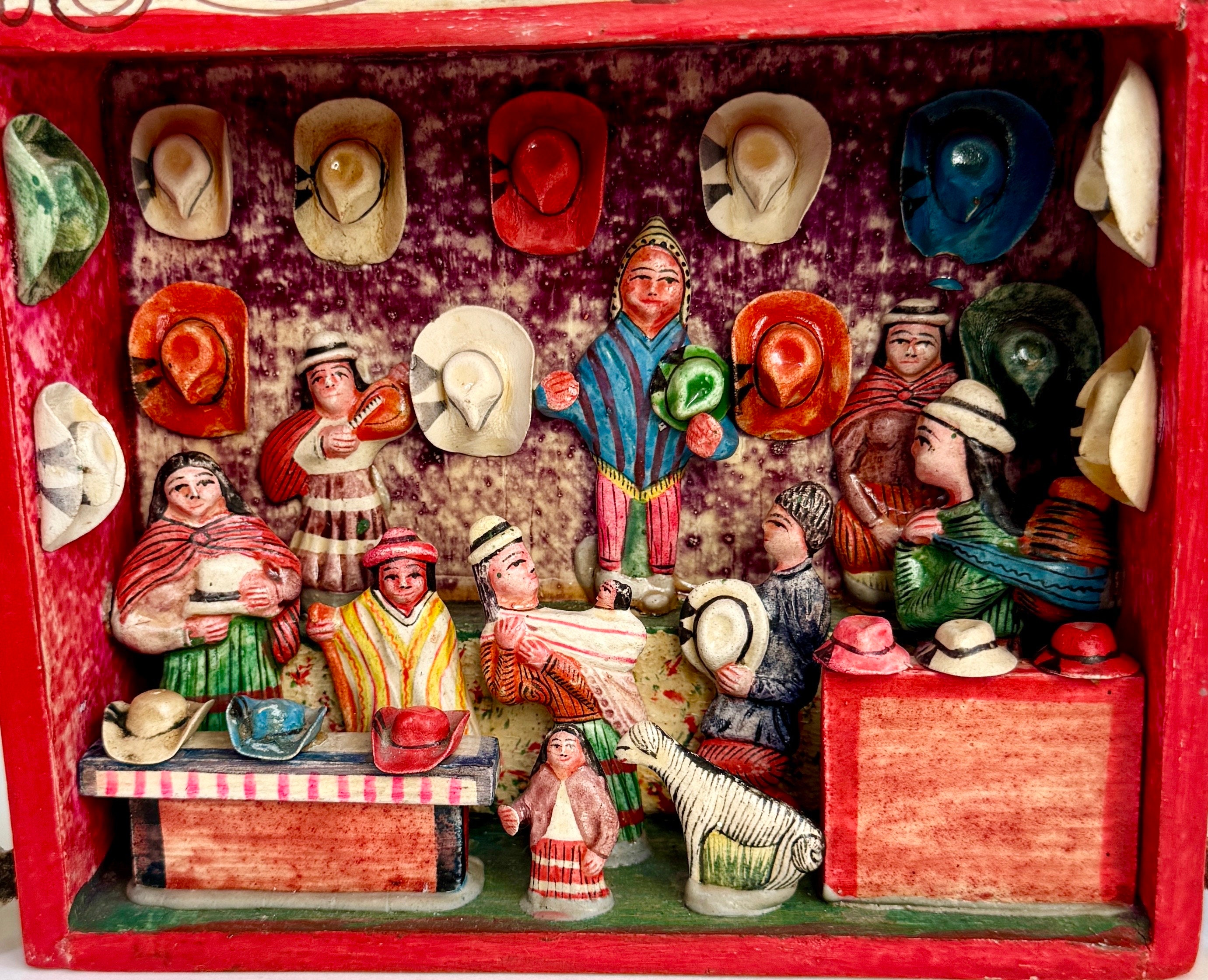 Intricate handmade vintage Peruvian diorama depicting a hat vendor market scene