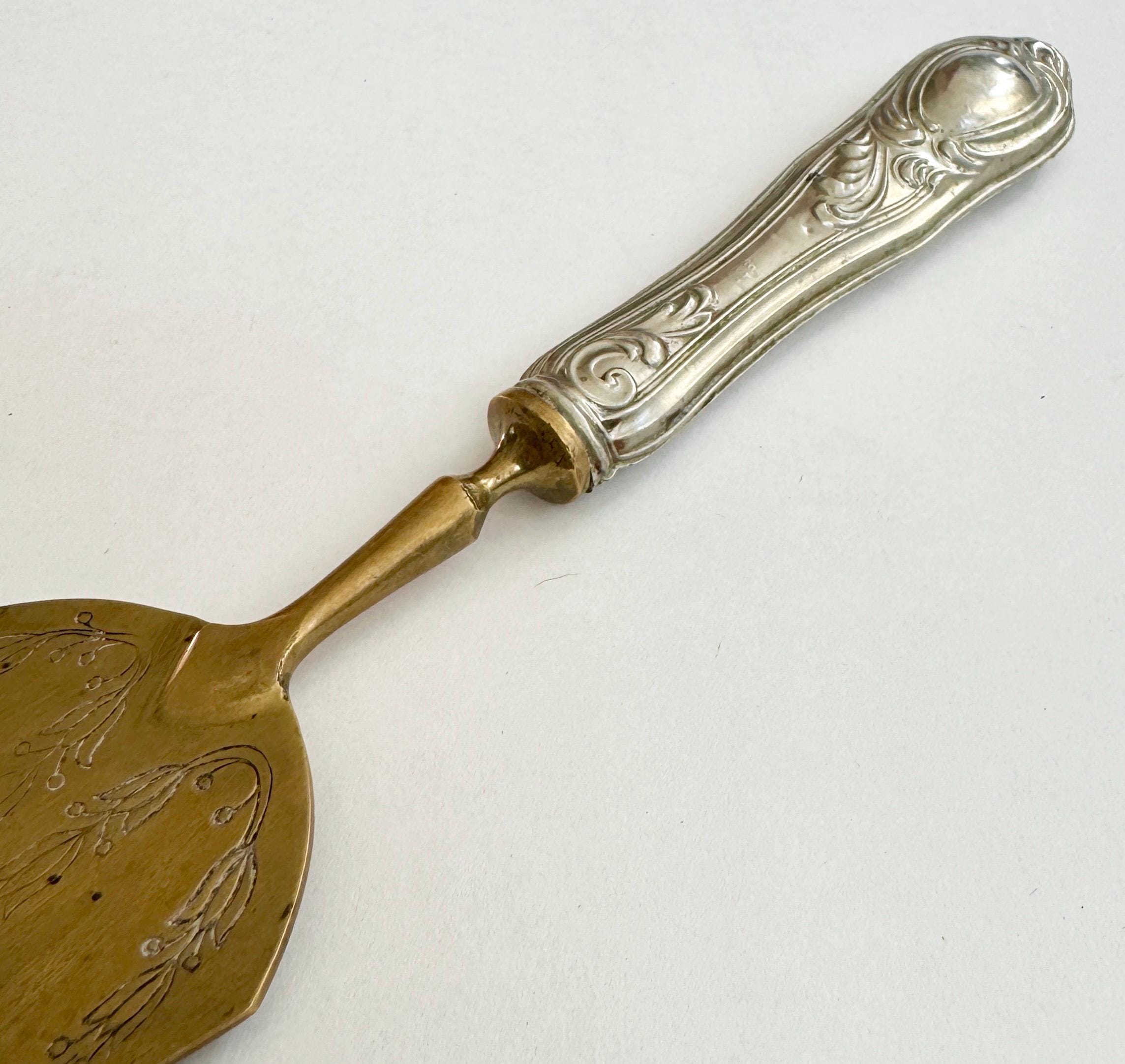 Paris flea market find! Decorative antique floral embossed brass cake server with silver plate handle