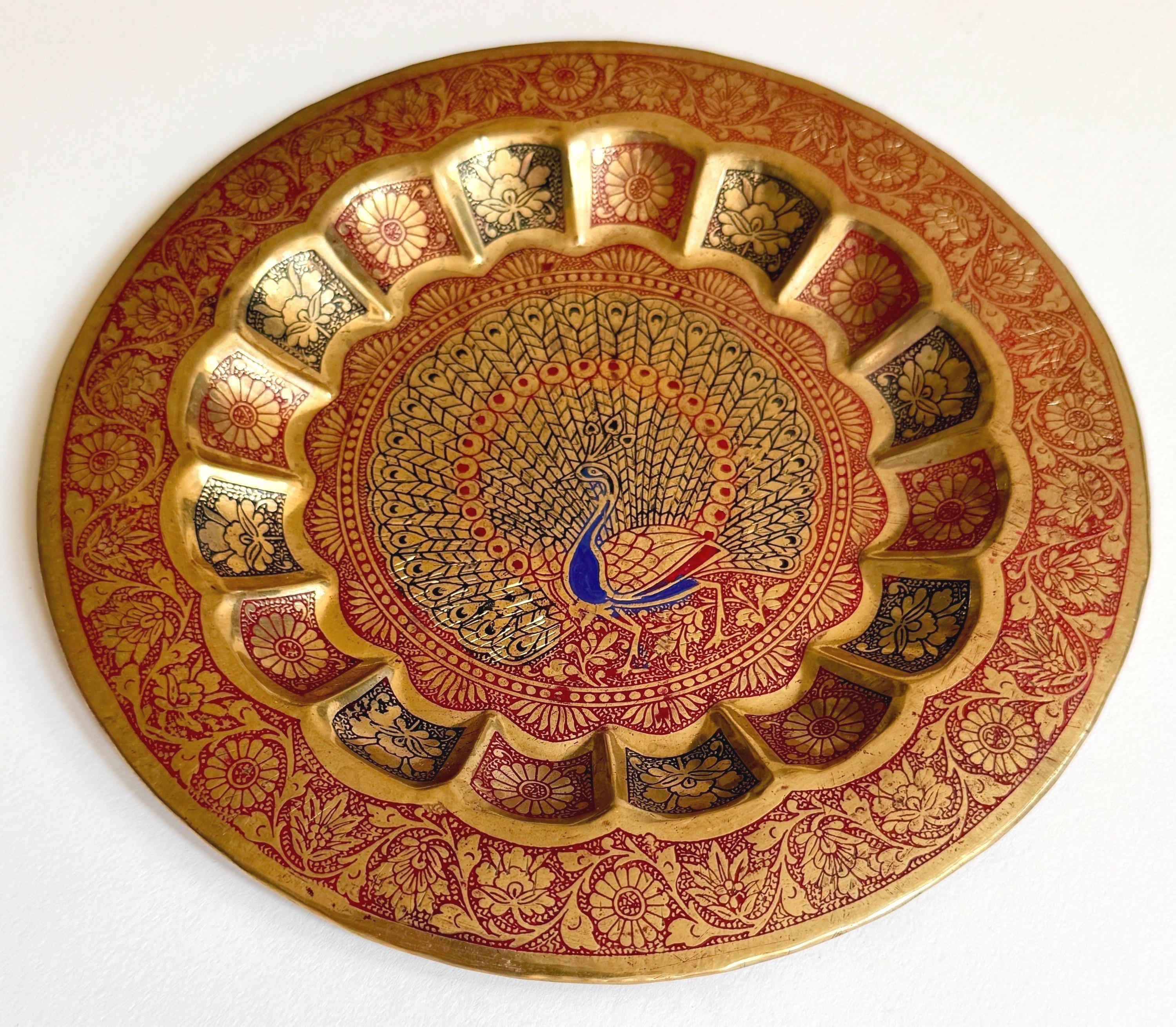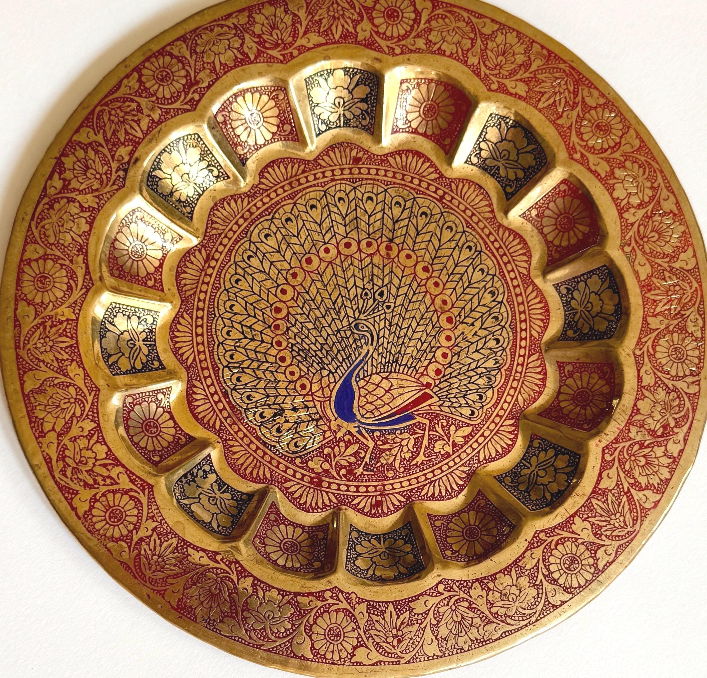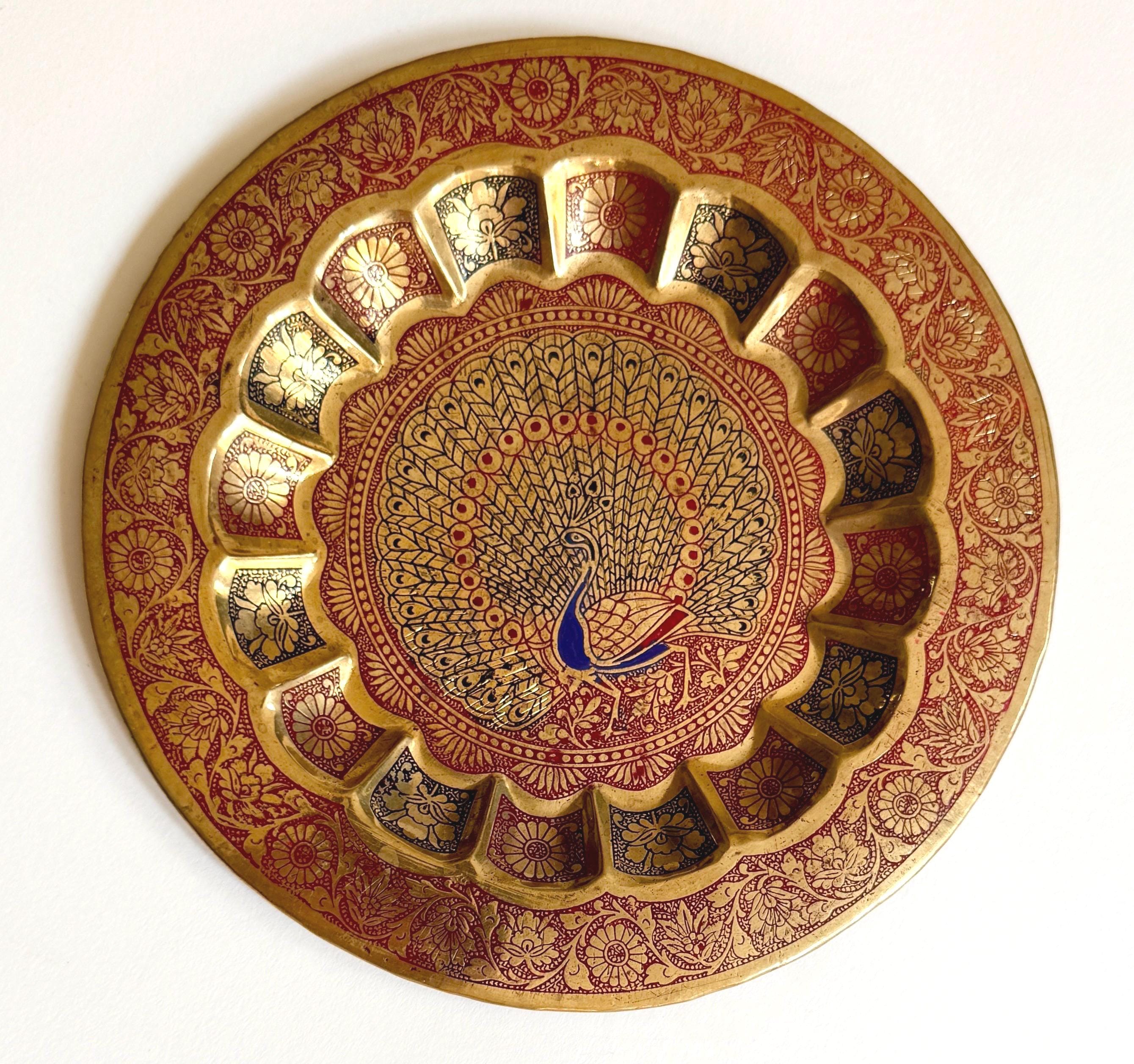 Vintage 70's enameled brass peacock dish