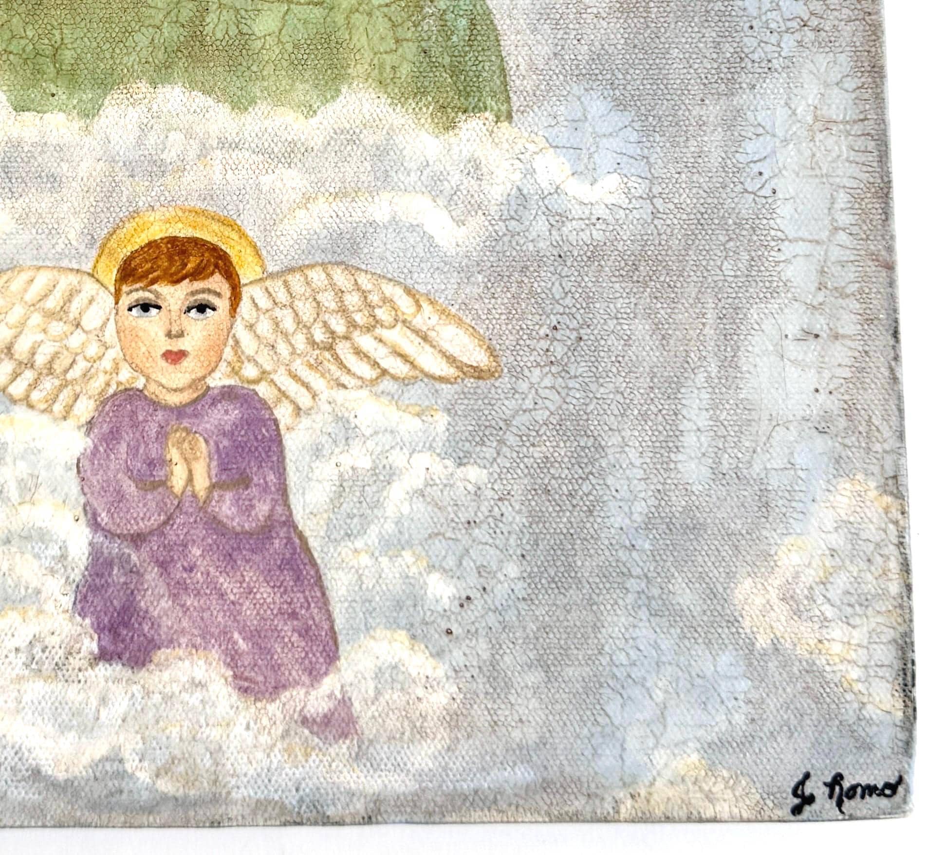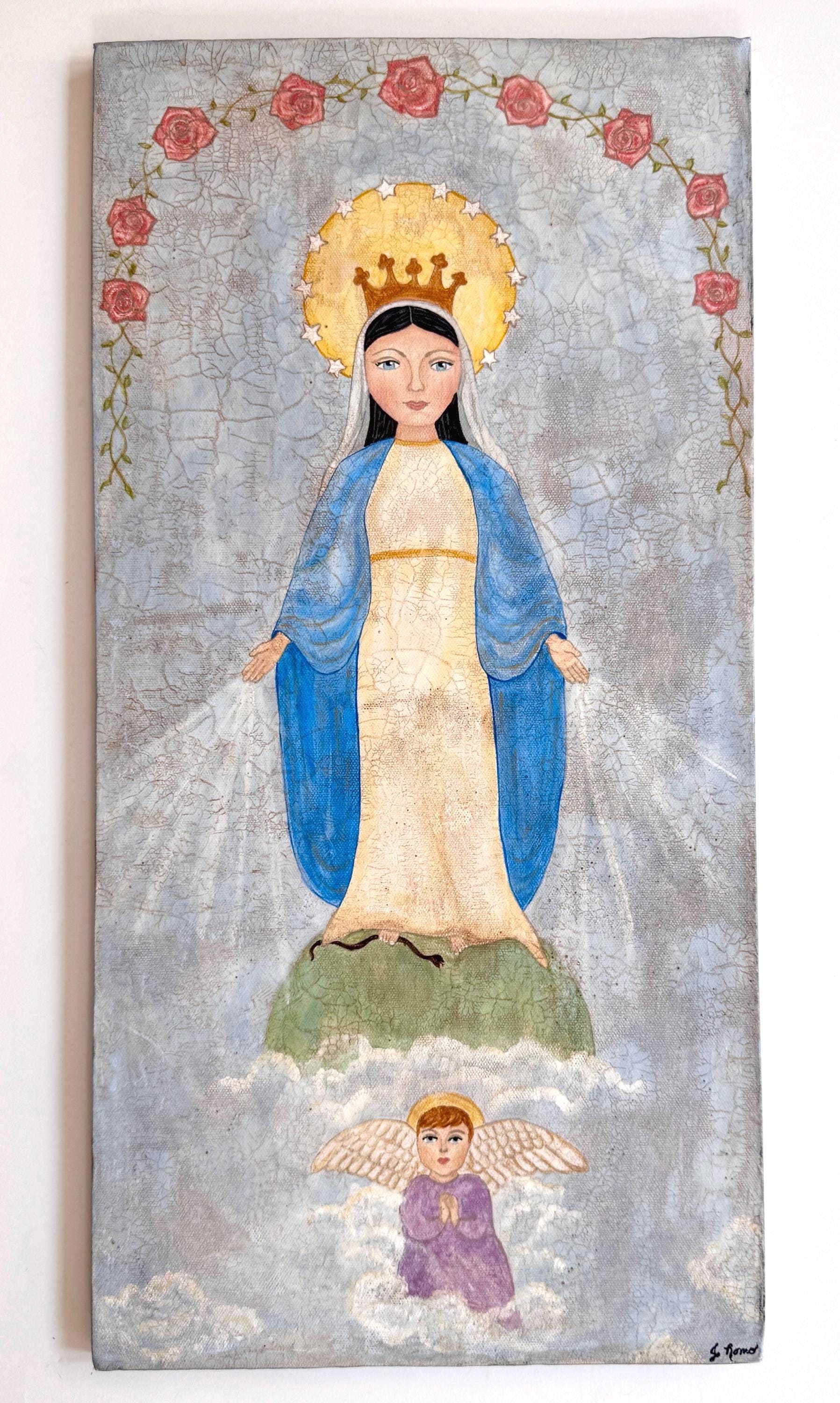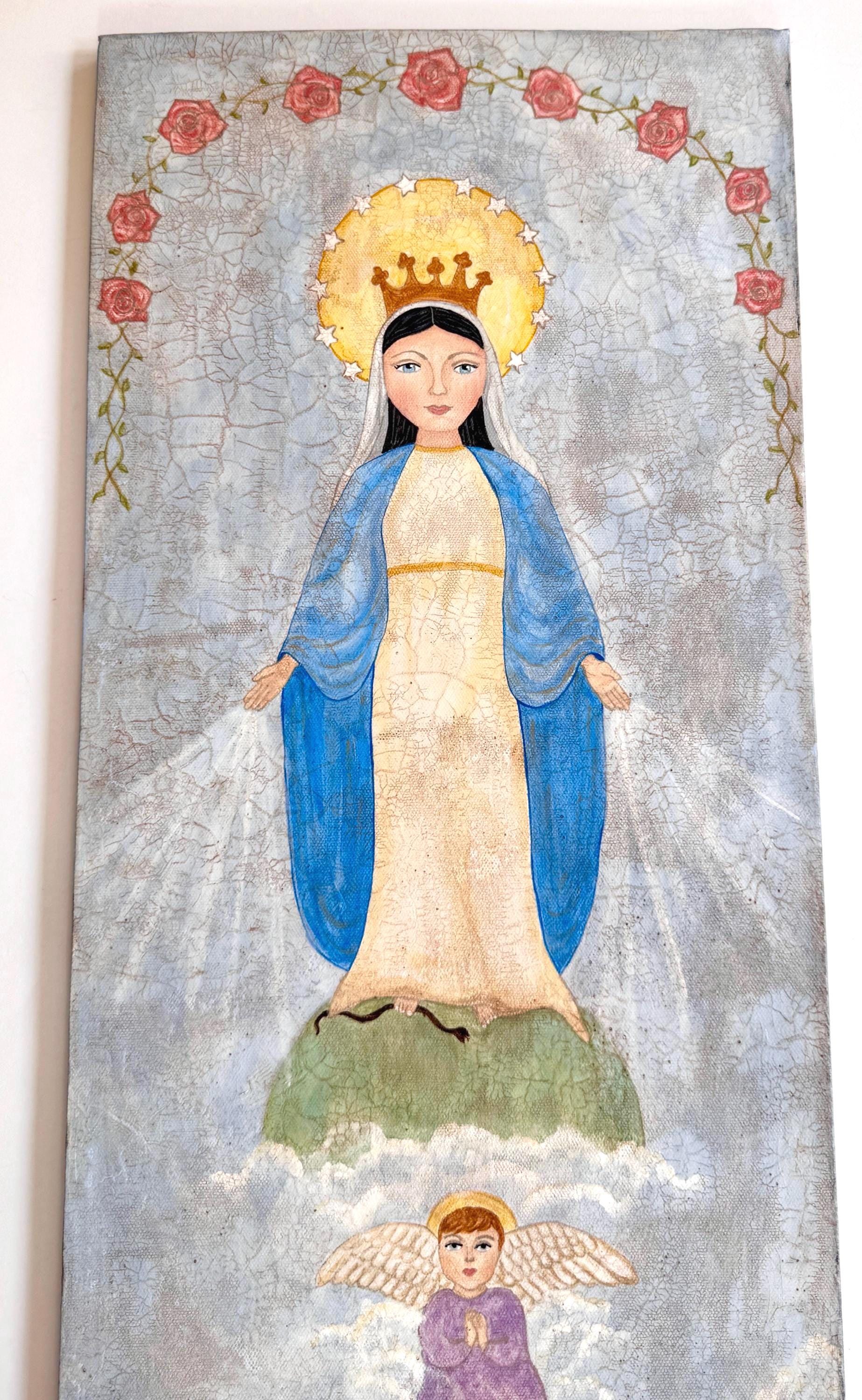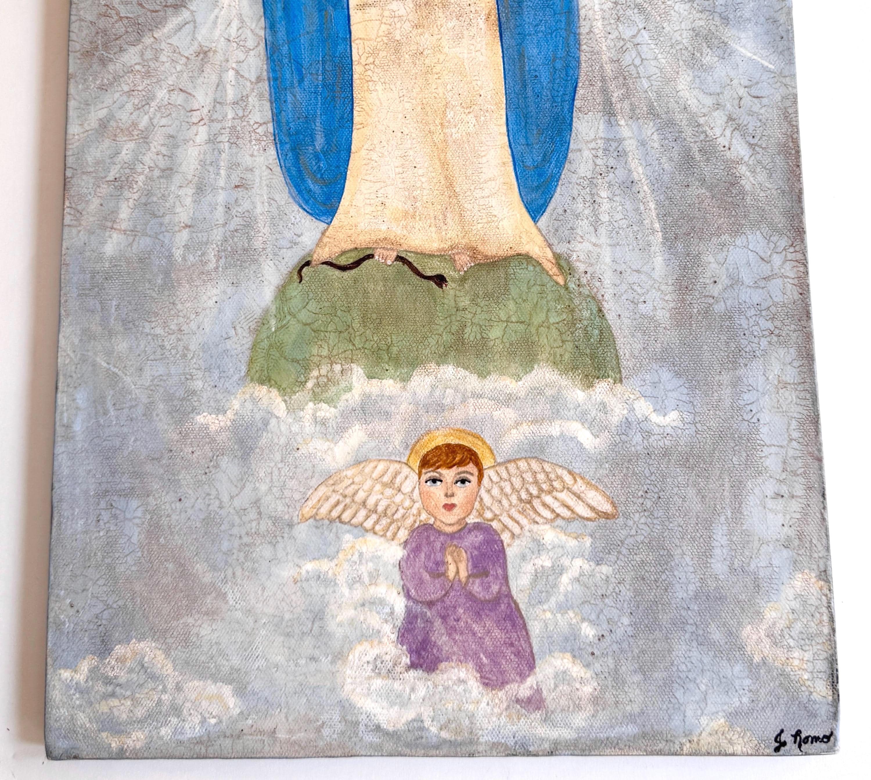 Vintage Southwest folk art painting depicting the Virgin Mary with an angel at her feet