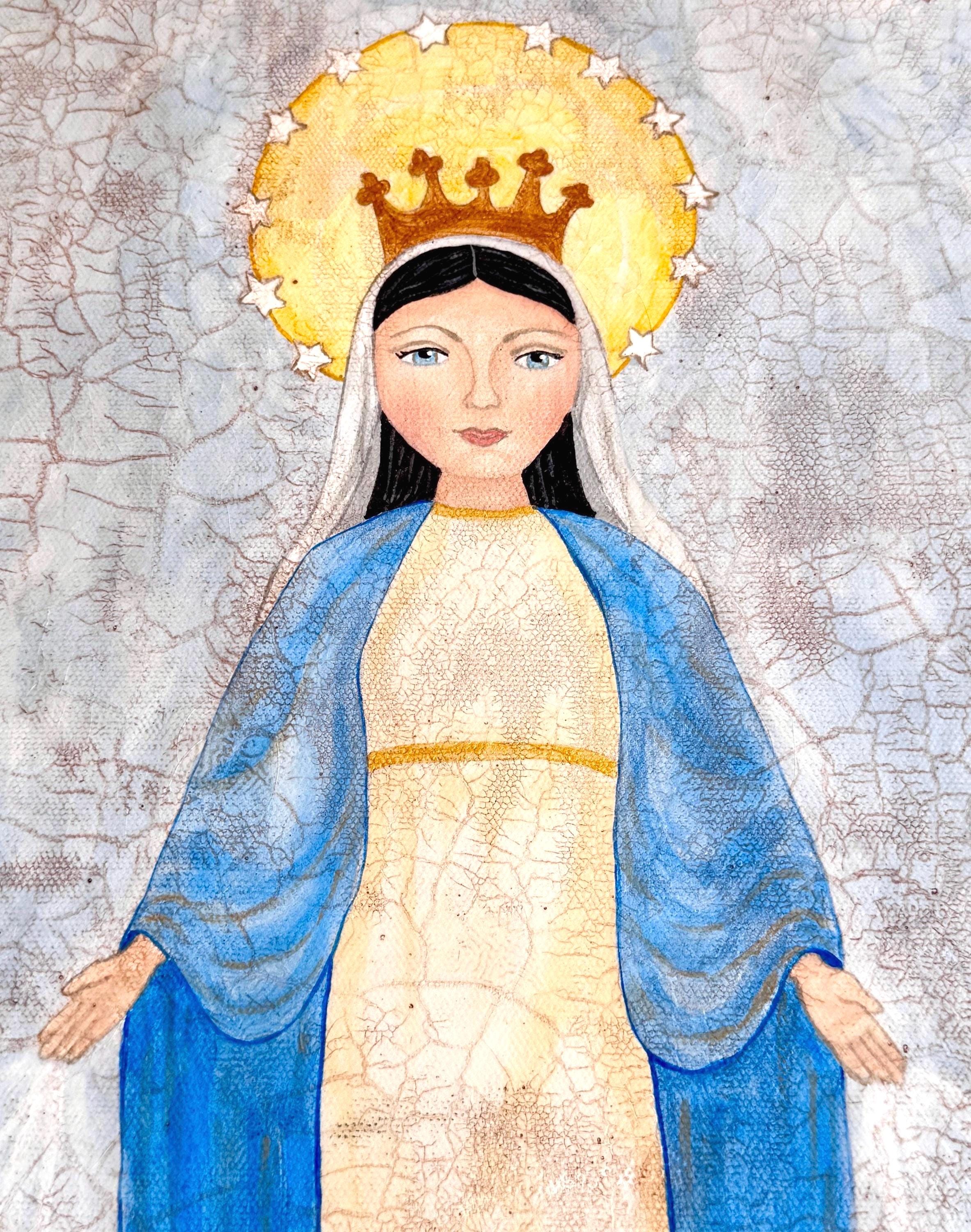 Folk Art Virgin Mary Painting Original Vintage Southwest Art Female Saint Angel Artist Signed Homer