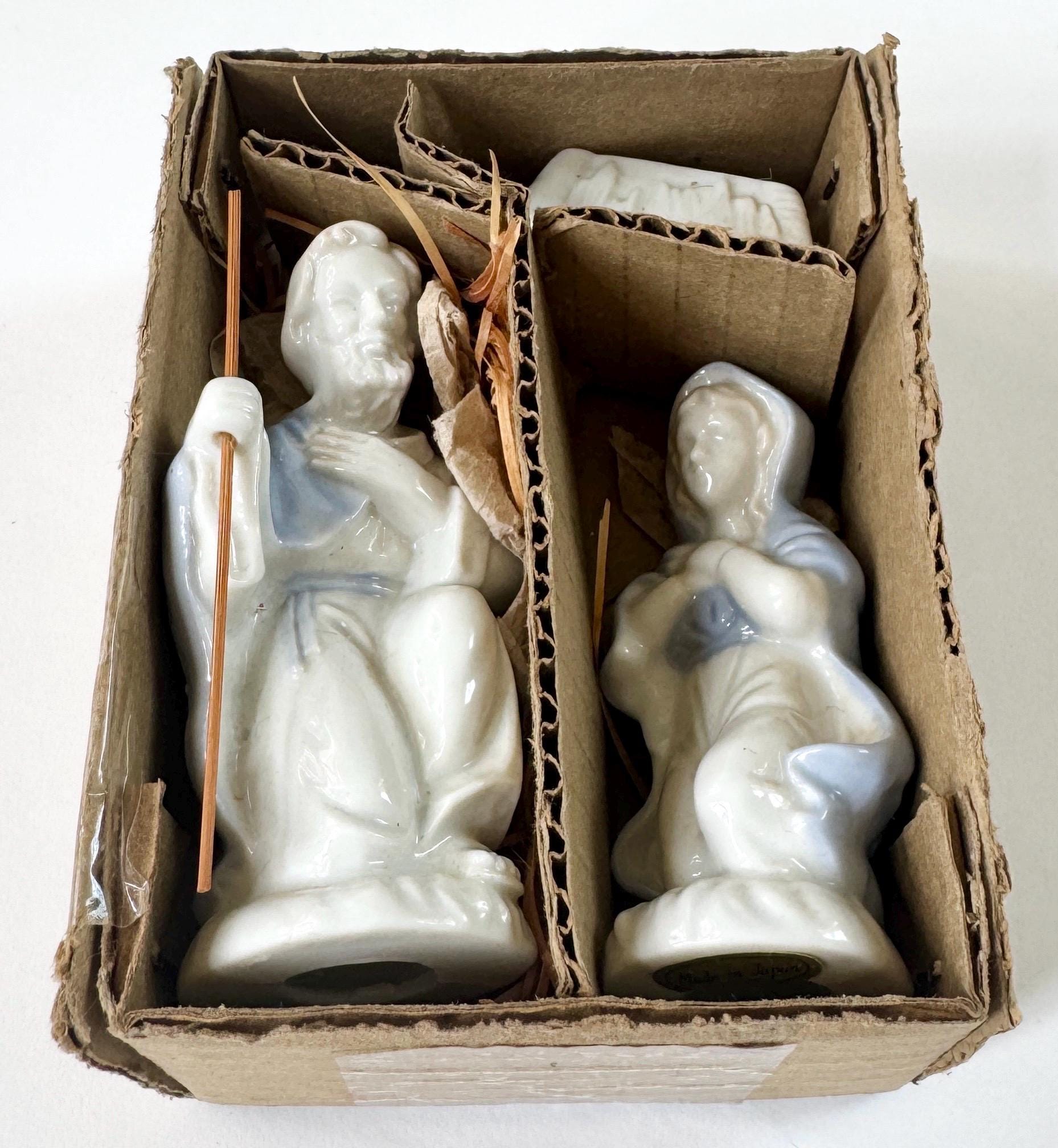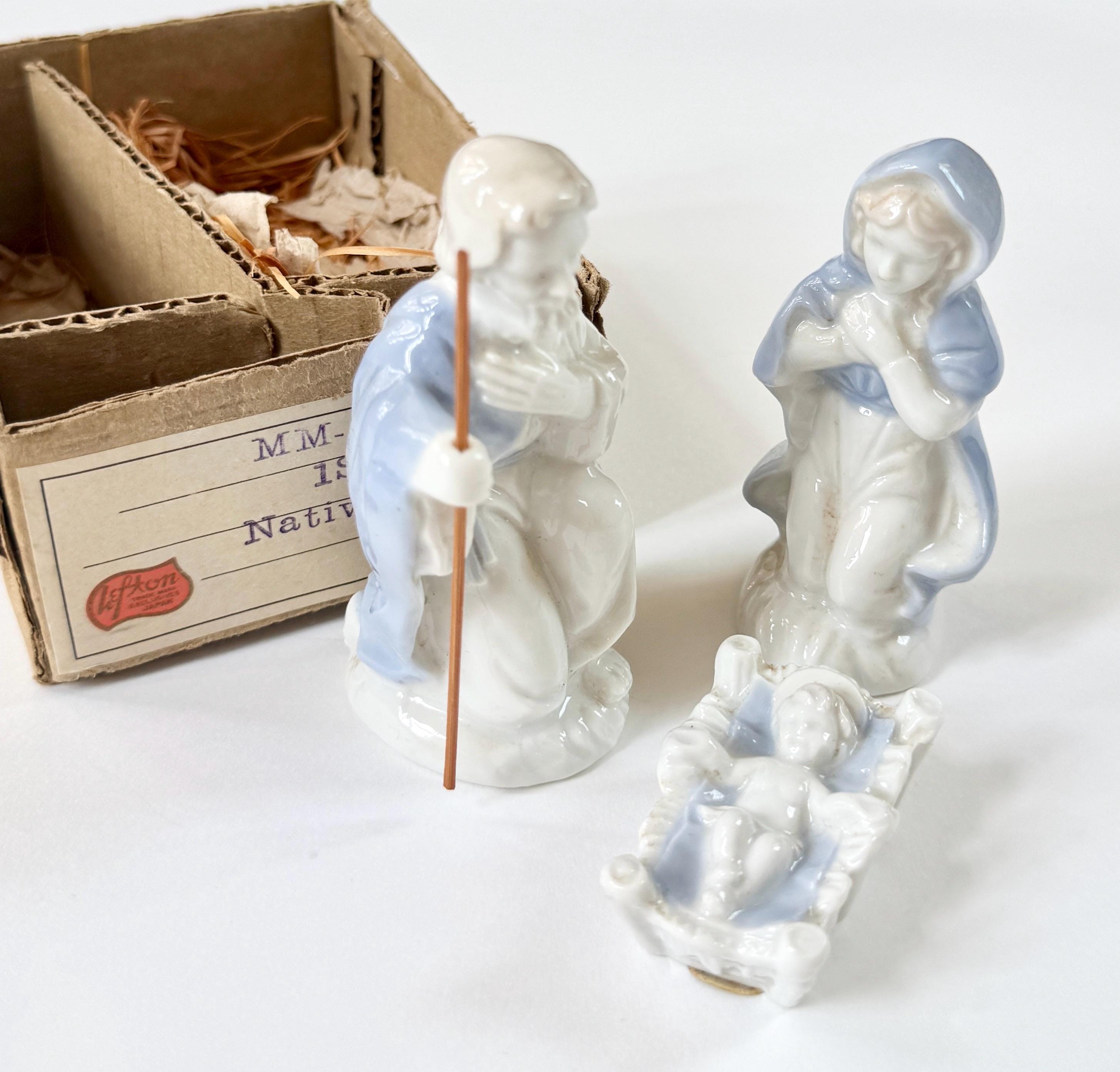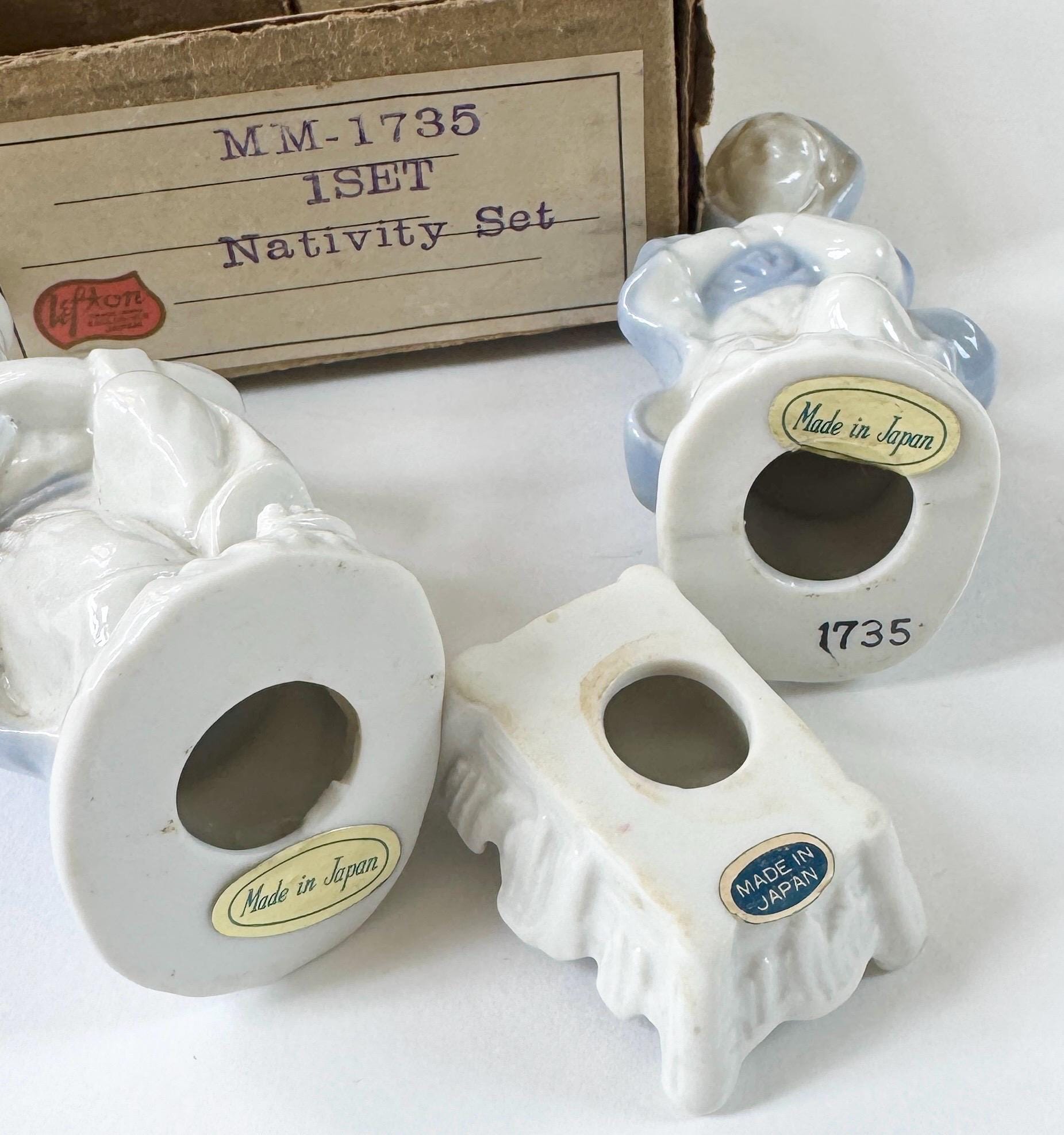 Lefton Japan Nativity Scene Set 1735 Original Box Mid Century Vintage Joseph Mary Baby Jesus Religious Holiday Christmas Decor White Blue