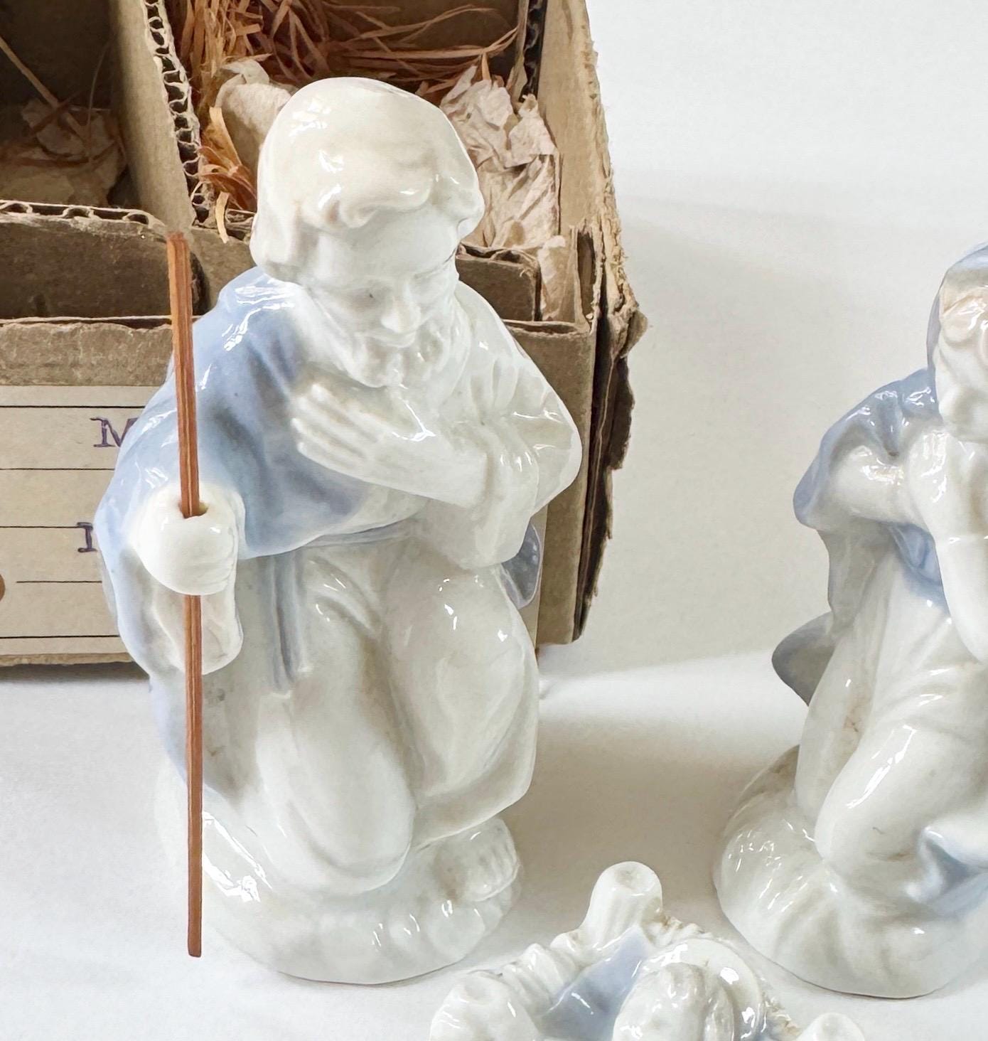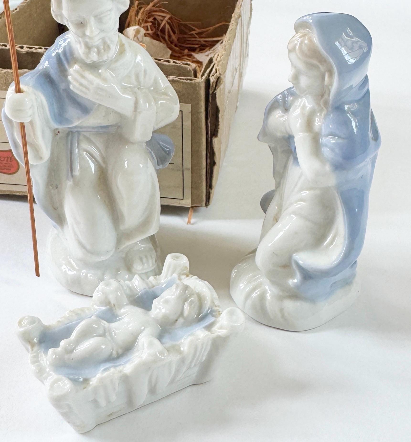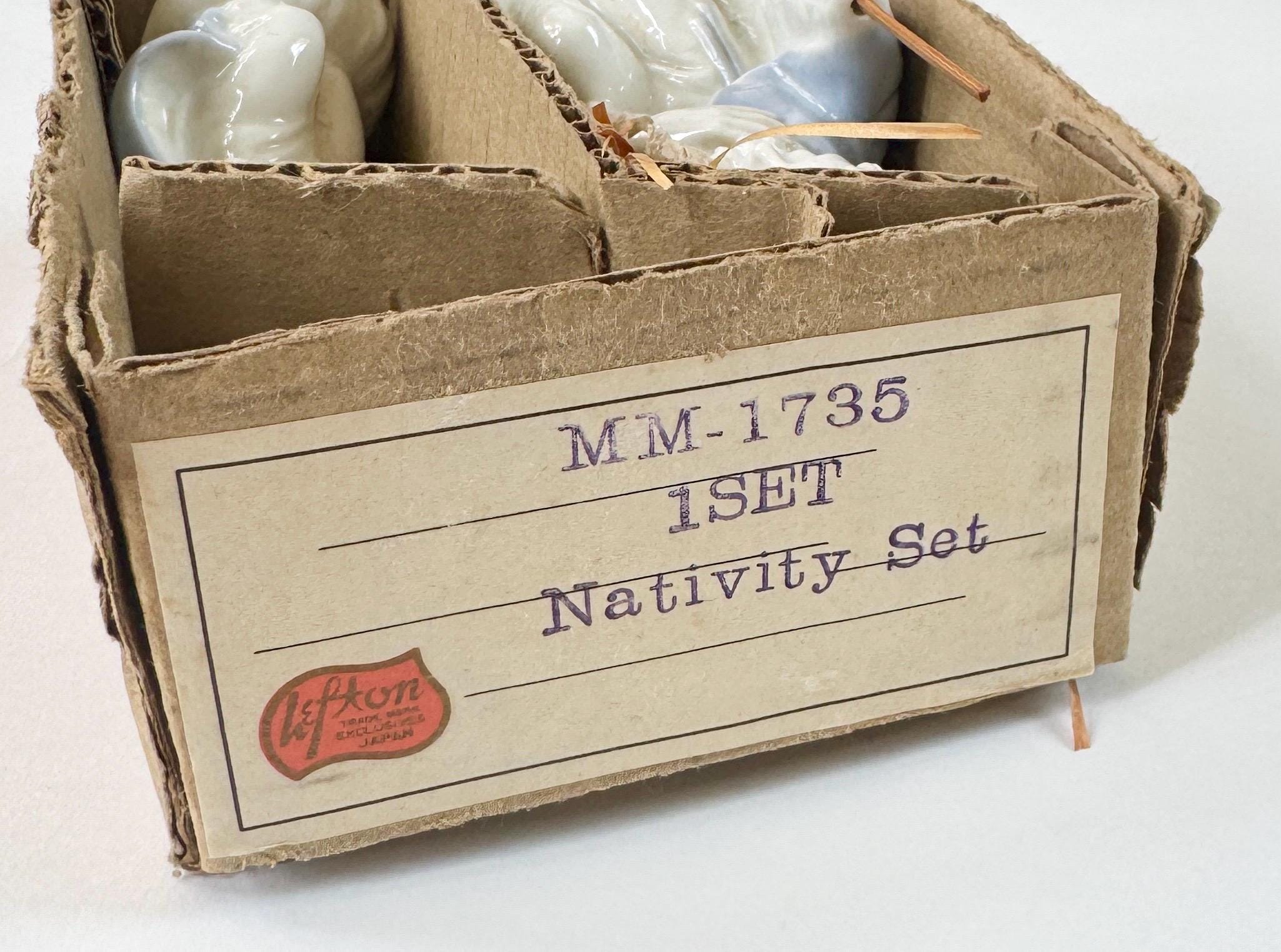 Lefton Japan Nativity Scene Set 1735 Original Box Mid Century Vintage Joseph Mary Baby Jesus Religious Holiday Christmas Decor White Blue