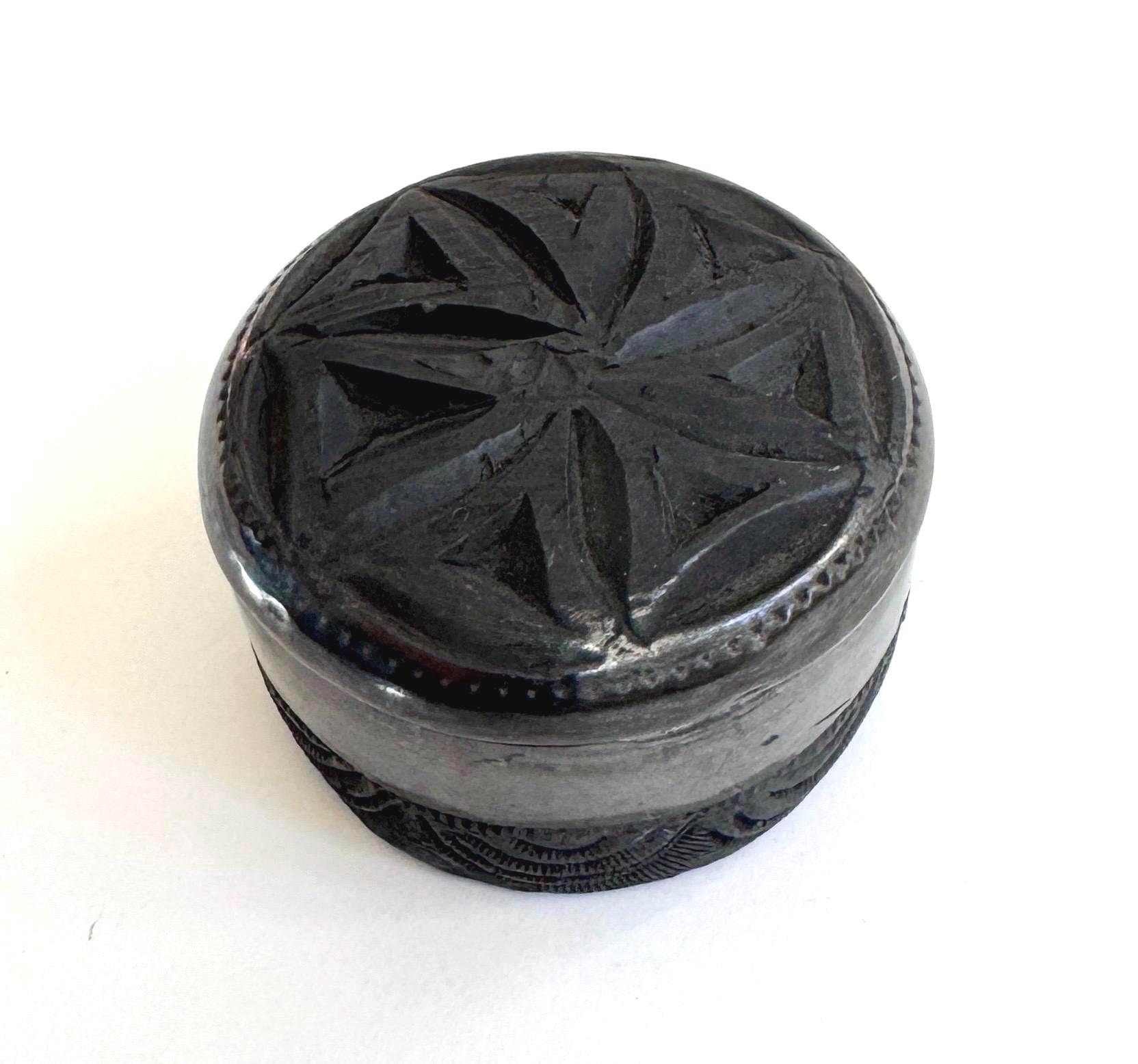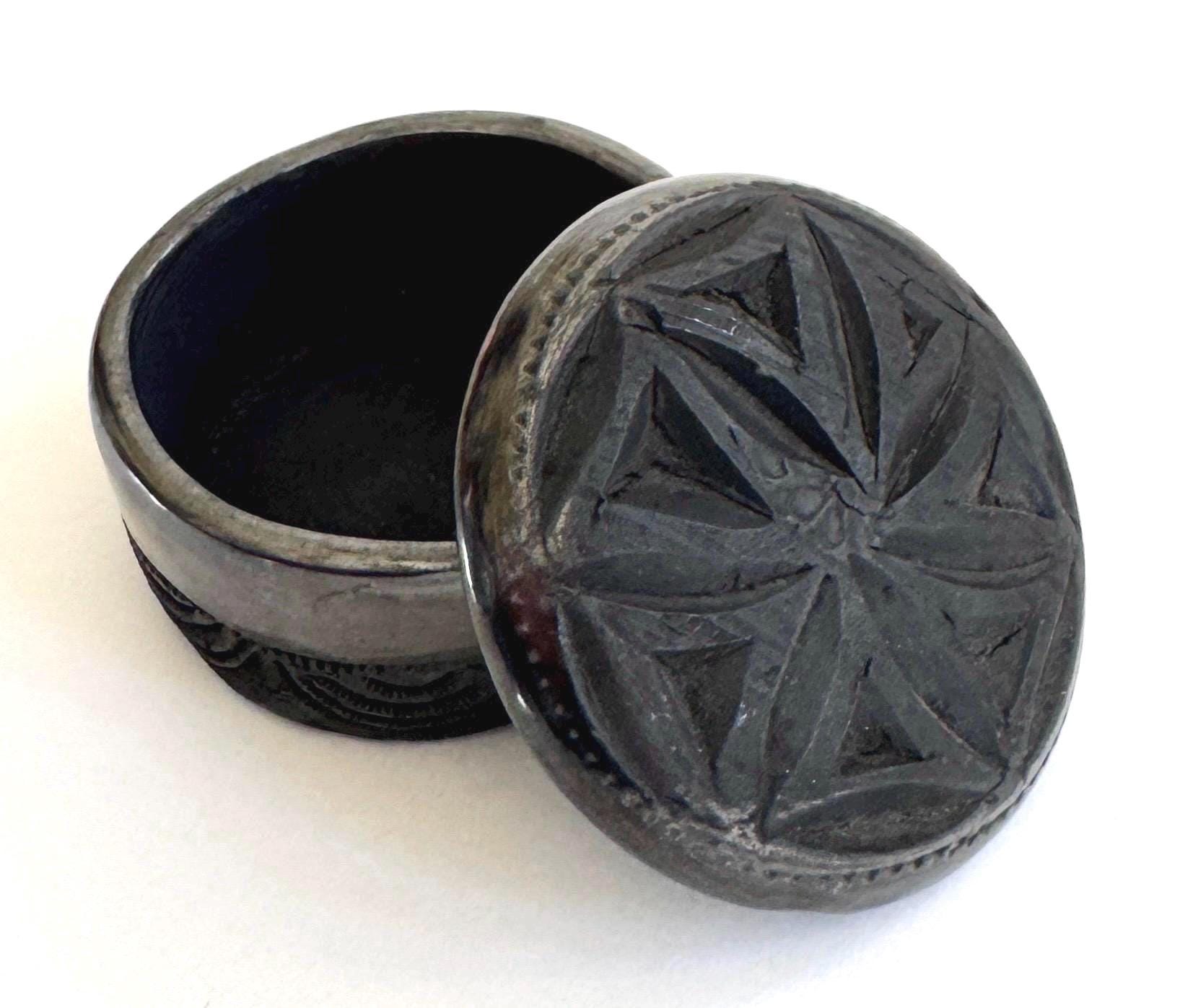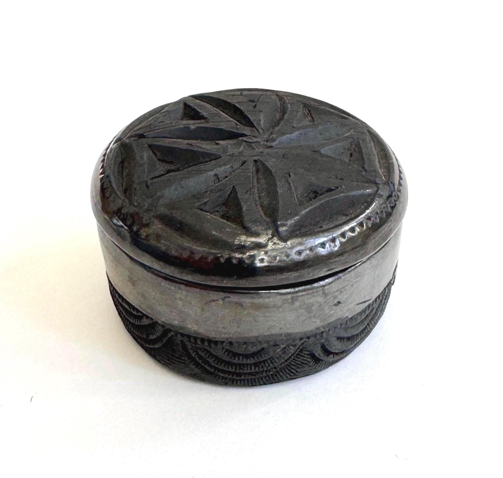 Black Clay Pottery Box Vintage Southwest Native American Round Circle Trinket Stash Ring Box