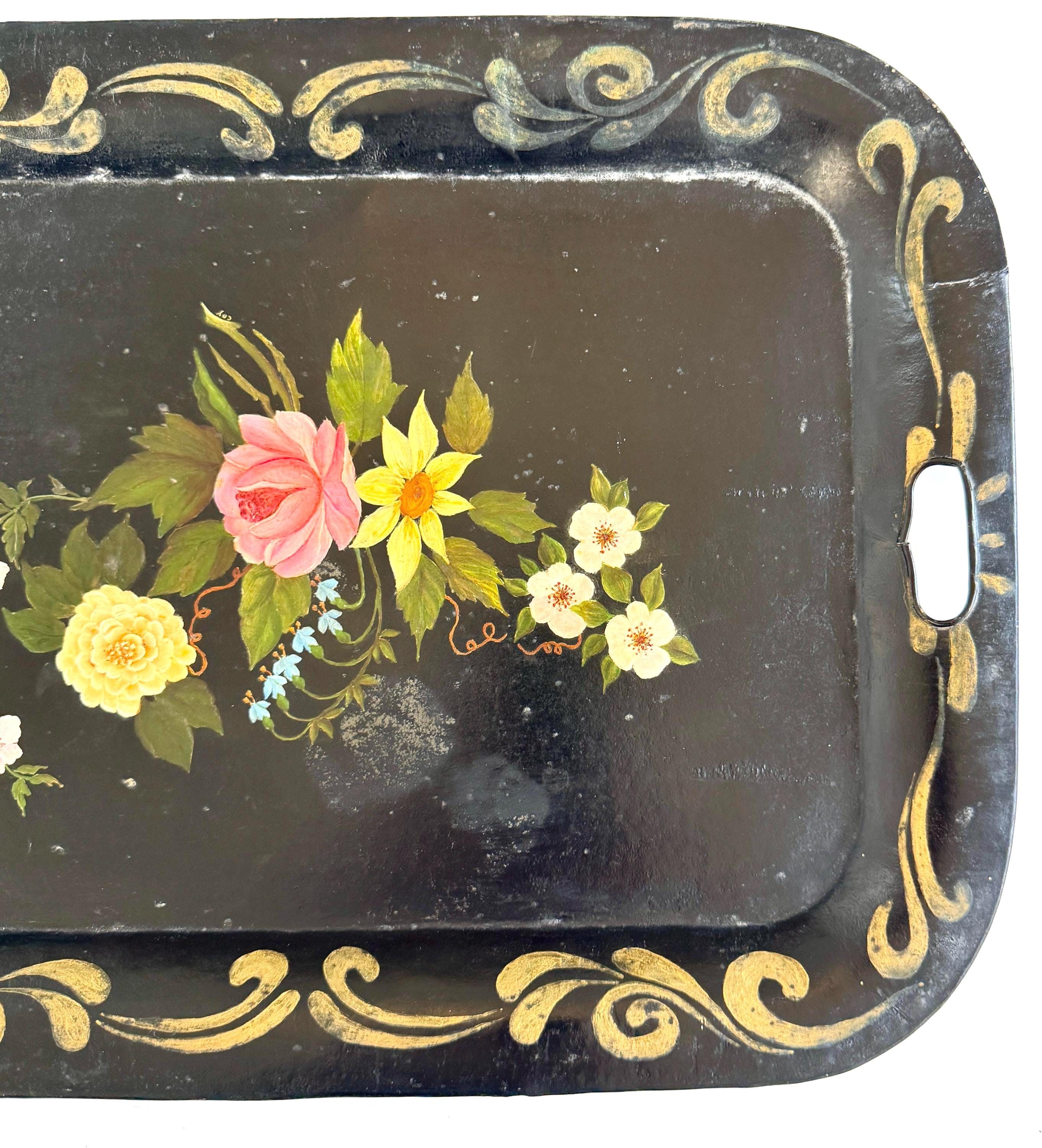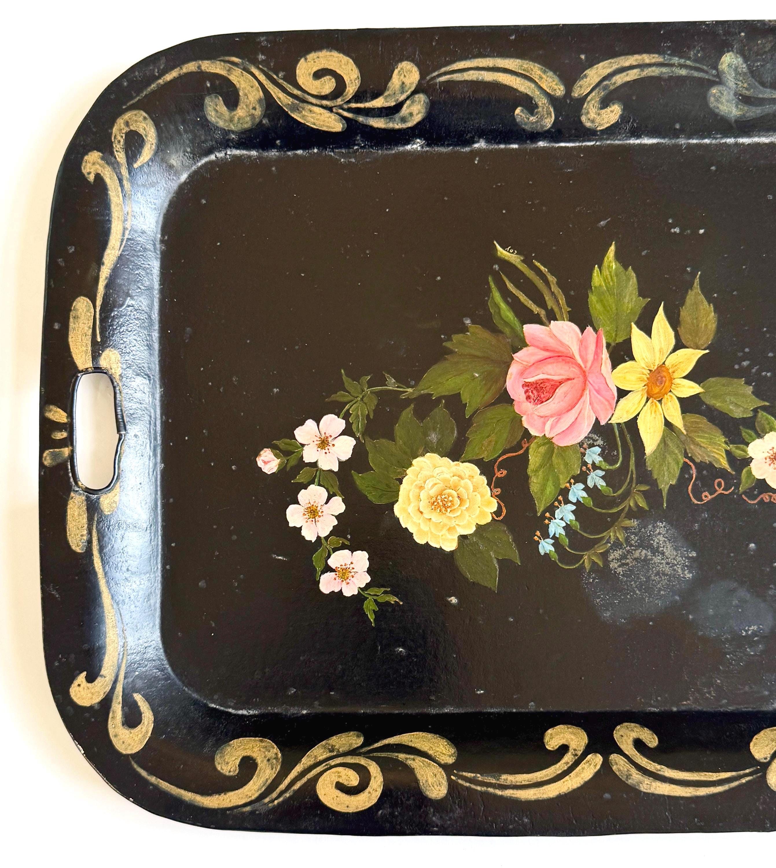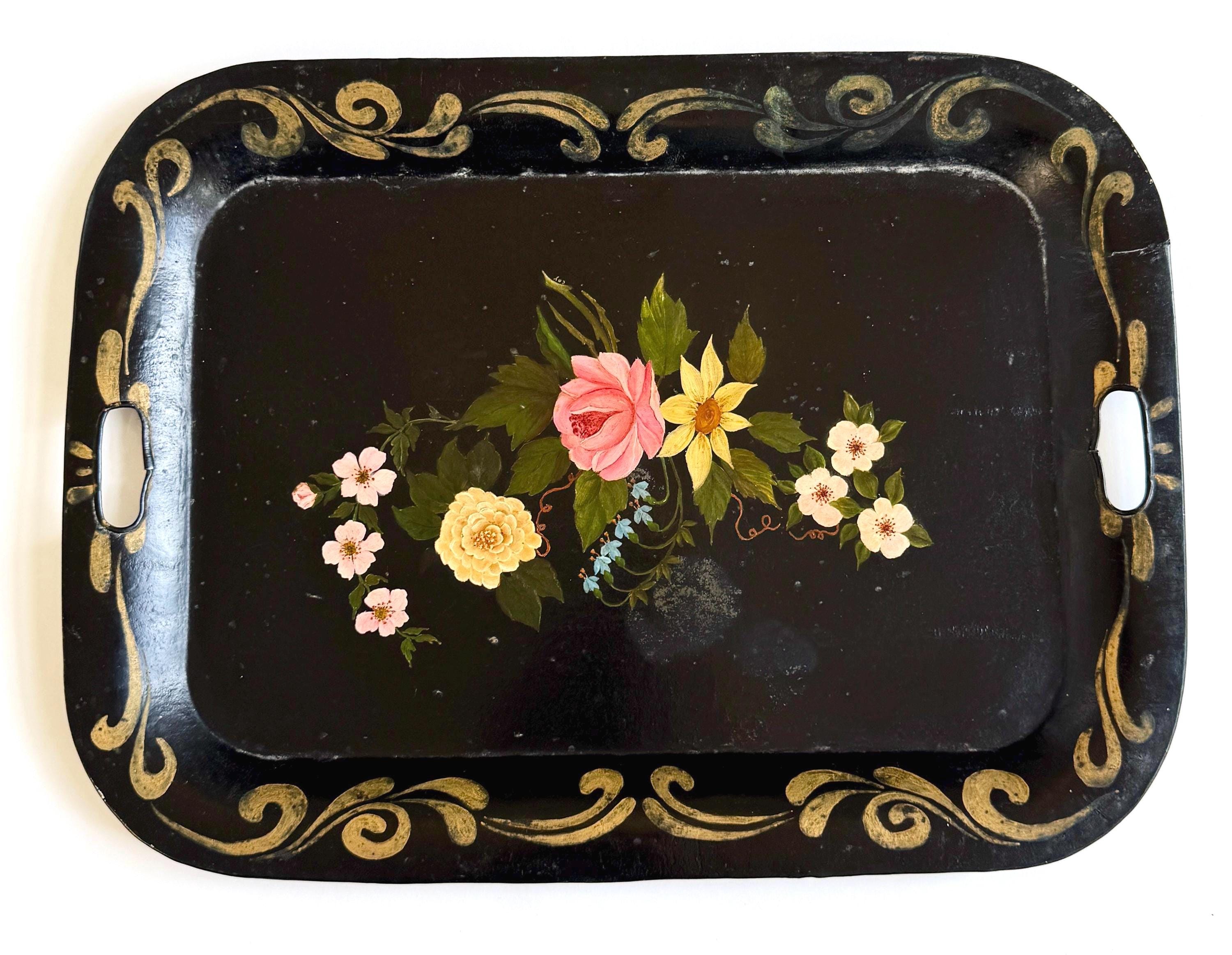 Large Hand Painted Floral Decorative Serving Tray Black Metal Rectangle French Farmhouse Cottage Core