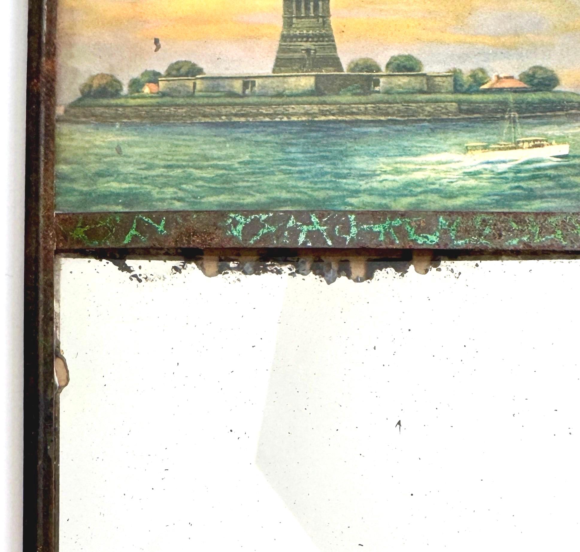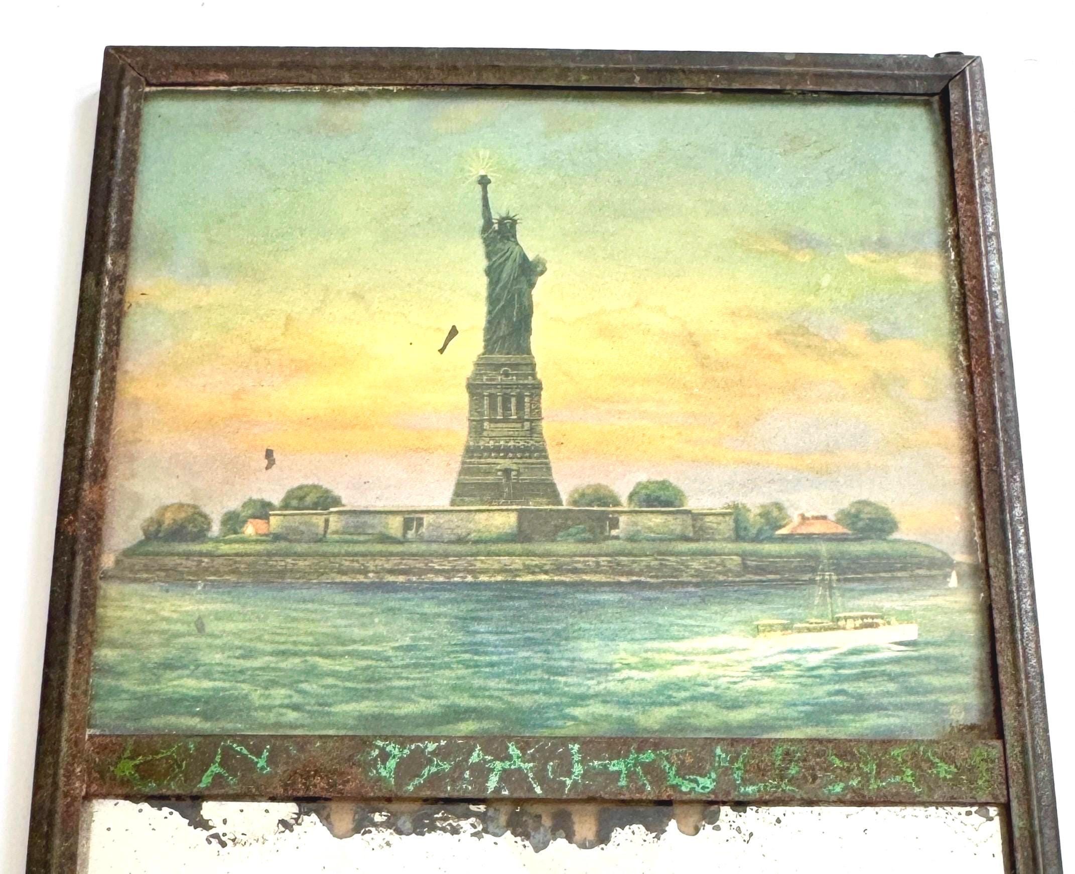 Antique mirror with an image of the Statue of Liberty framed in glass