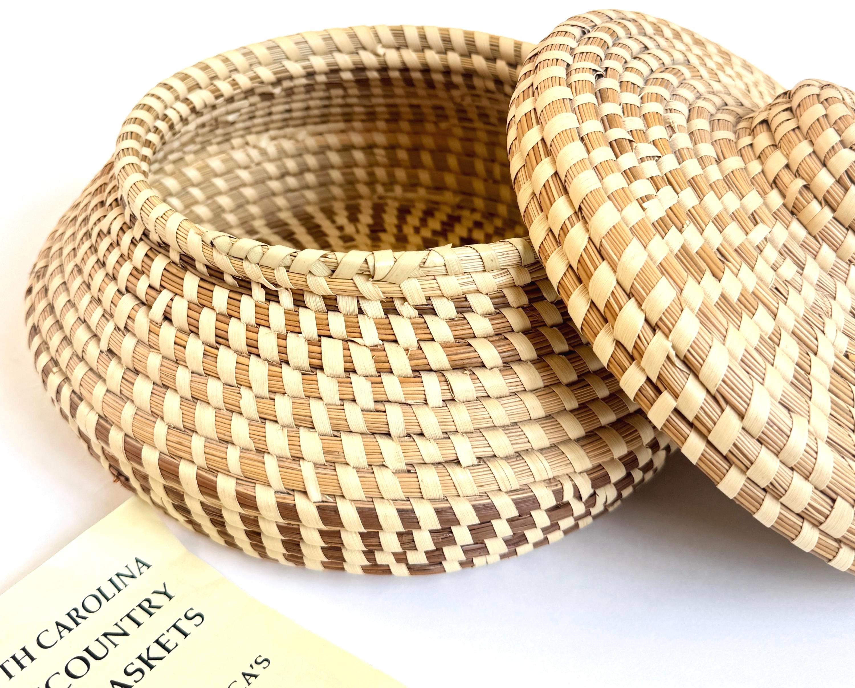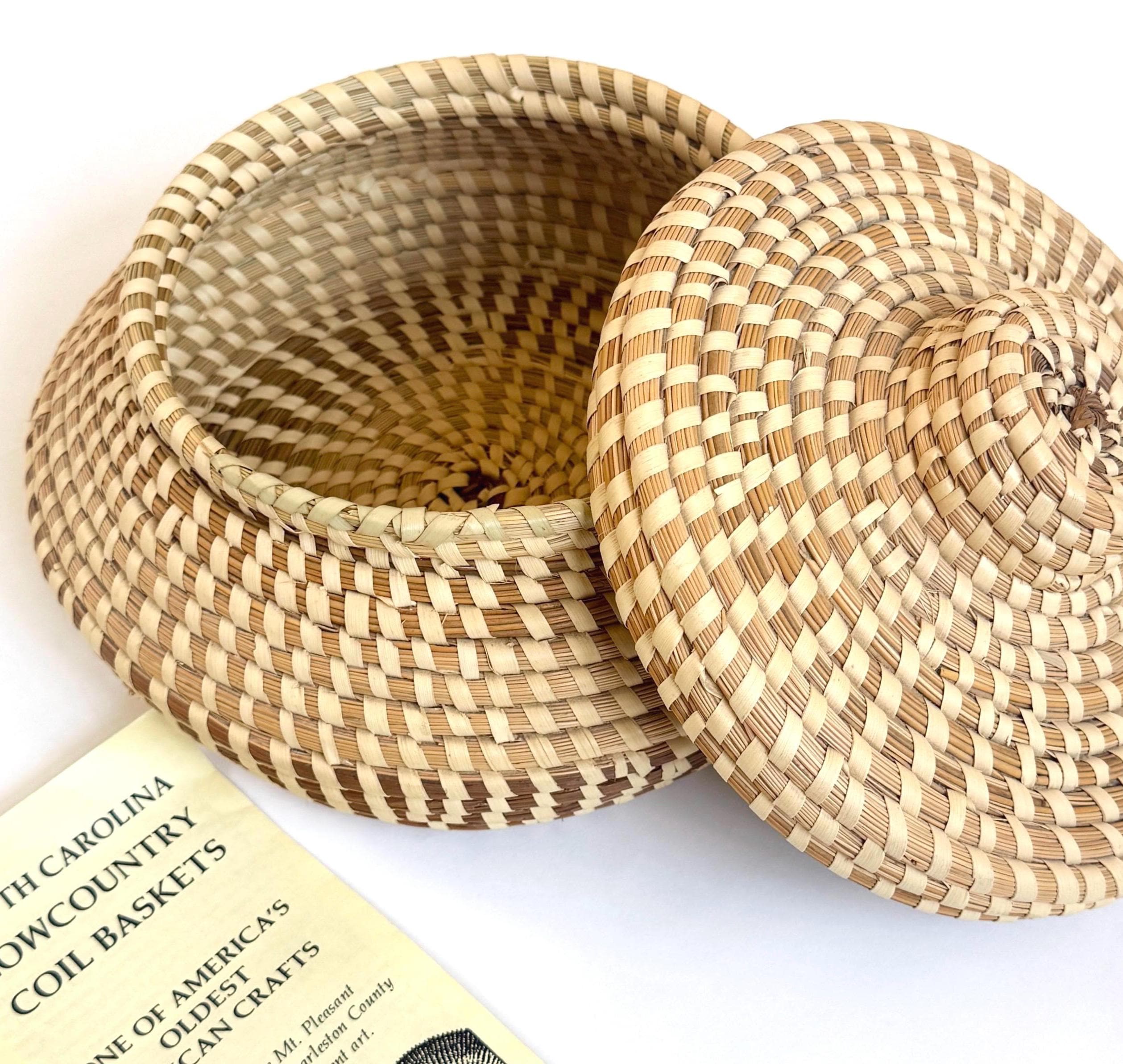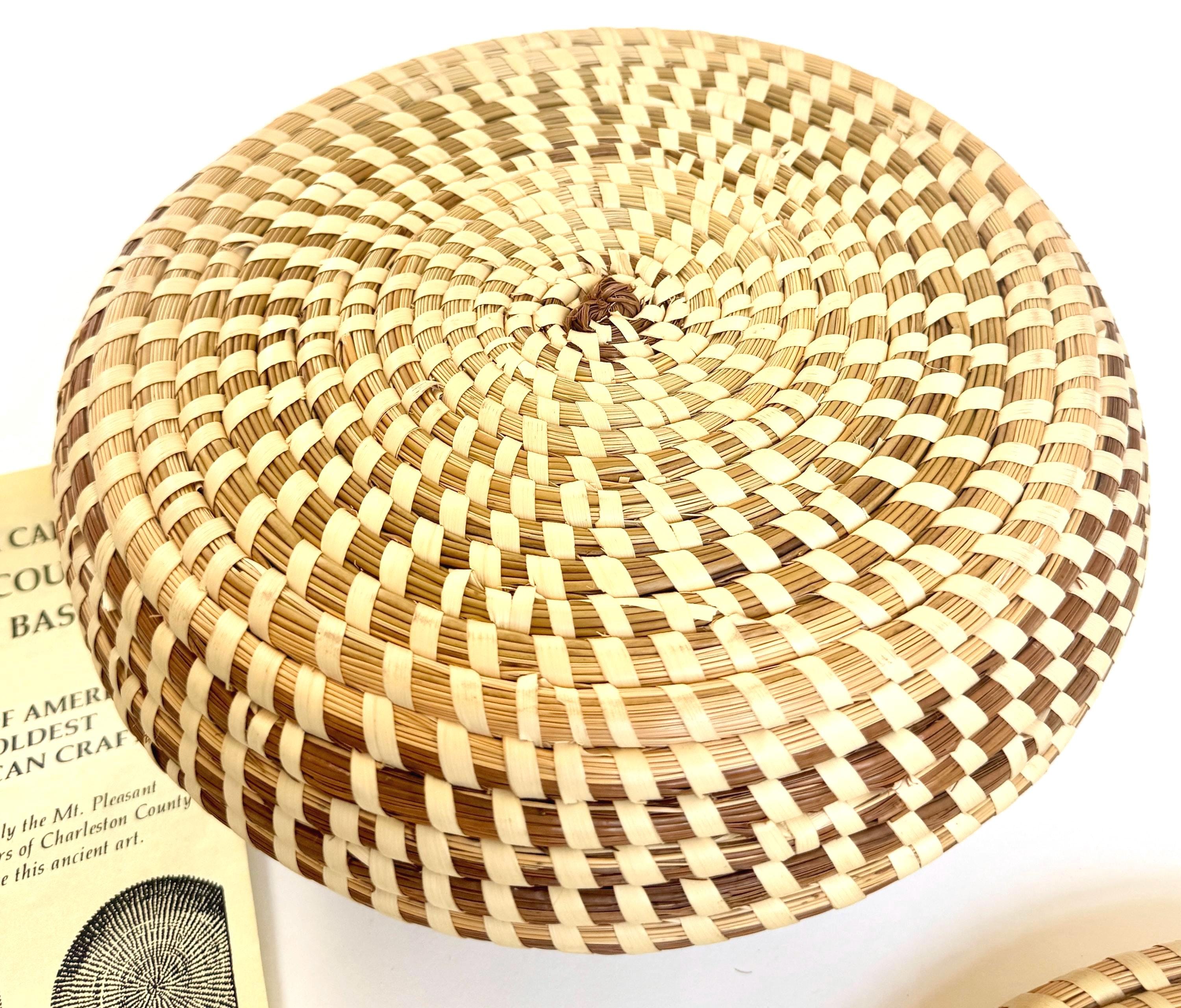 Finely woven vintage Charleston Gullah lidded basket with original paperwork