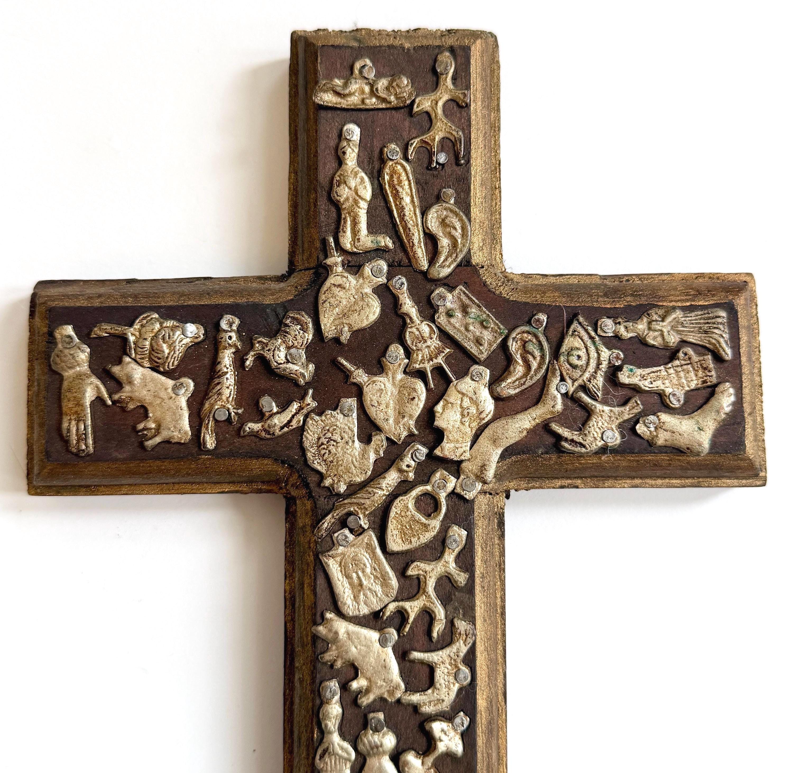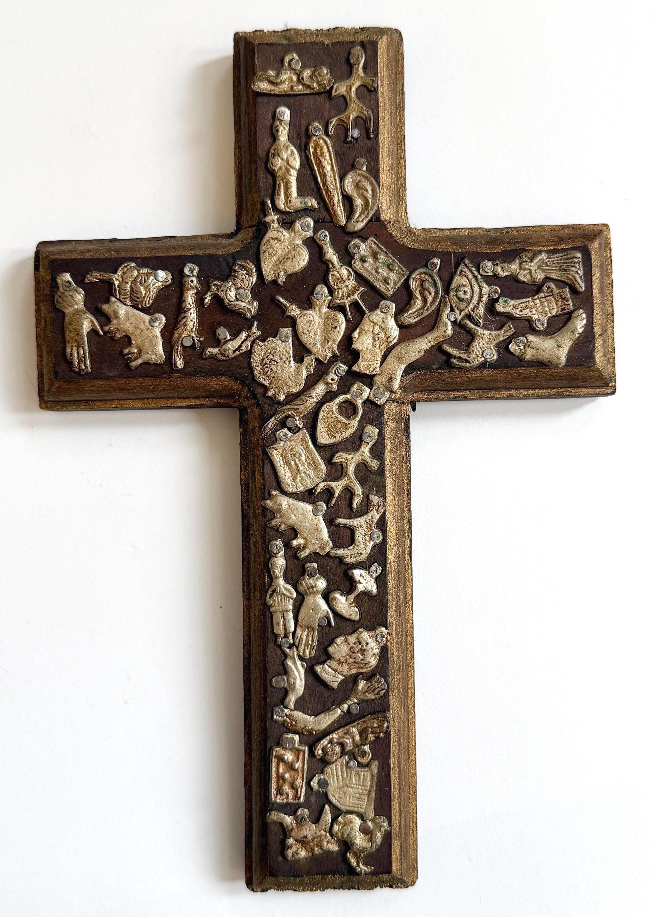 Mexican Folk Art Wood Cross Crucifix Religious Wall Hanging Covered in Milagros