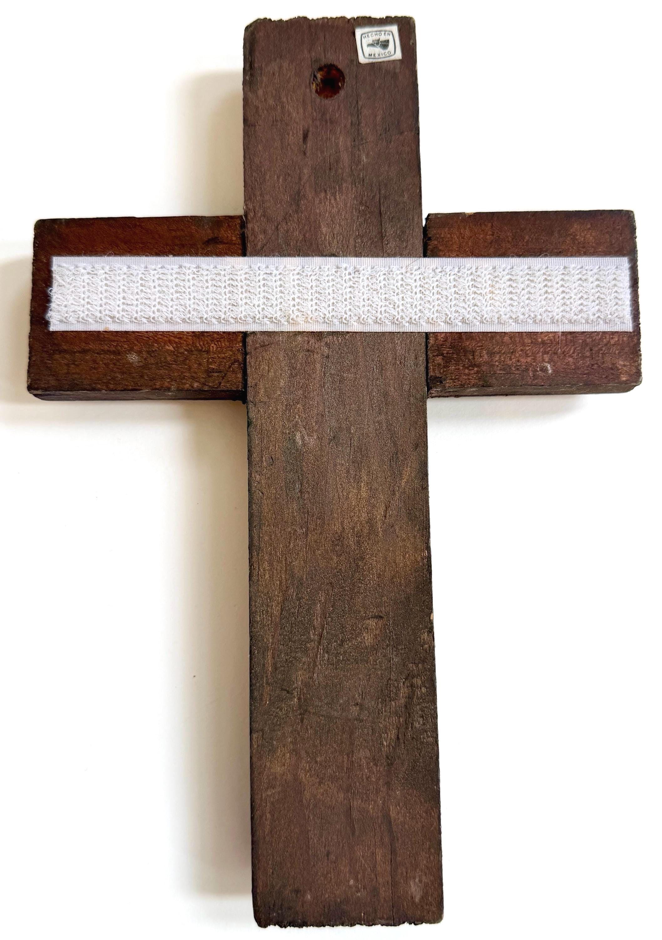 Good vintage condition with aged patina. The gold paint along the edge is quite worn. Please note the piece of velcro applied at back of cross.
