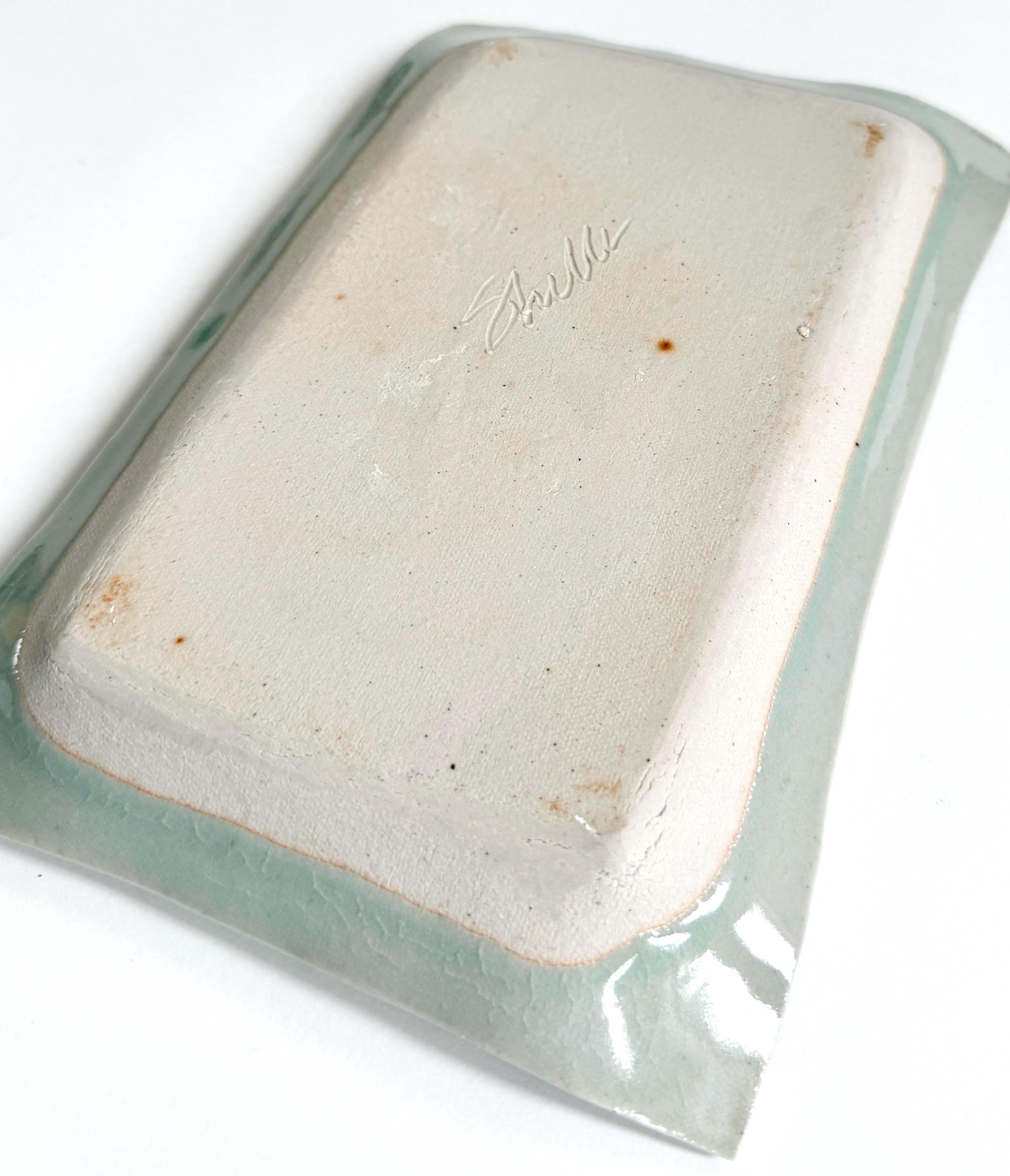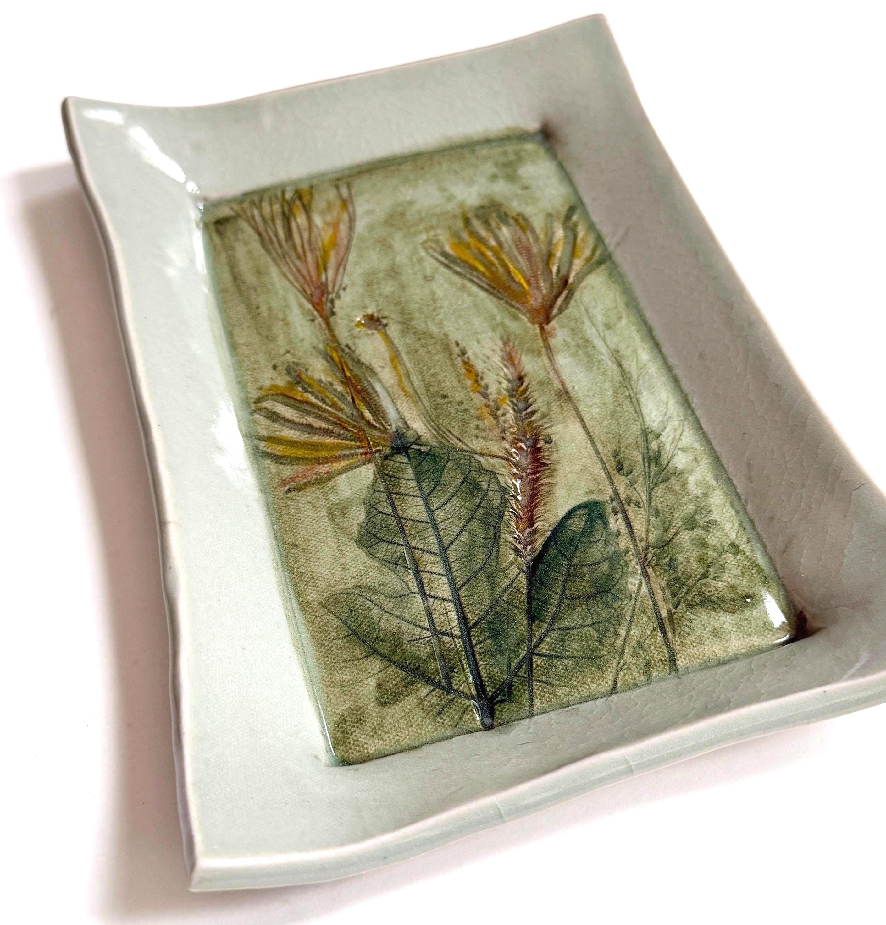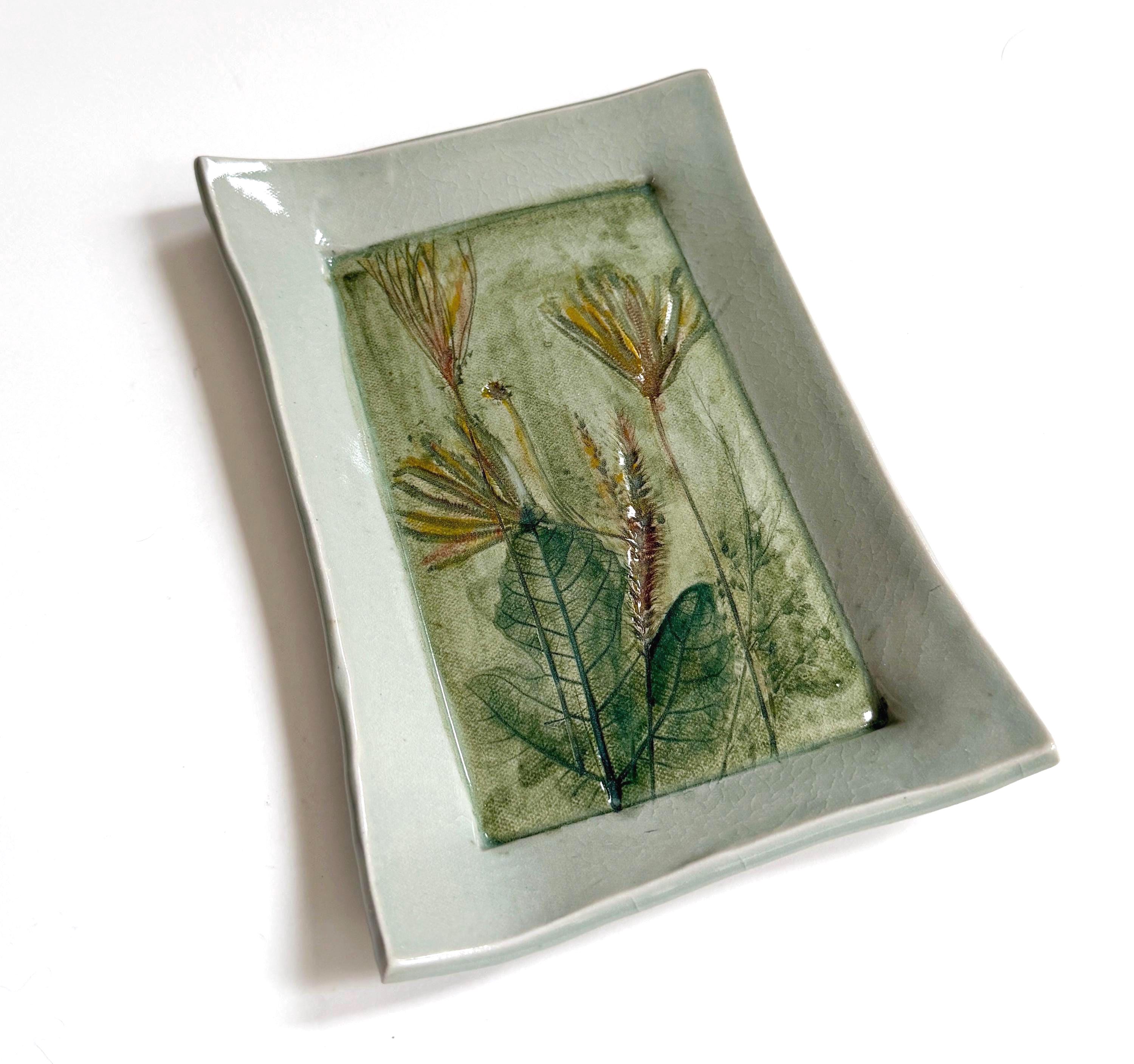 Vintage Leaf Studio Pottery Dish Etched Leaves Celadon Jade Green Glaze