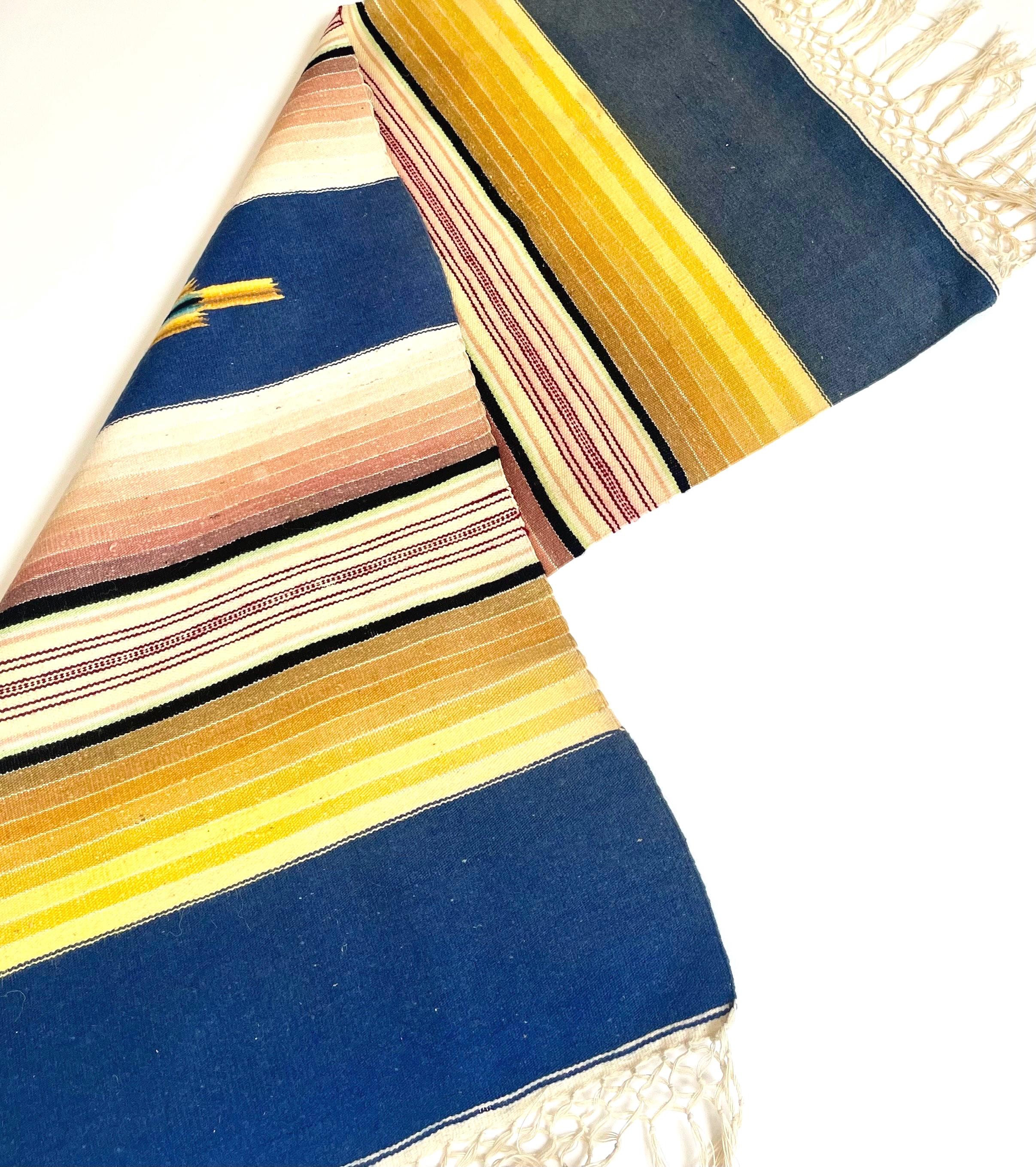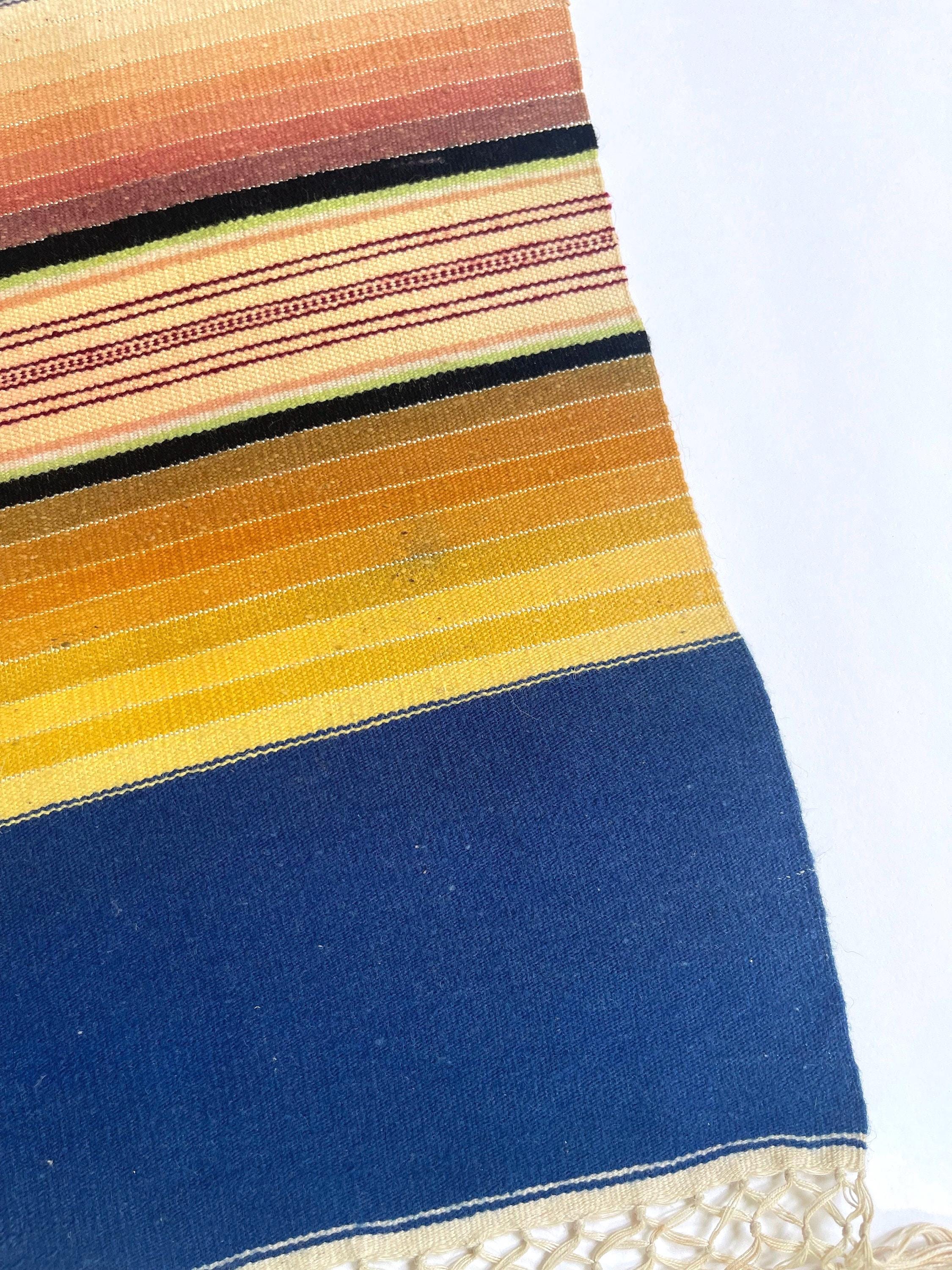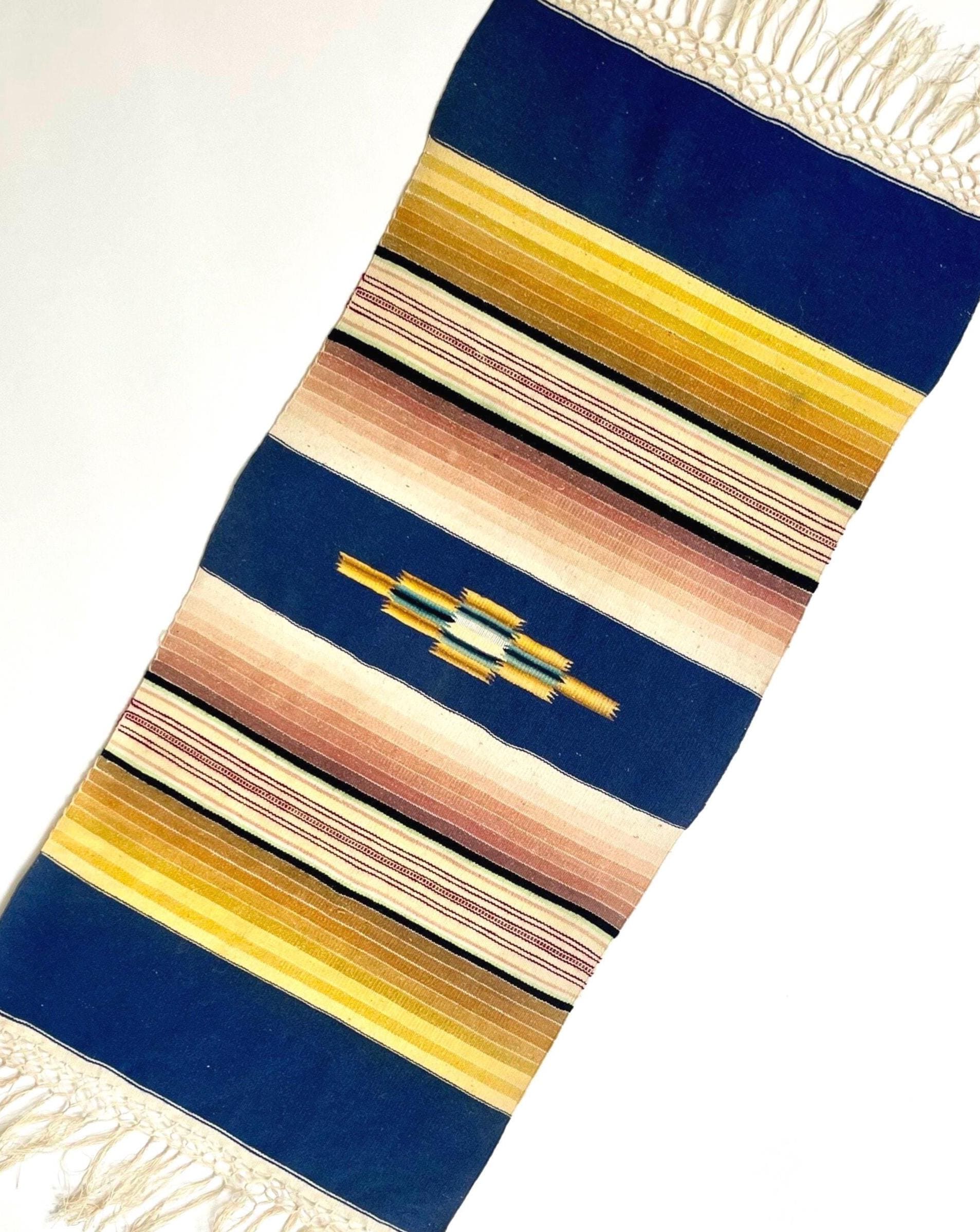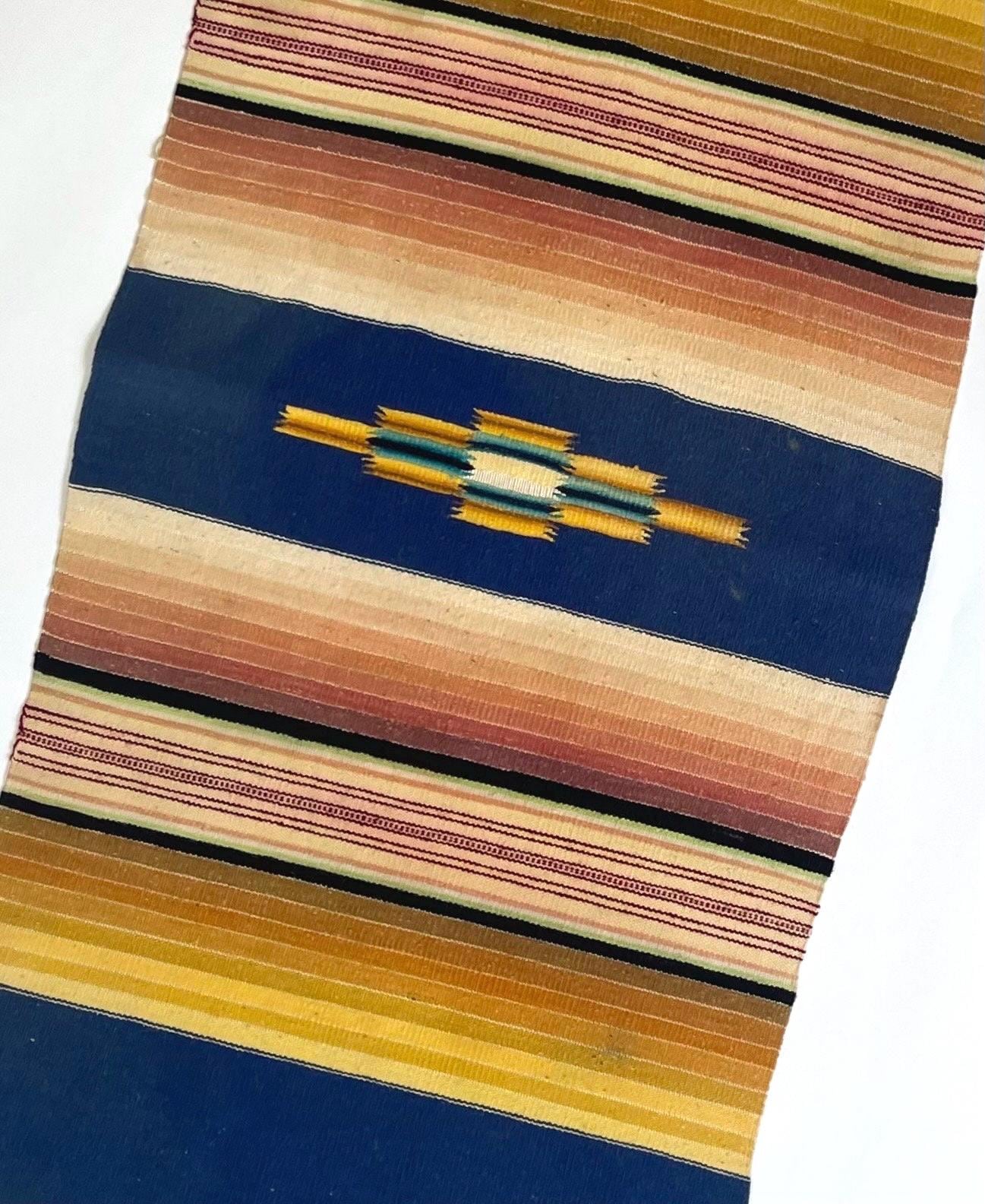 Antique Mexican handwoven wool serape table runner with fringe edges