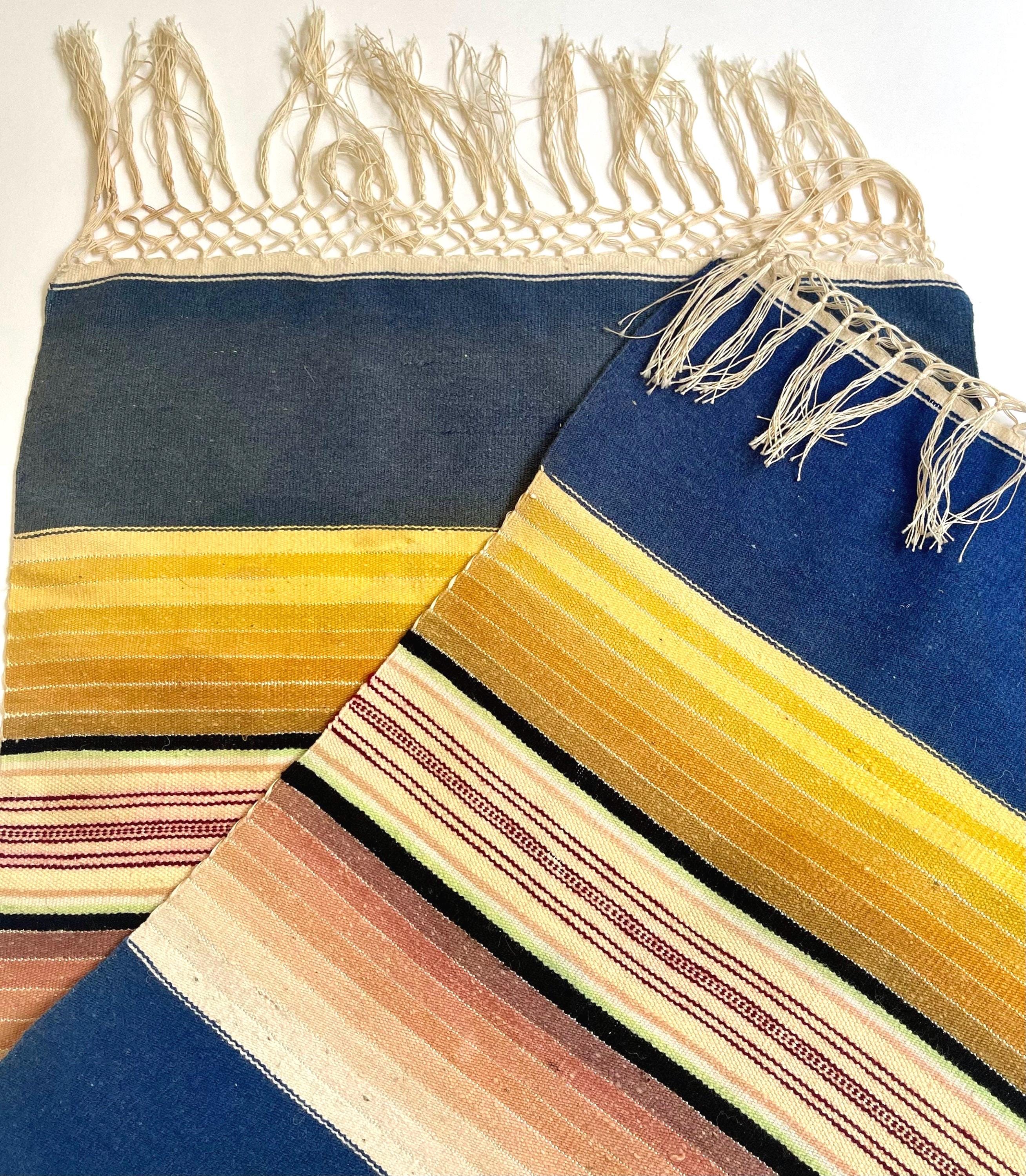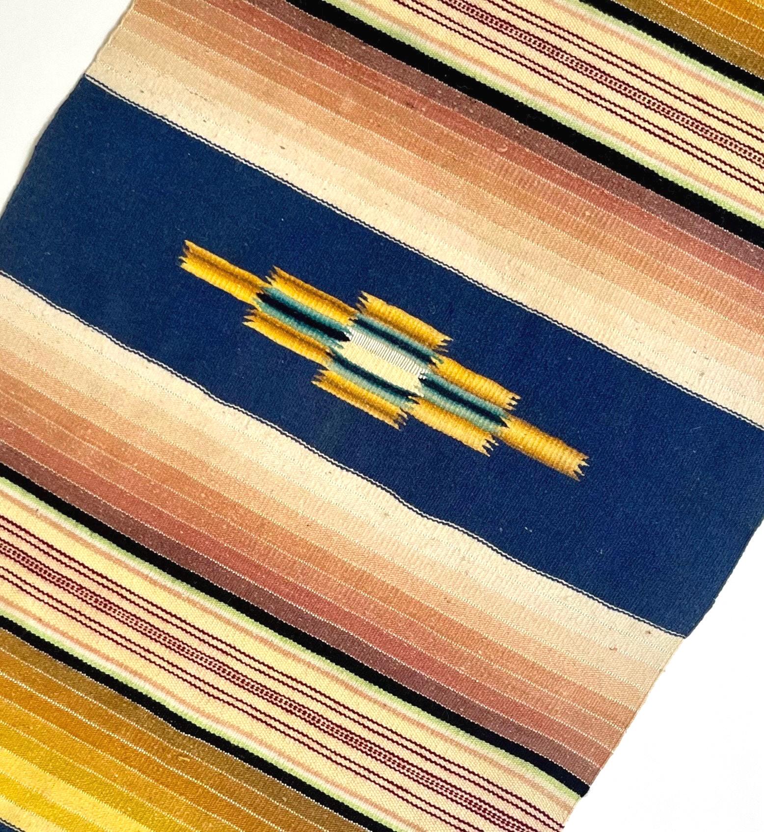 Antique Mexican Handwoven Wool Serape Runner Mat Fringe Ends