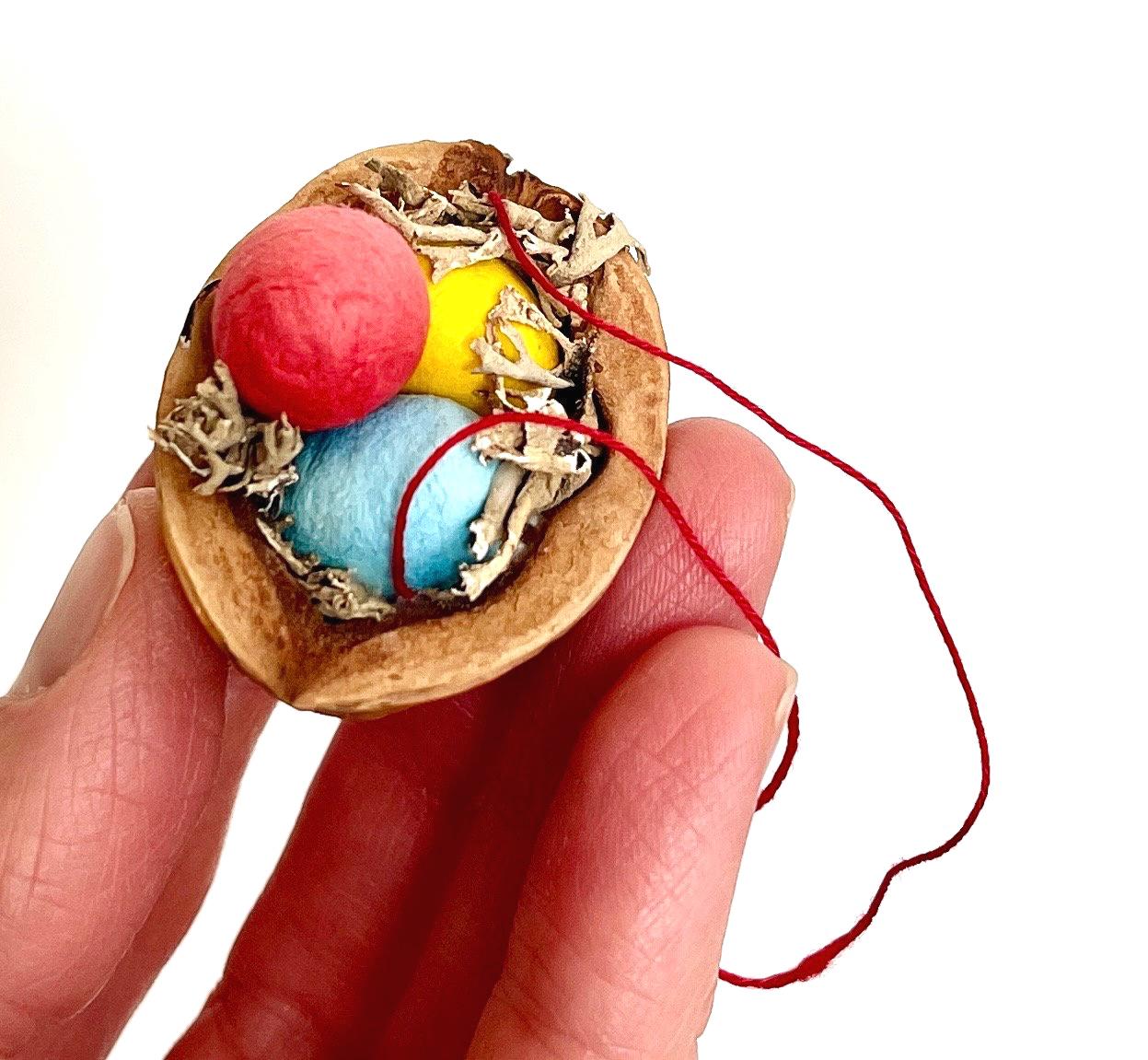 Vintage Italian walnut shell ornament with three painted paper-like eggs