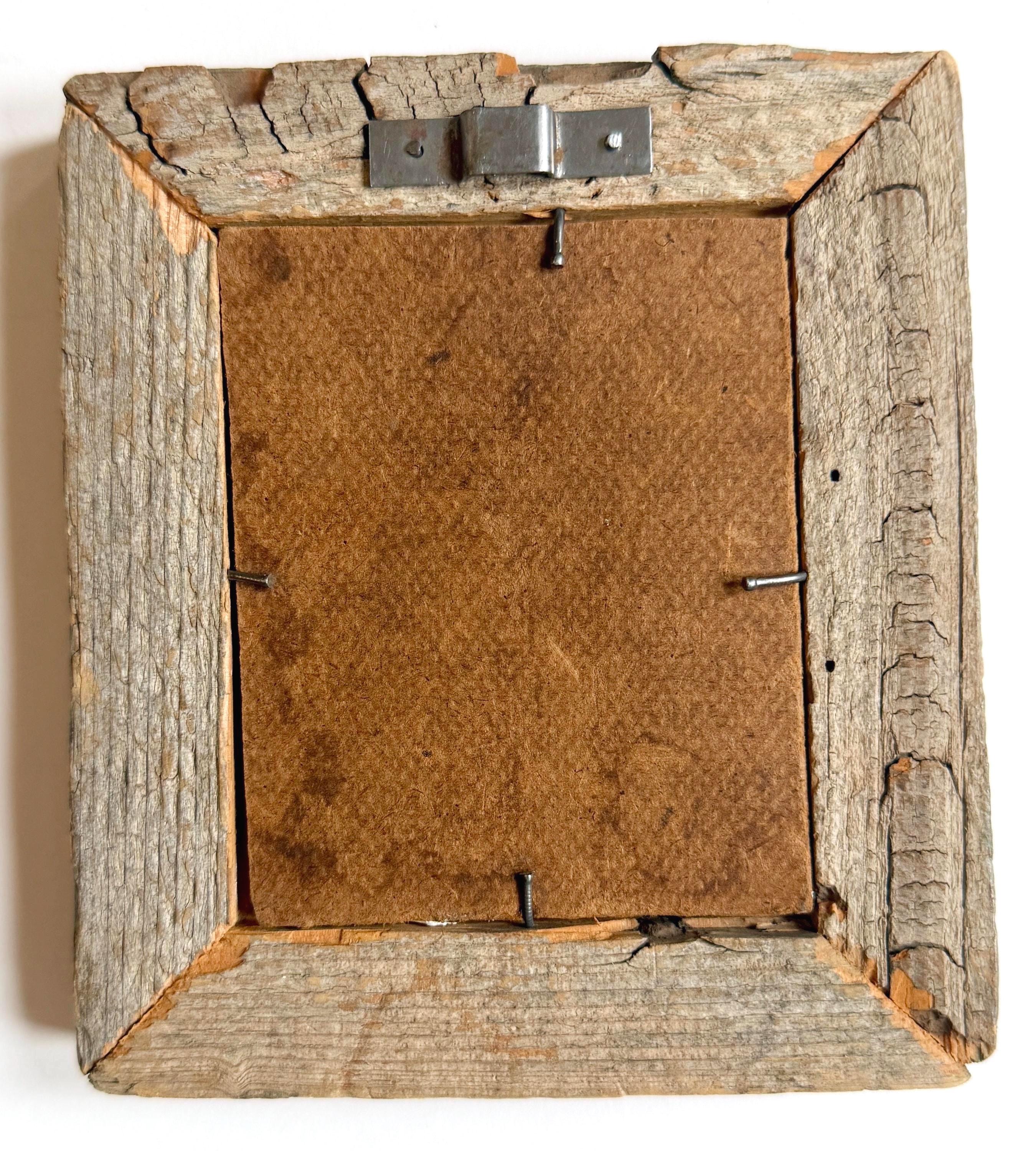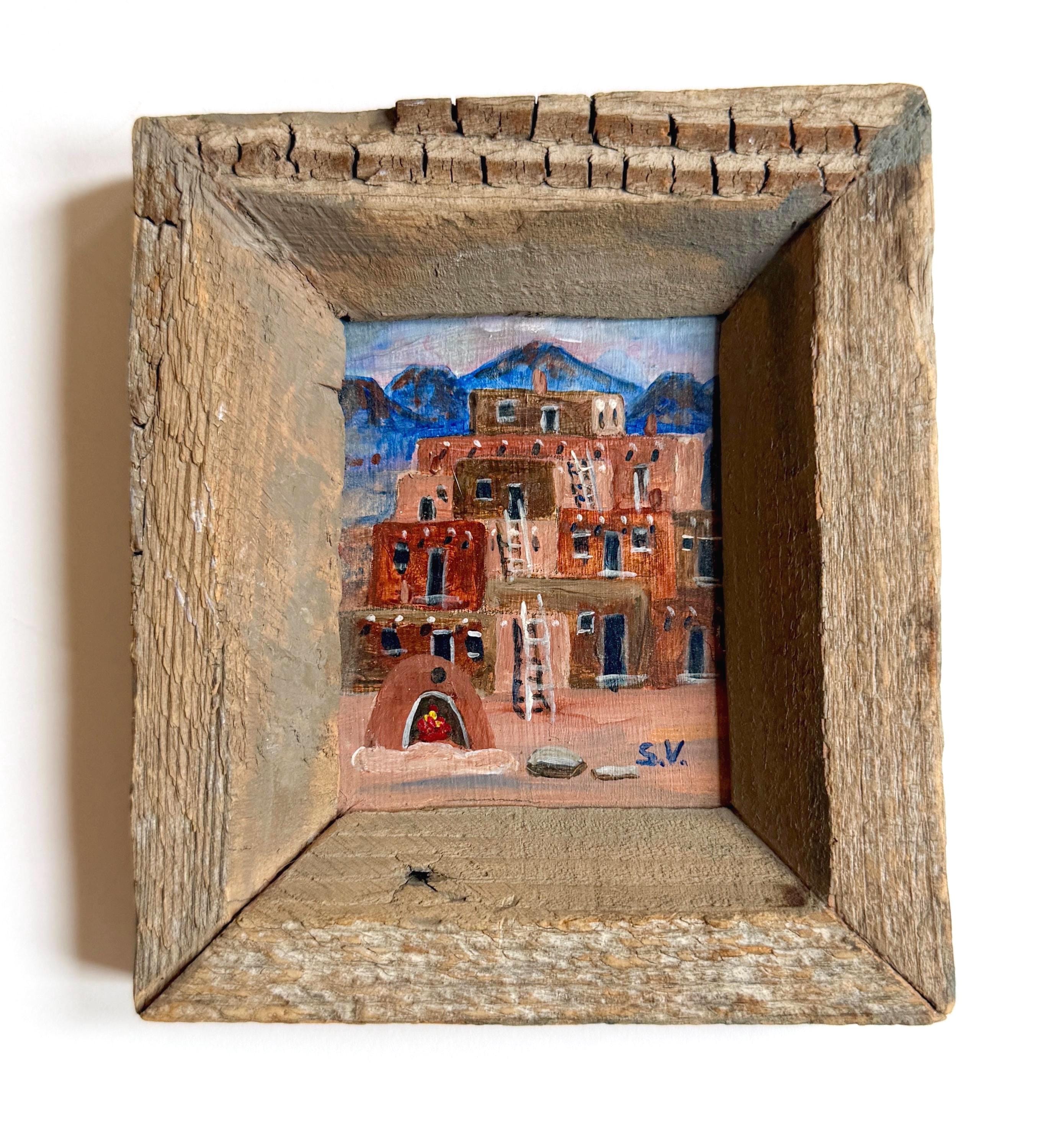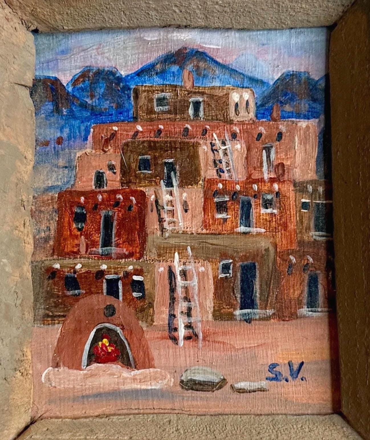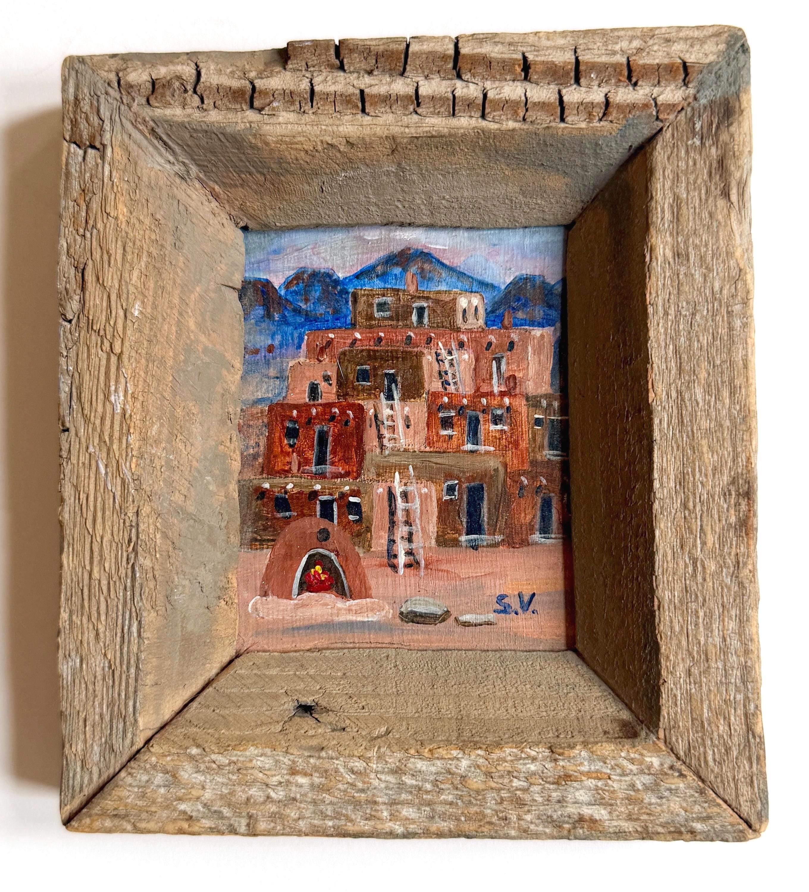 Tiny vintage framed Southwest pueblo painting, likely Taos Pueblo in New Mexico