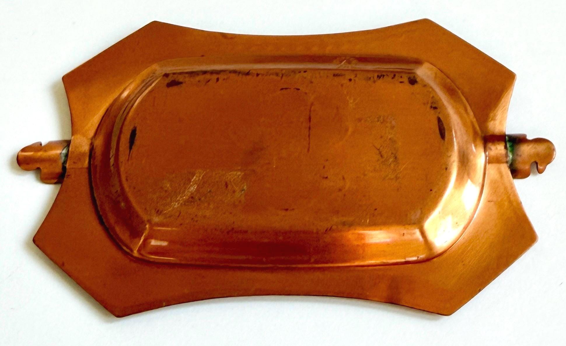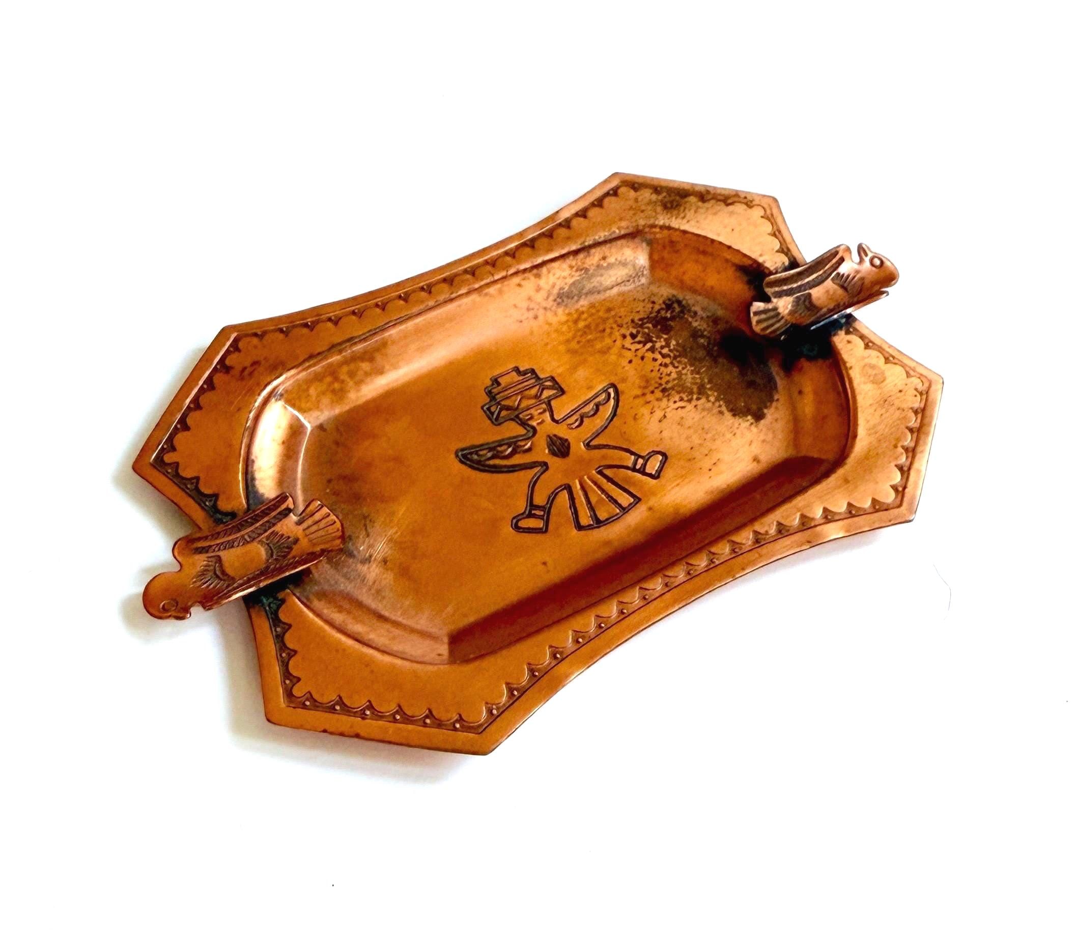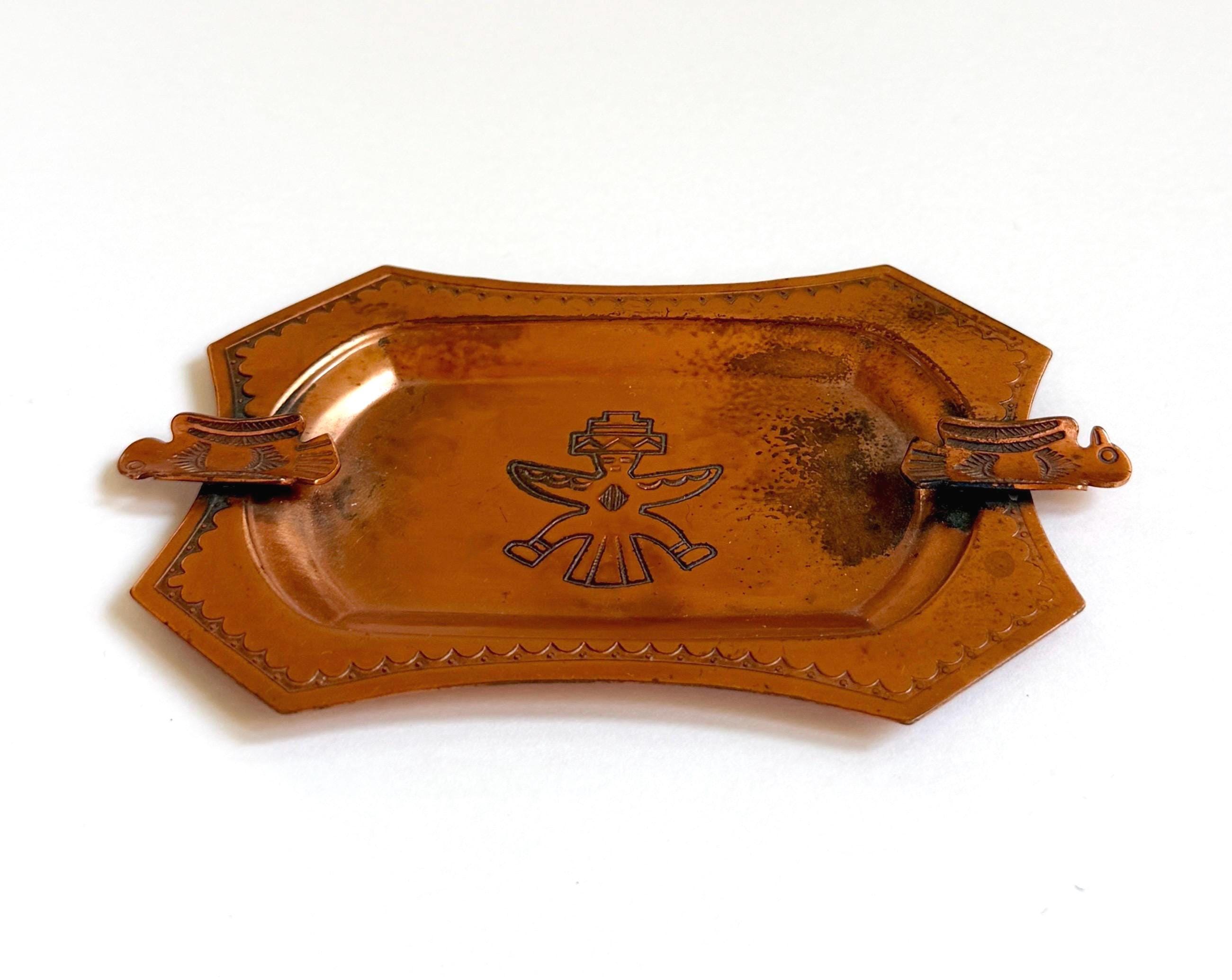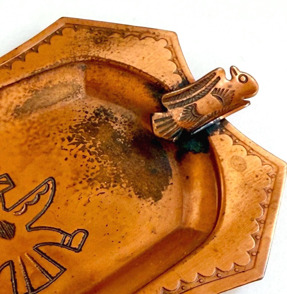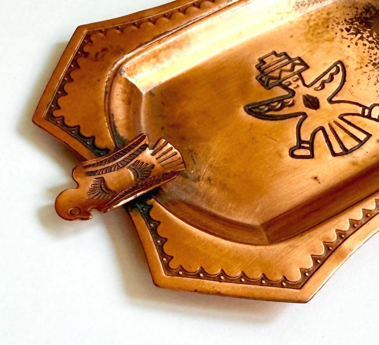 Rare and collectible vintage Fred Harvey era thunderbird copper ashtray made by the old Southwest Bell Trading Post
