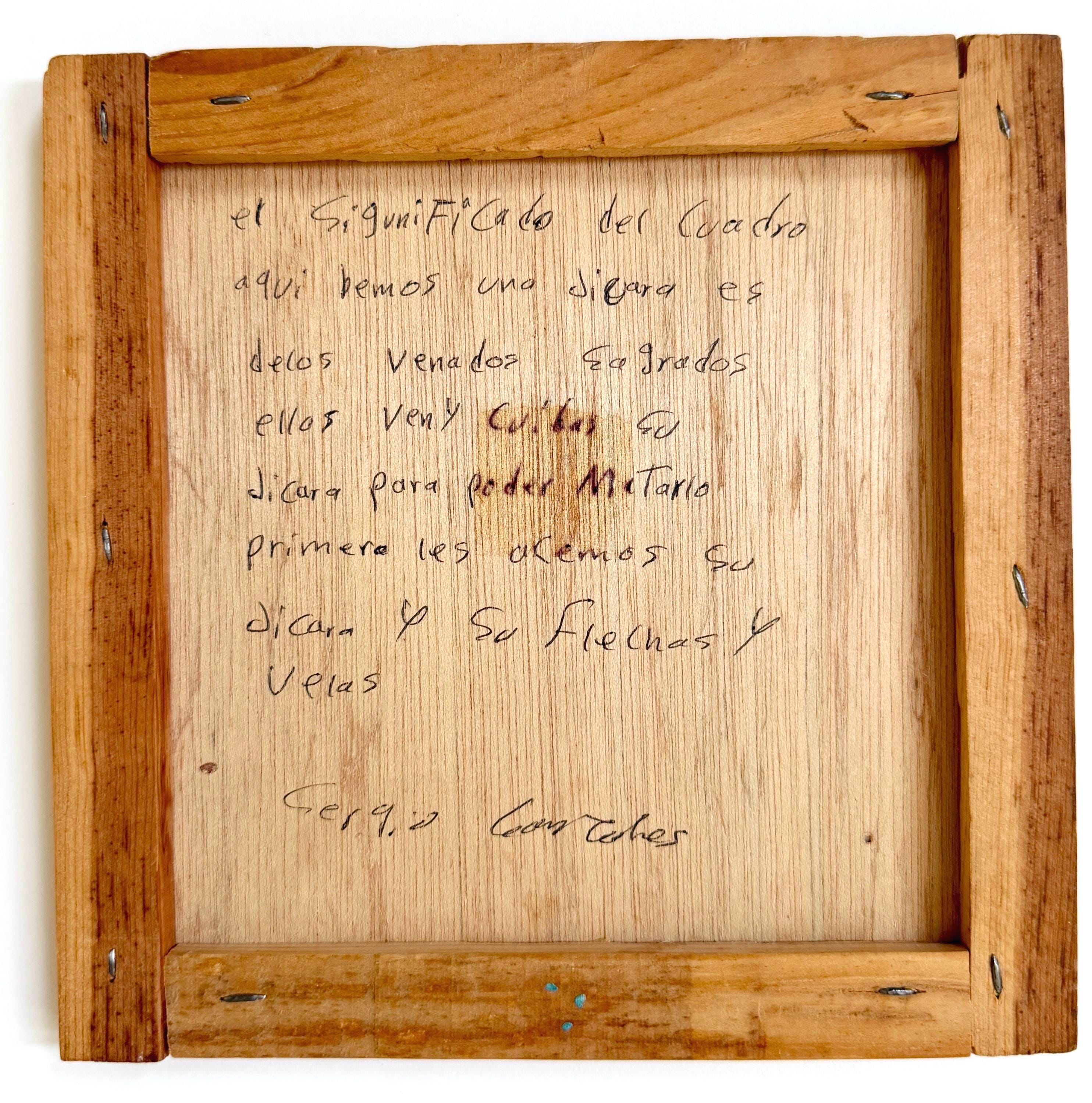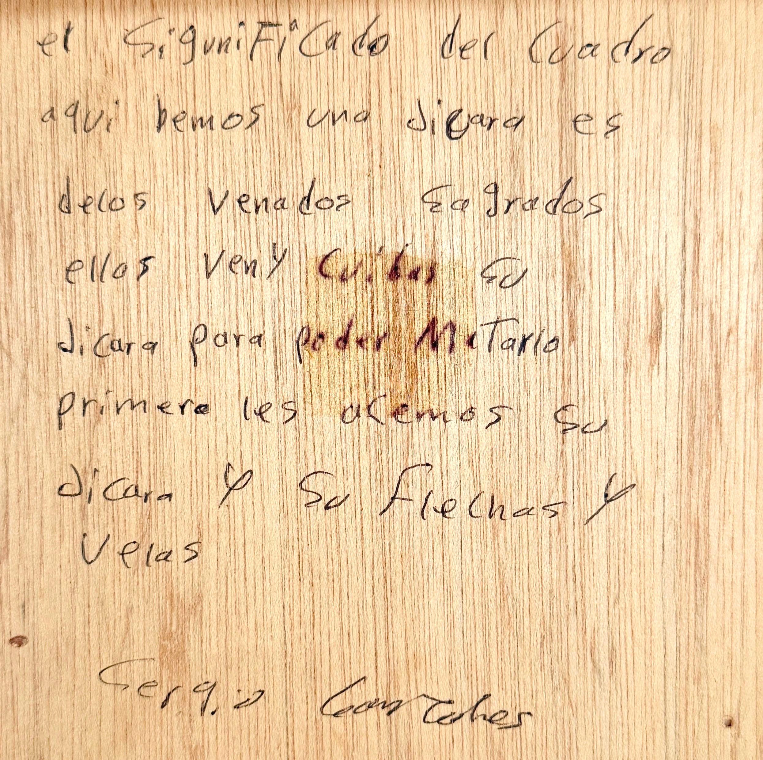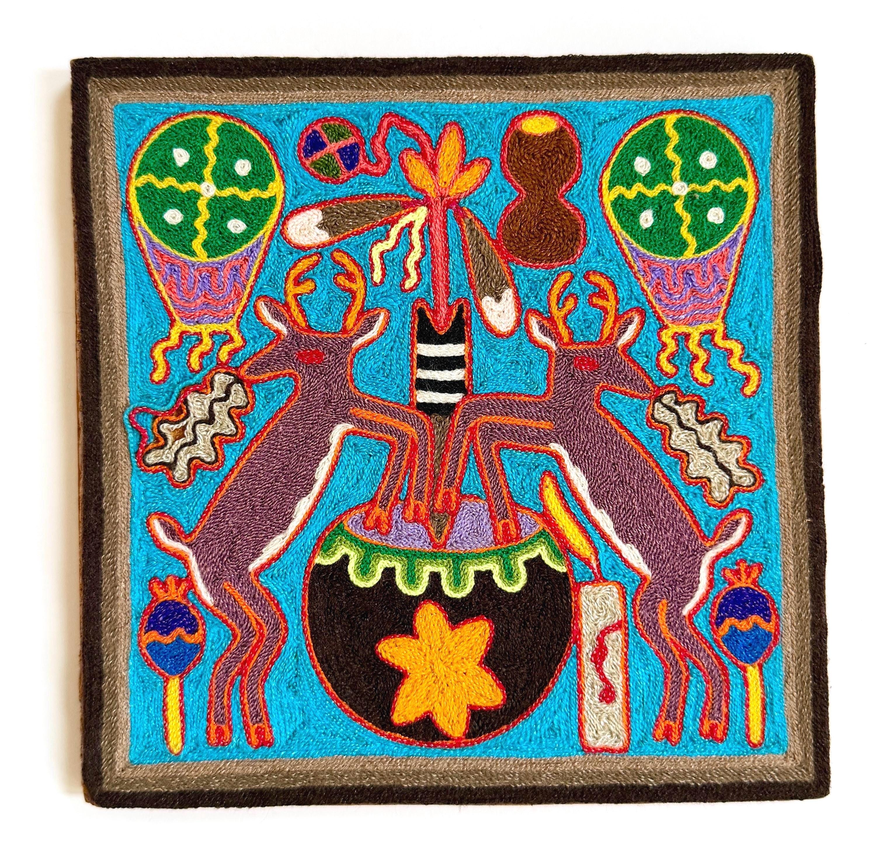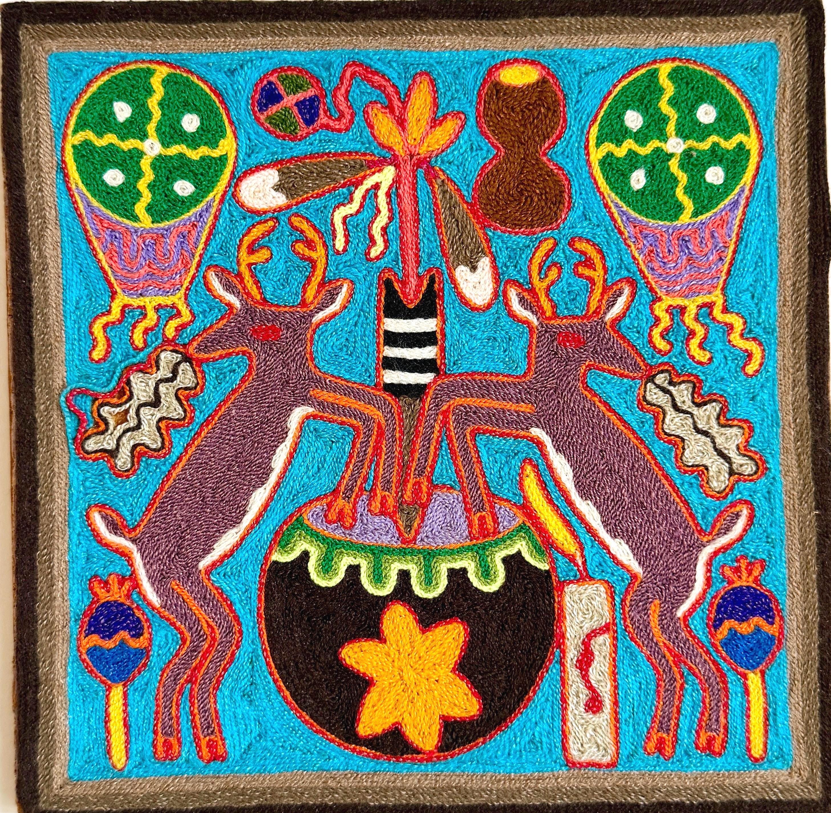 Huichol Nierikas yarn paintings are made by pressing yarn onto a board applied with natural tree resin and beeswax. Images often depict natural subject matters that portray the Huichol belief that people are connected to nature and all living beings