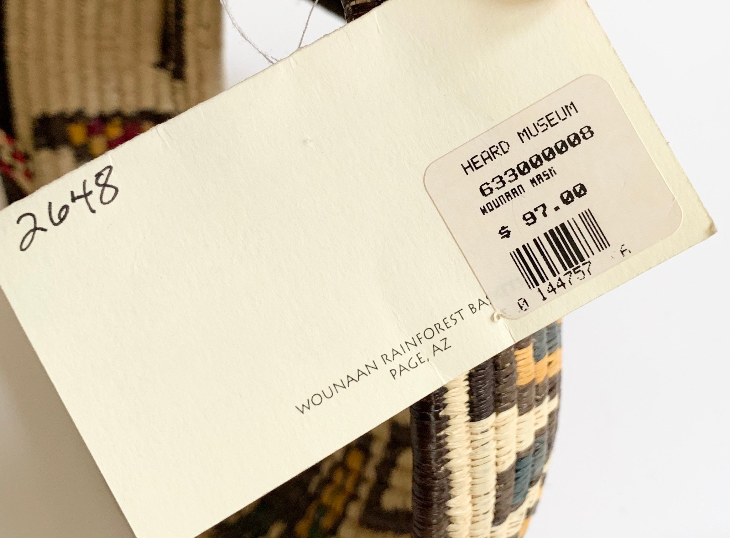 Rare vintage handwoven Embera Wounaan mask with original Heard Museum $98 price tag