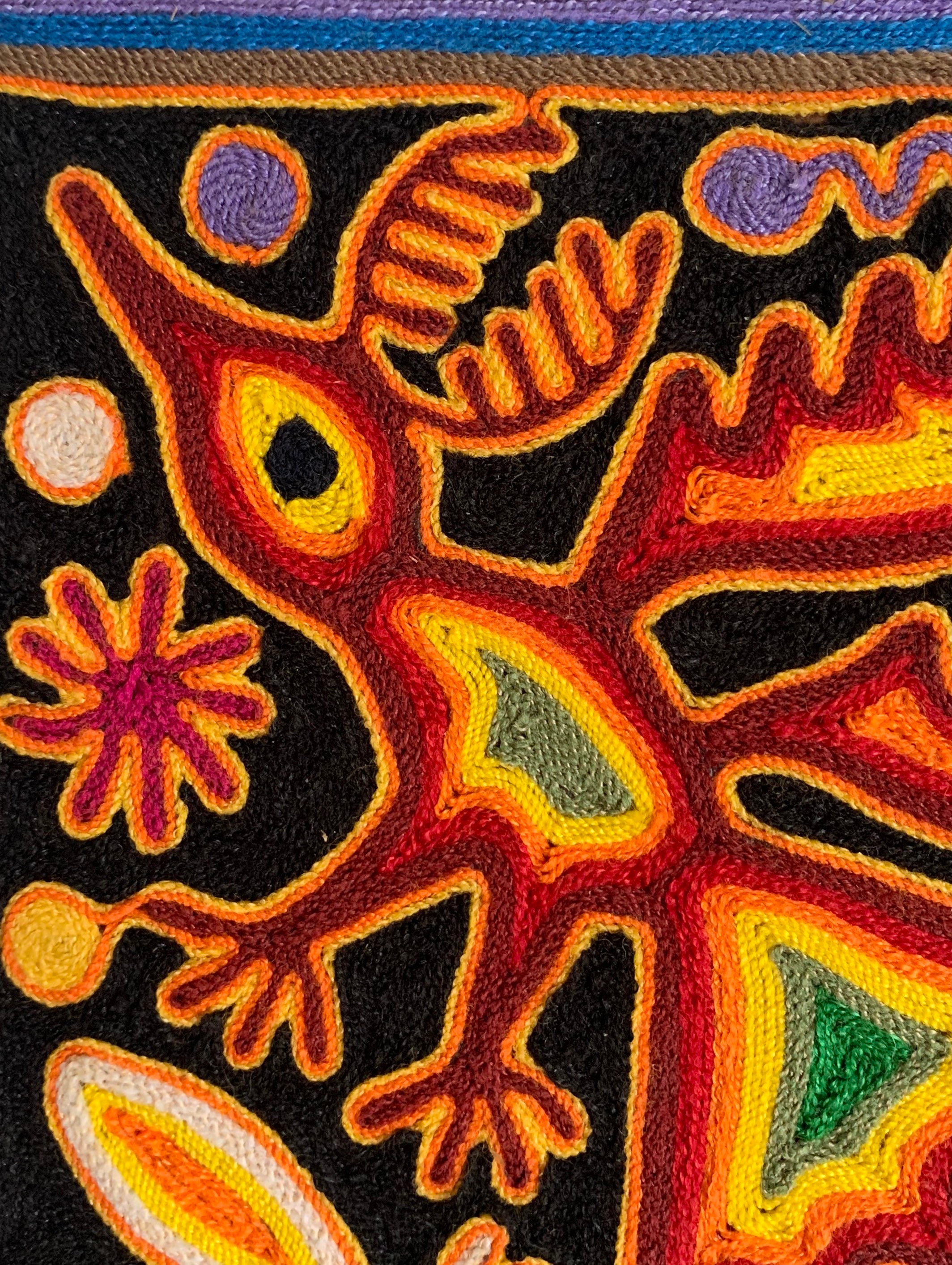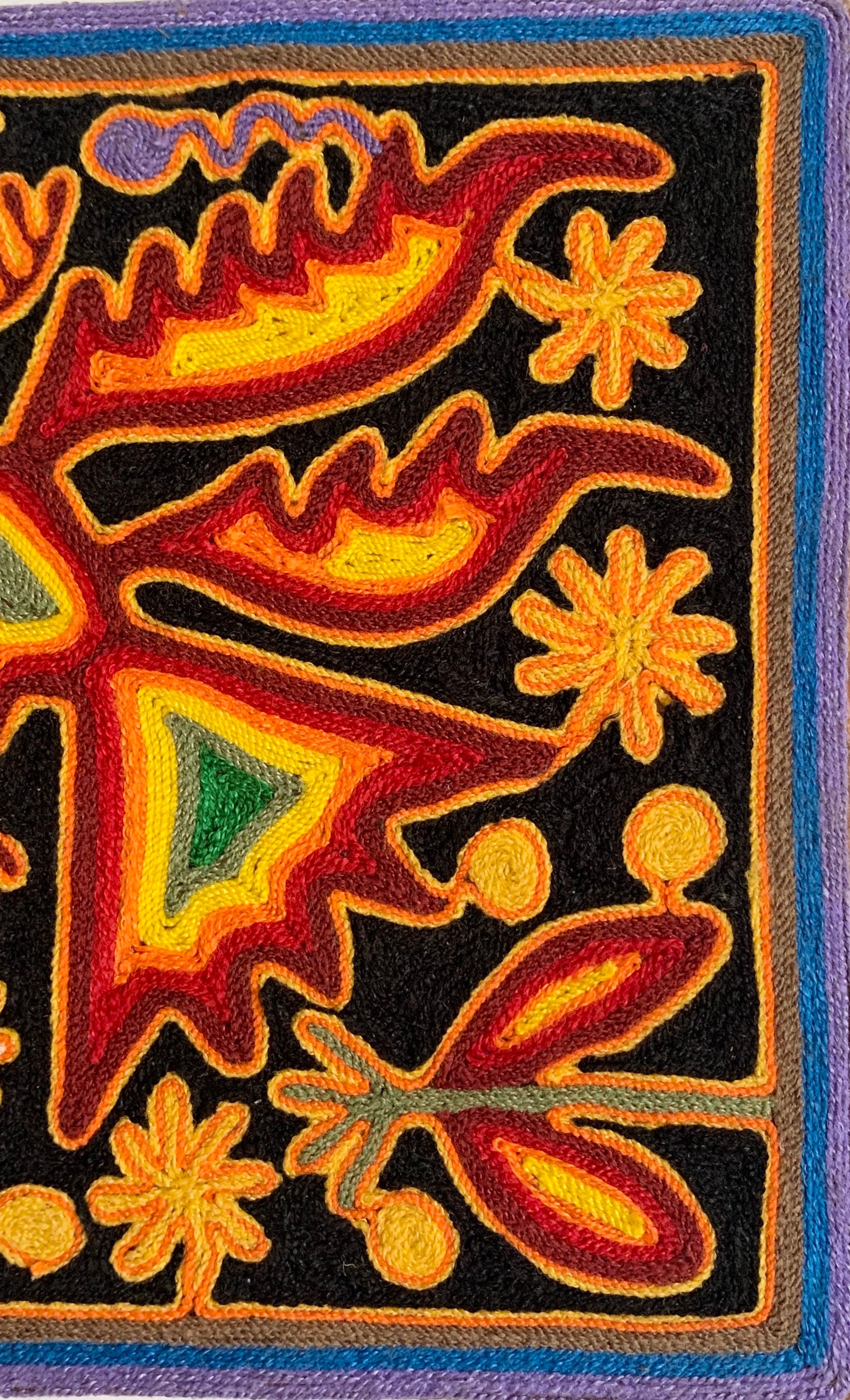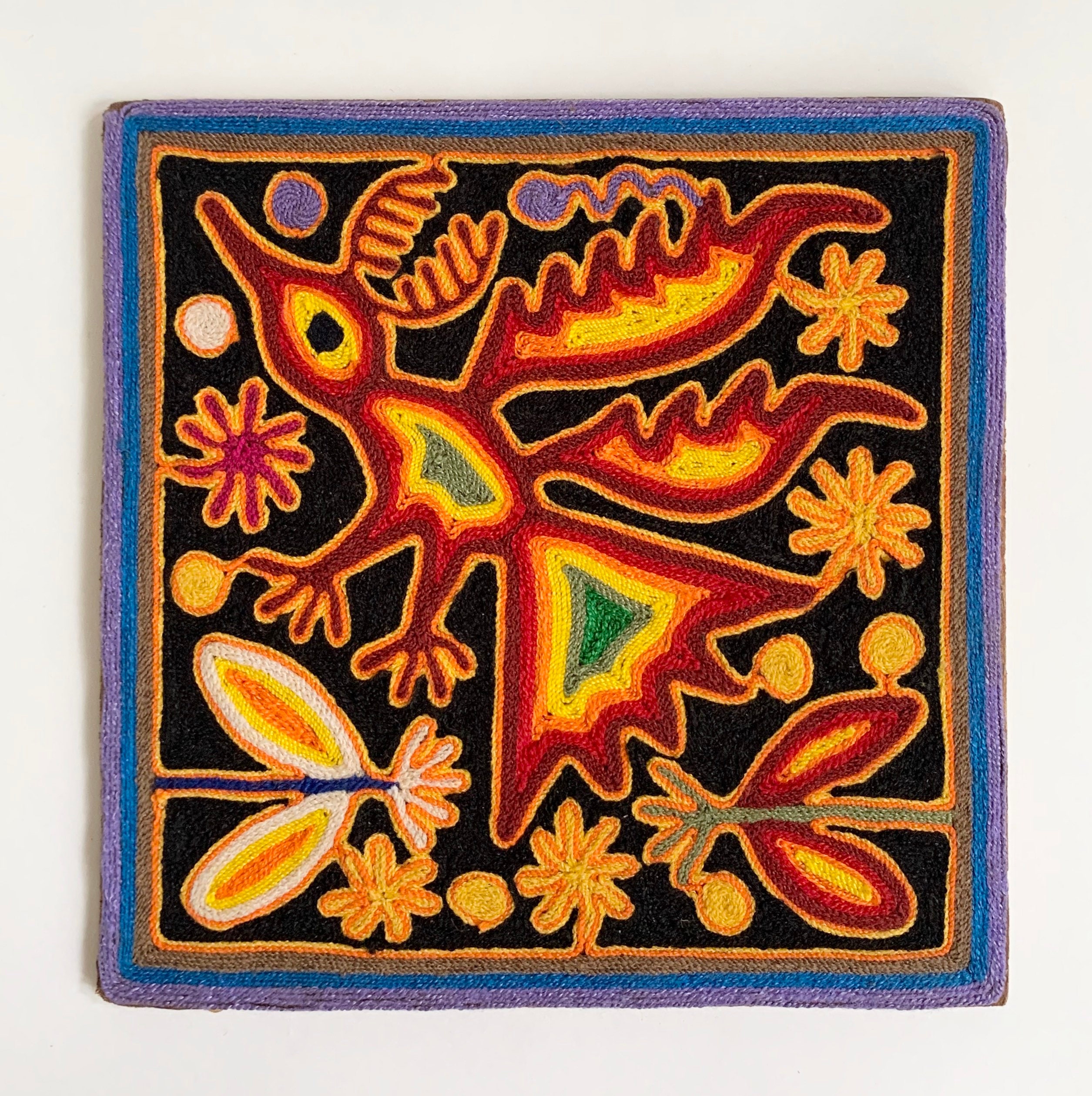 Huichol Nierikas yarn paintings are made by pressing yarn onto a board applied with natural tree resin and beeswax. Images often depict natural subject matters that portray the Huichol belief that people are connected to nature and all living beings