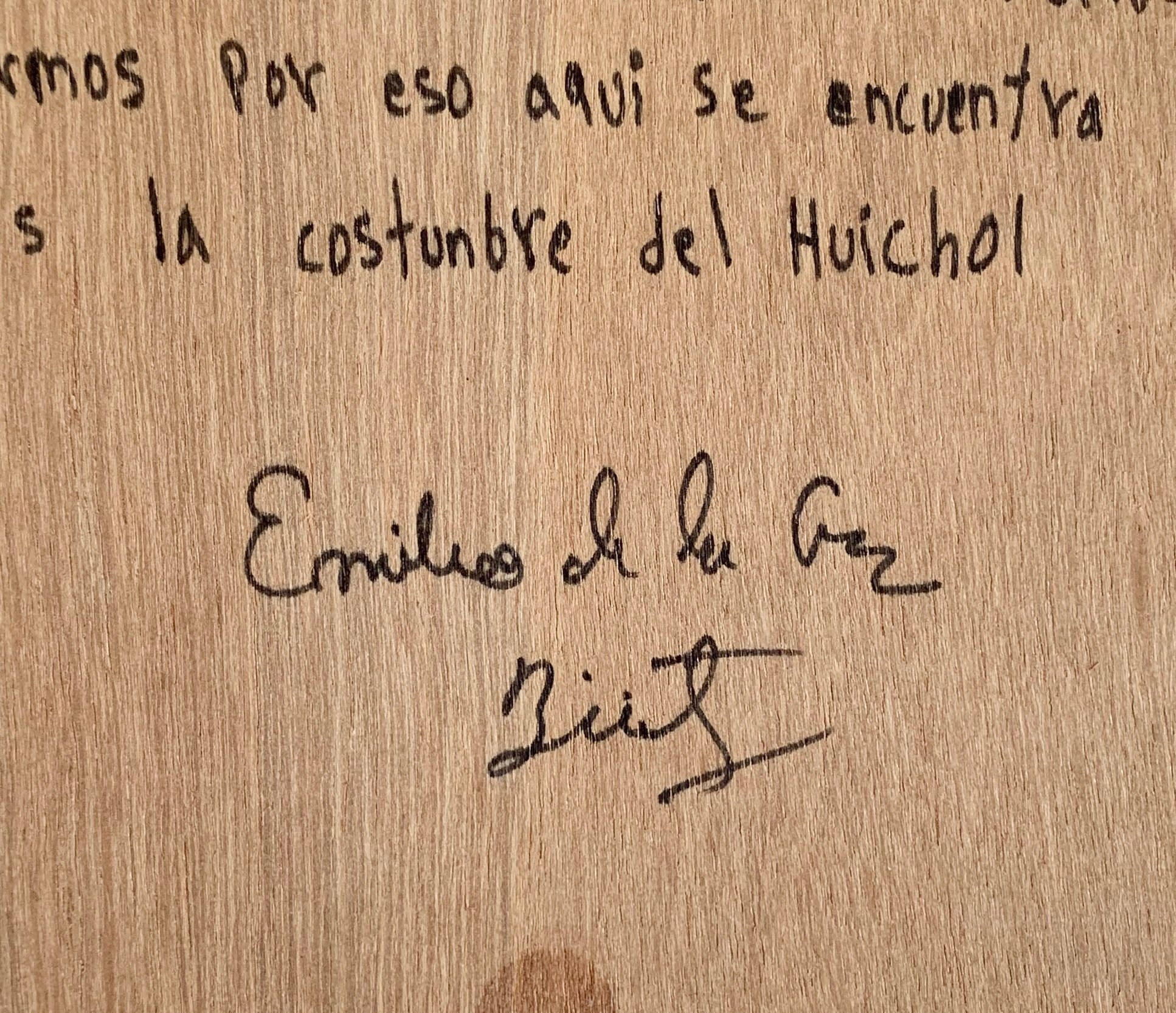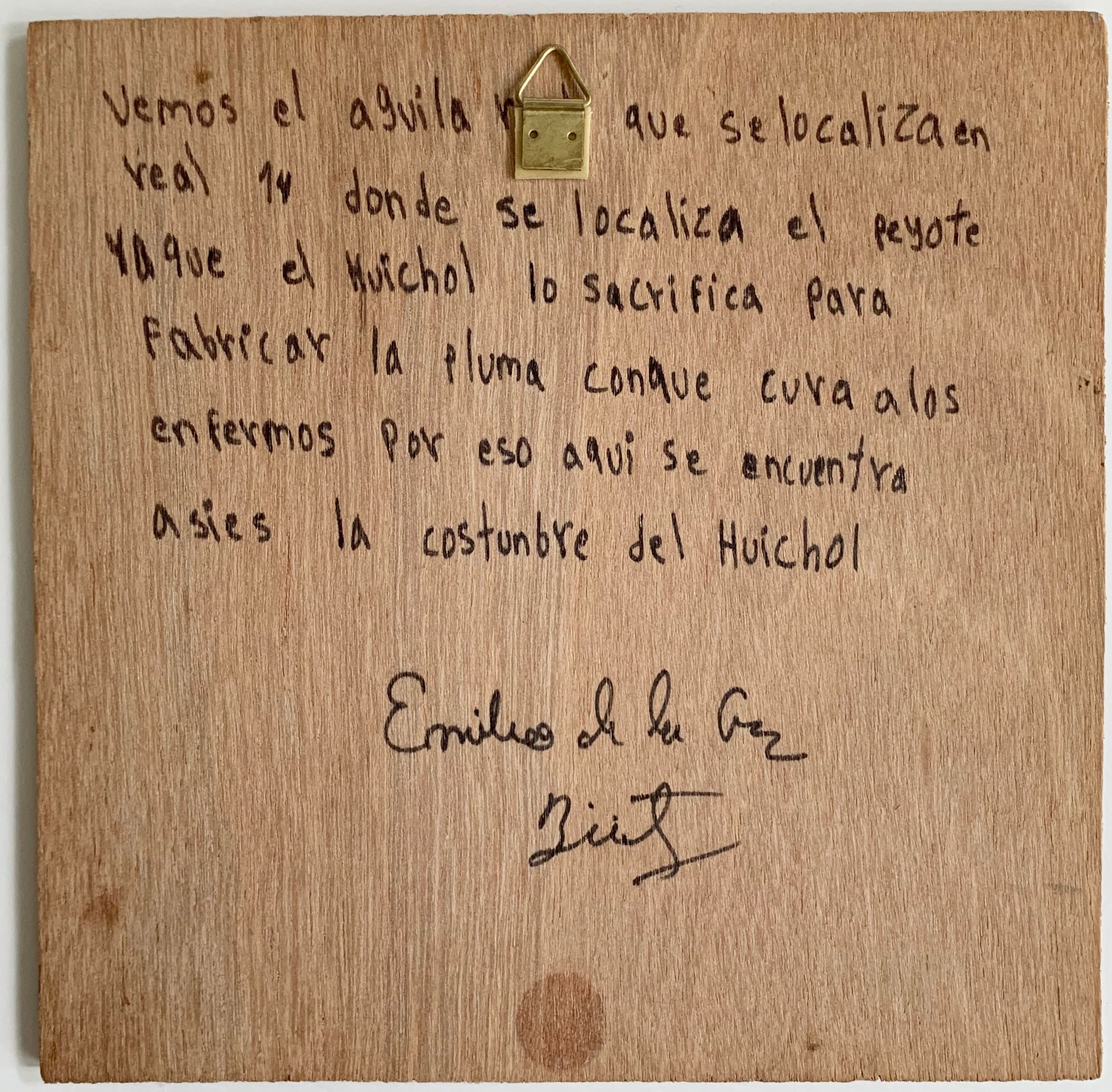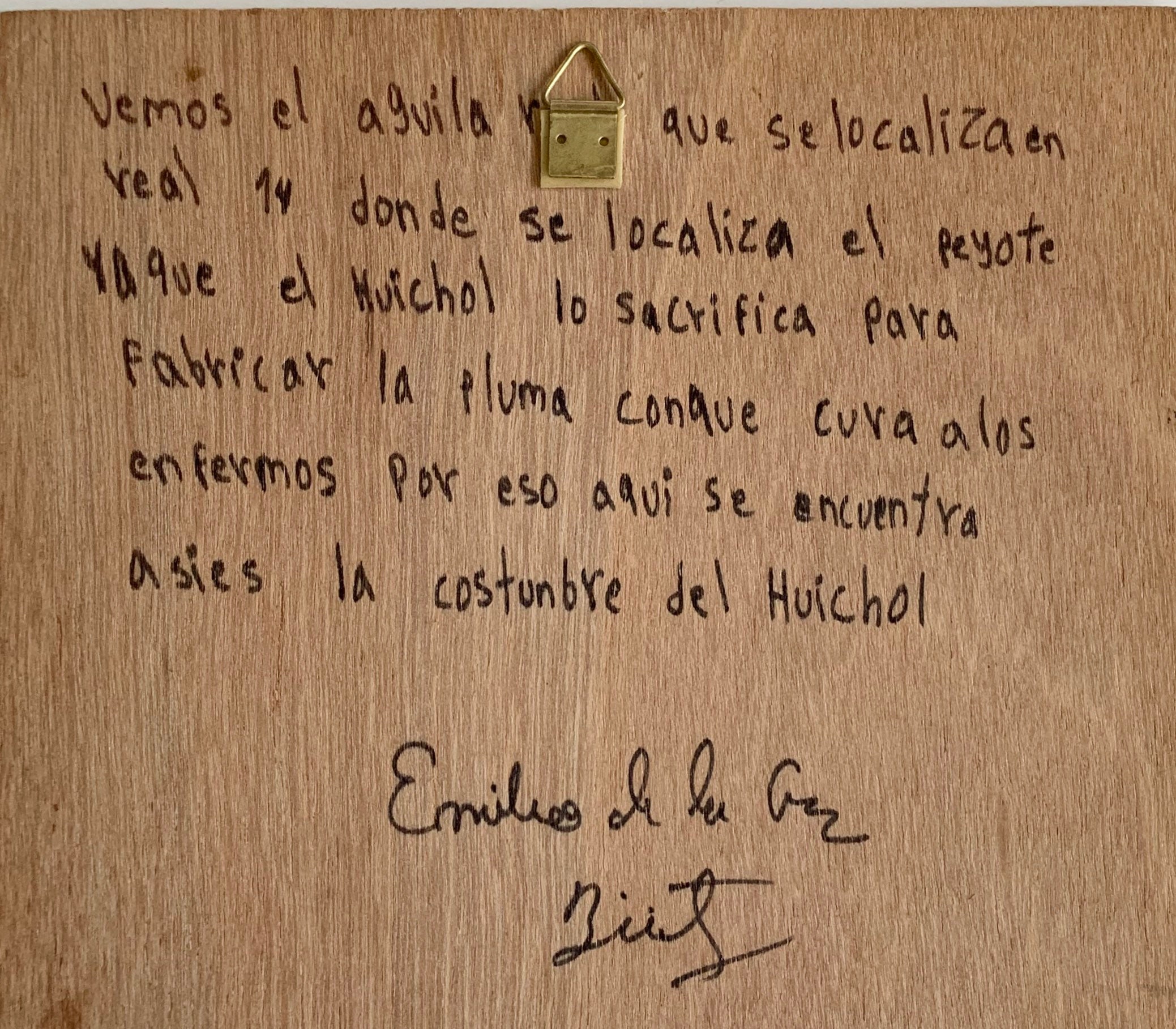 Huichol Nierikas yarn paintings are made by pressing yarn onto a board applied with natural tree resin and beeswax. Images often depict natural subject matters that portray the Huichol belief that people are connected to nature and all living beings