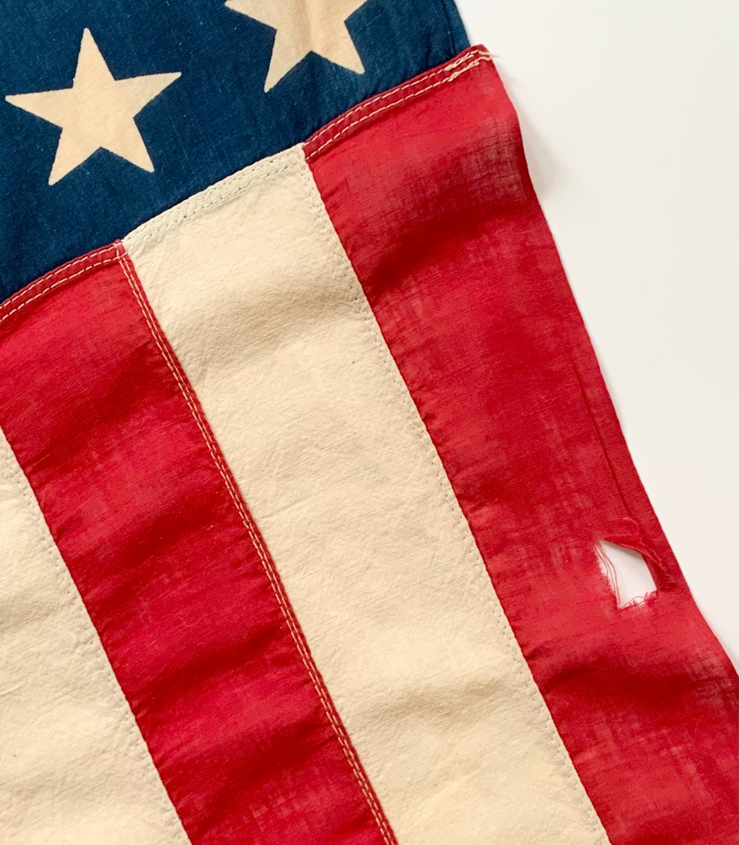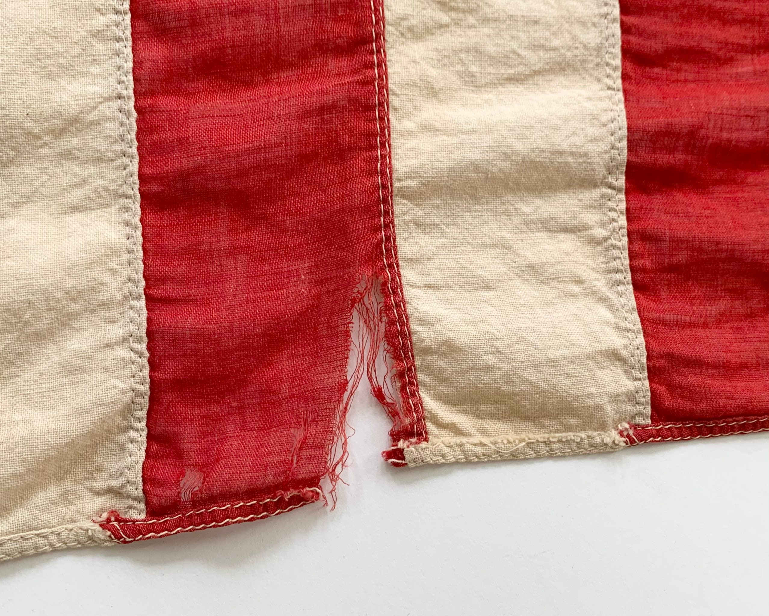 Good vintage condition with overall fading, discoloration, a few tears and areas of thinning in fabric due to age and wear. There is also an area of "imperfection" at the bottom left of the stars where the seams didn't line up in manufacturing. That said, that helps me date it to the earlier side - 1949 or early 1950's! See last photo for close up of this area.