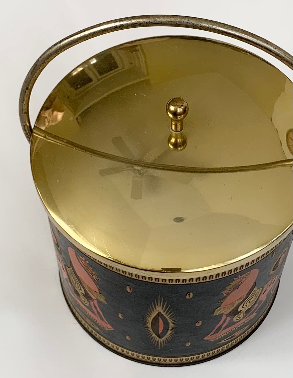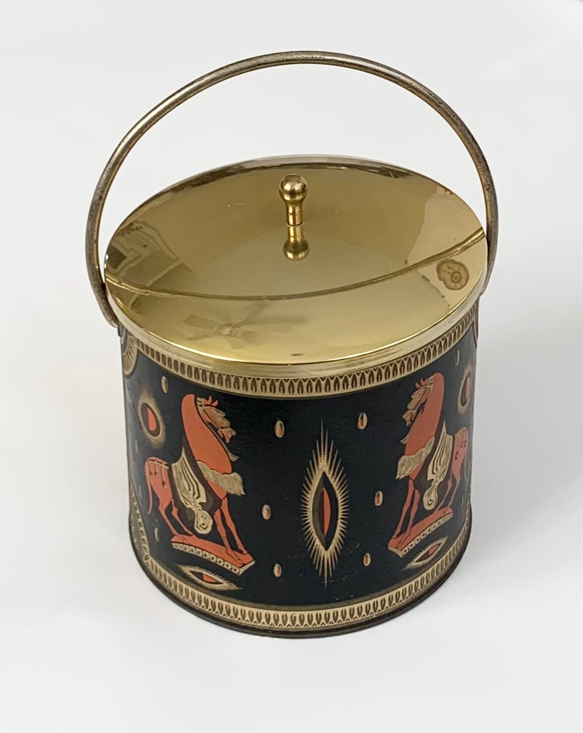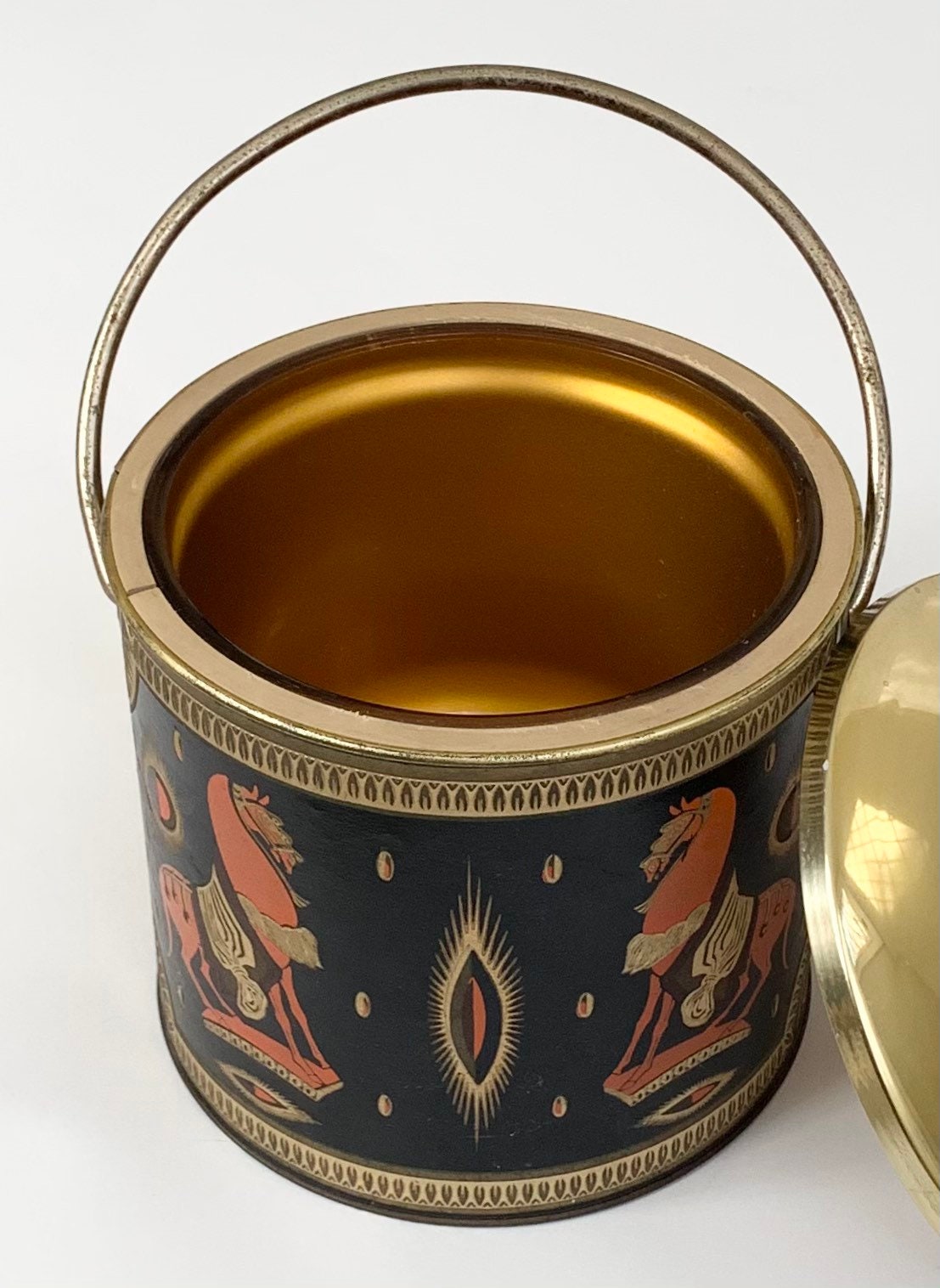 Fred Press Ice Bucket Mid Century Vintage 50s 60s MCM Barware Ice Cooler with Lid Gold Tone Metal Chinese Trojan Horse Collectible Designer