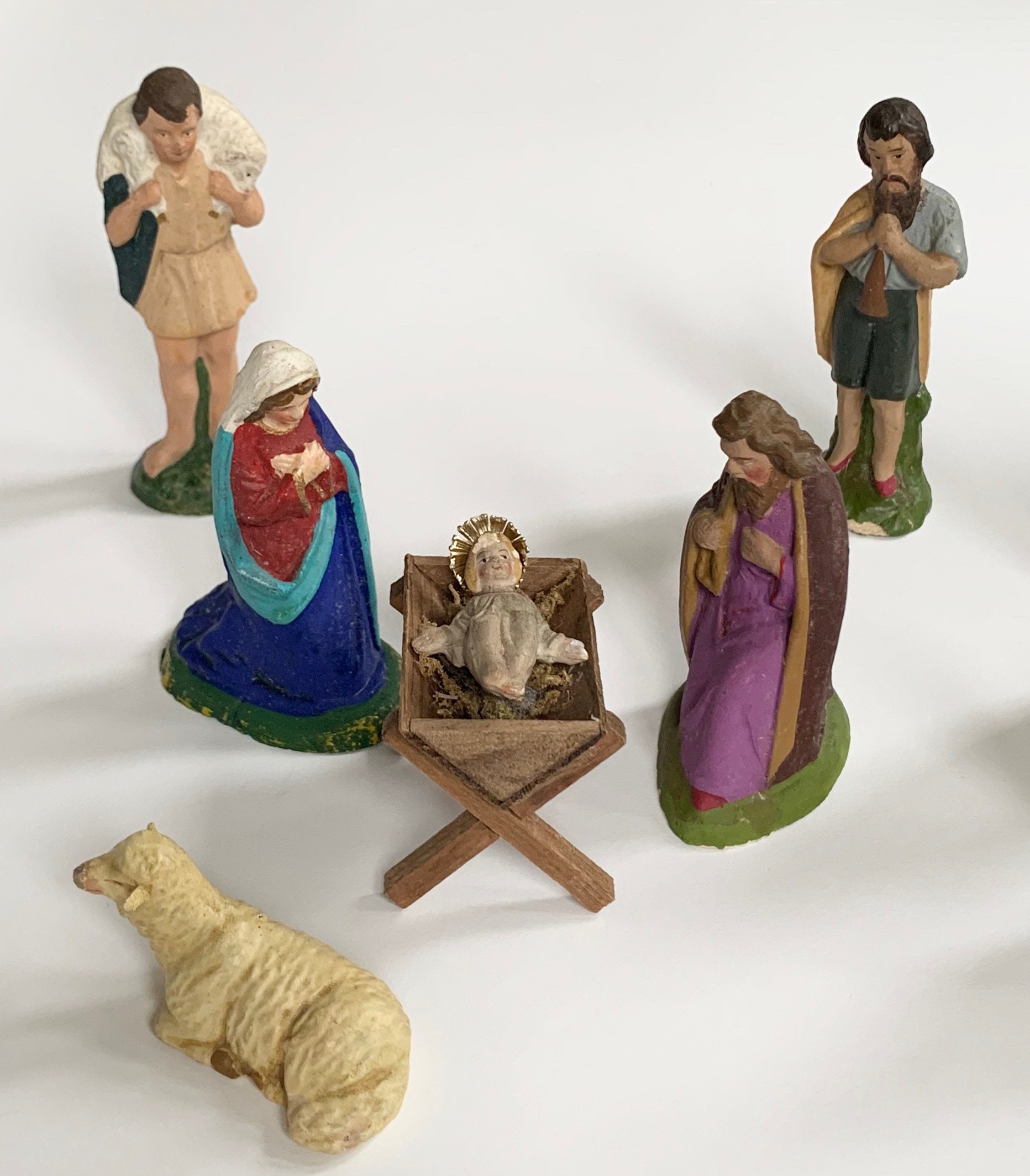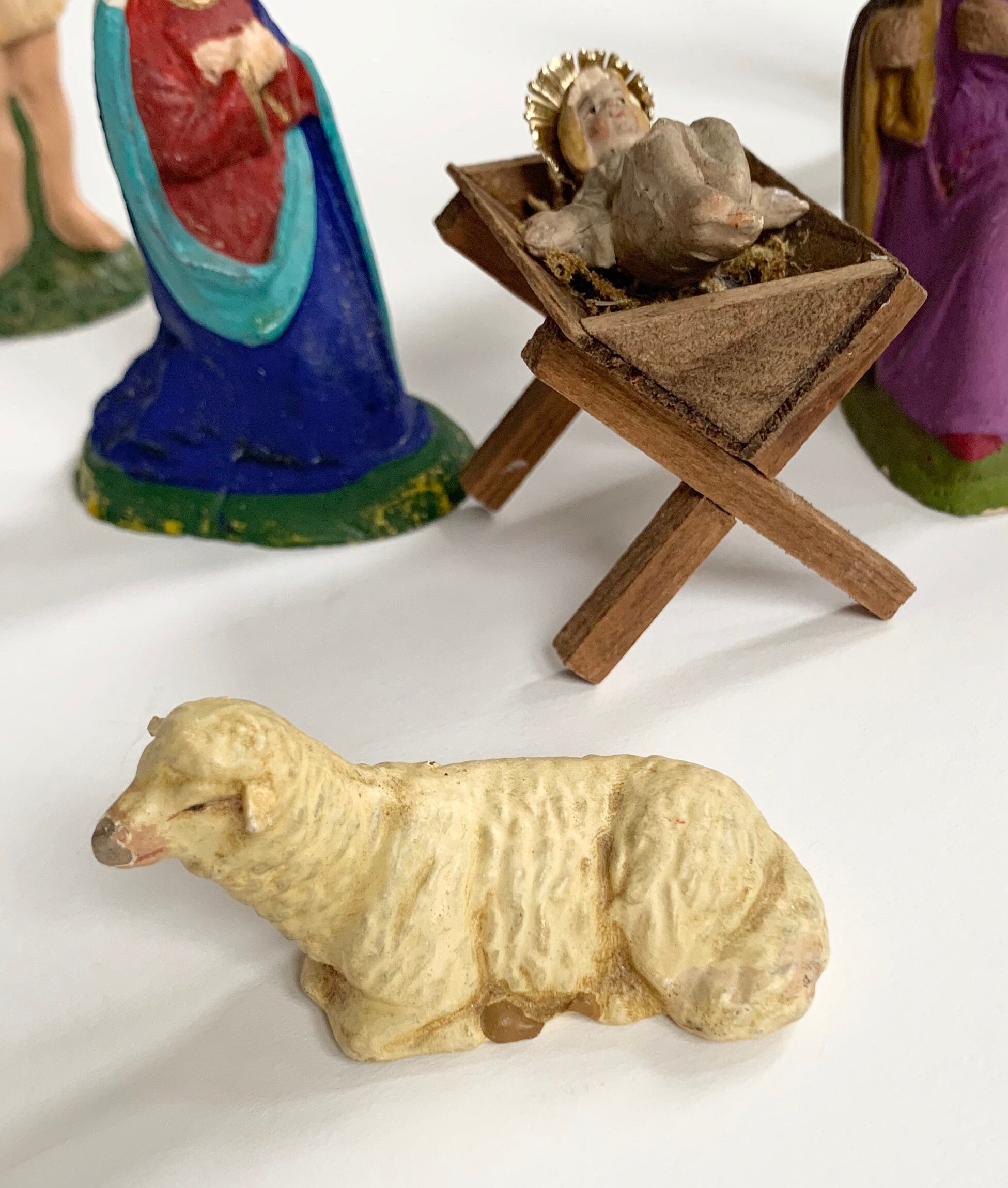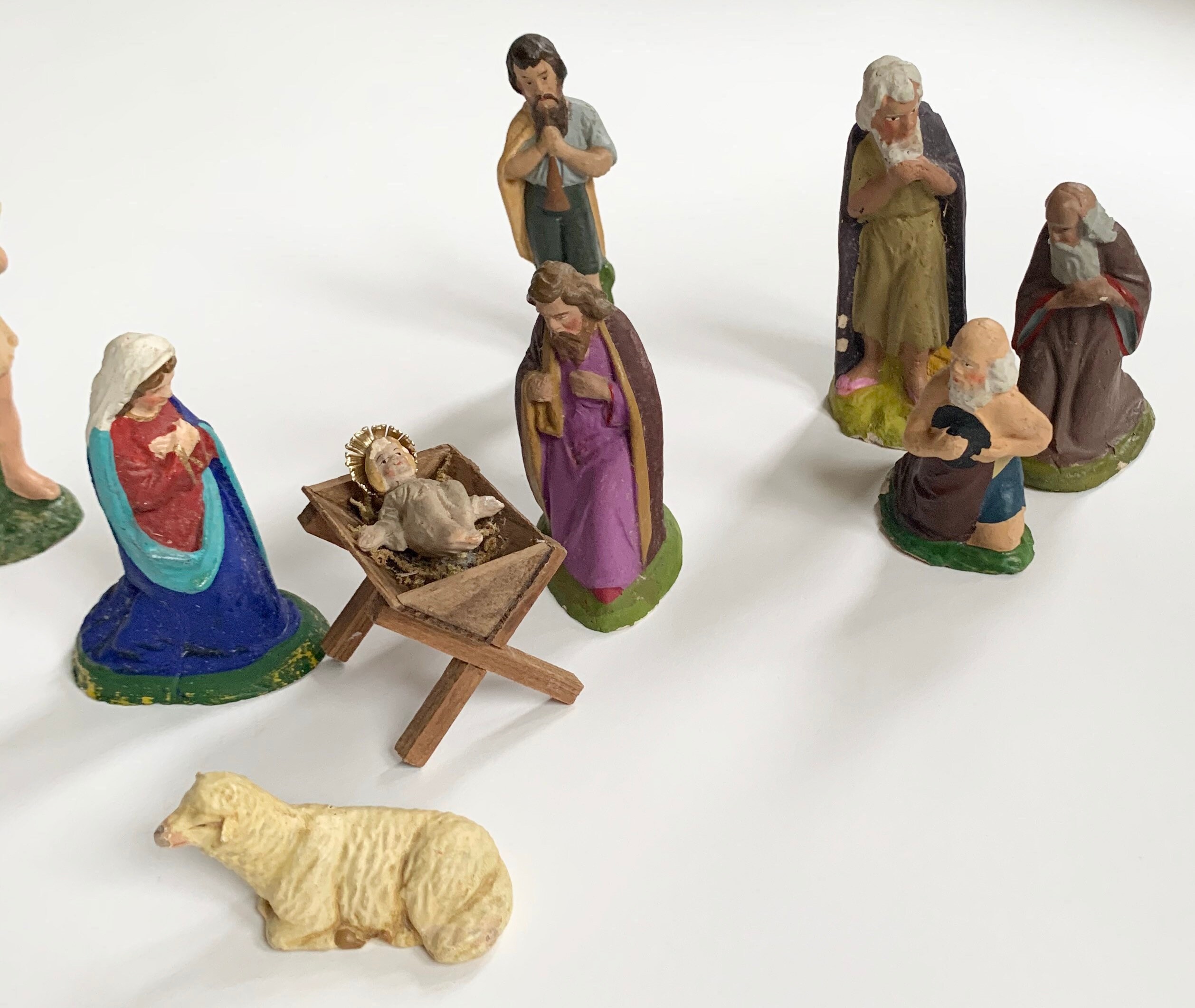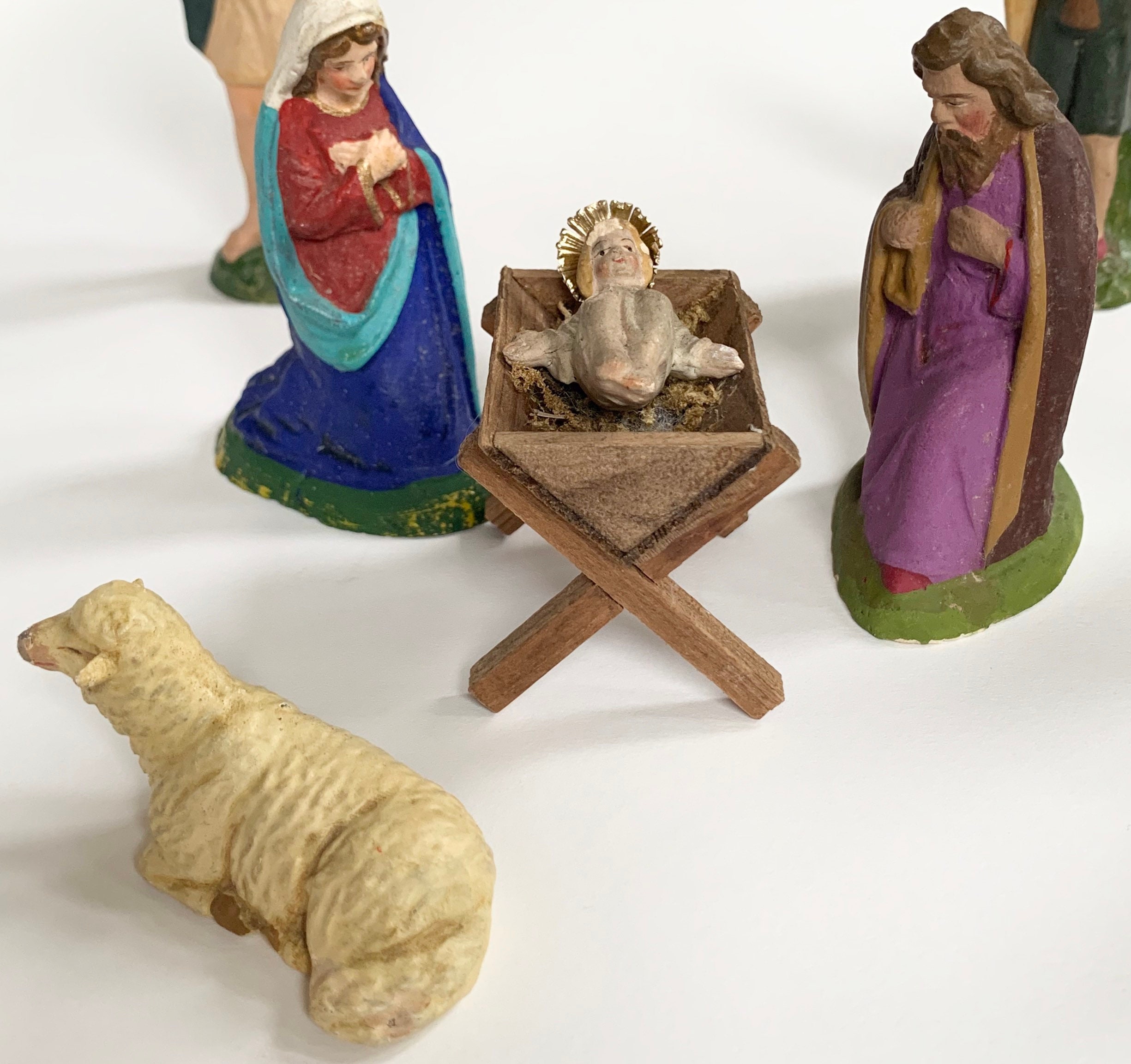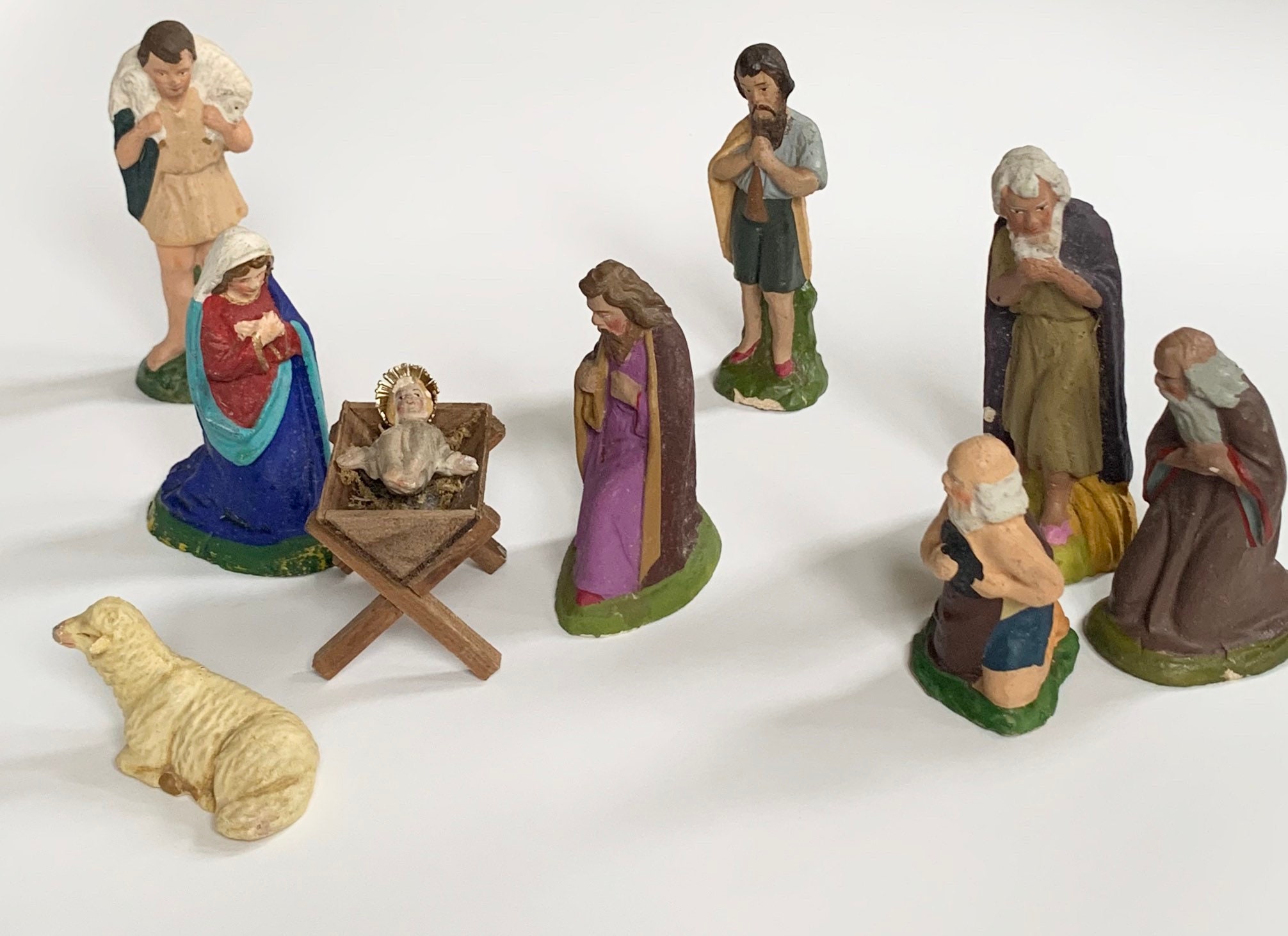 German Plaster Nativity Set of 10 Pieces Vintage Antique Religious Holiday Christmas Decor Manger Scene Baby Jesus Mary Joseph Lamb